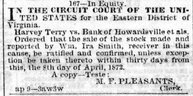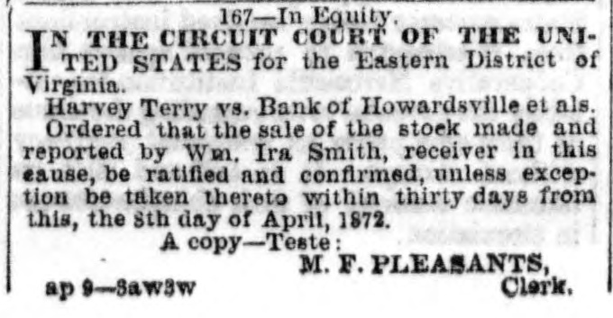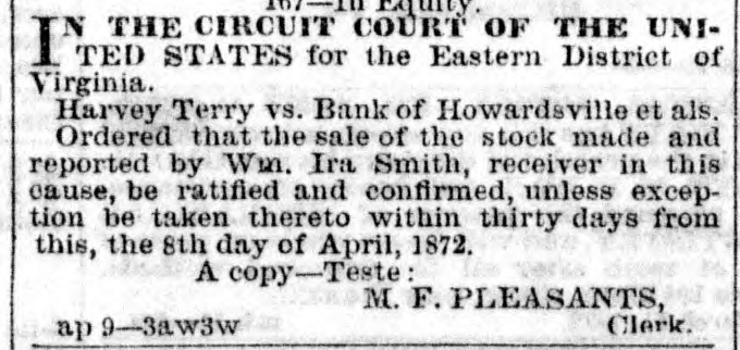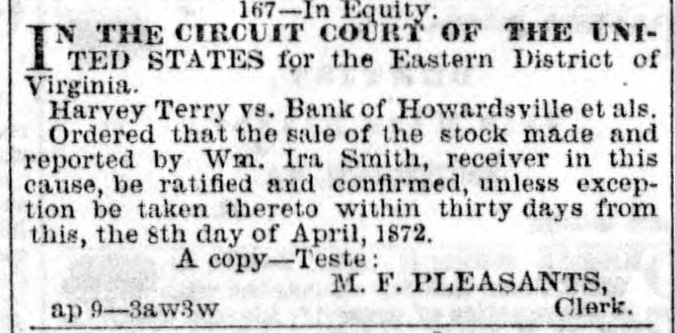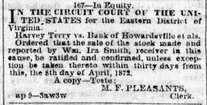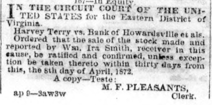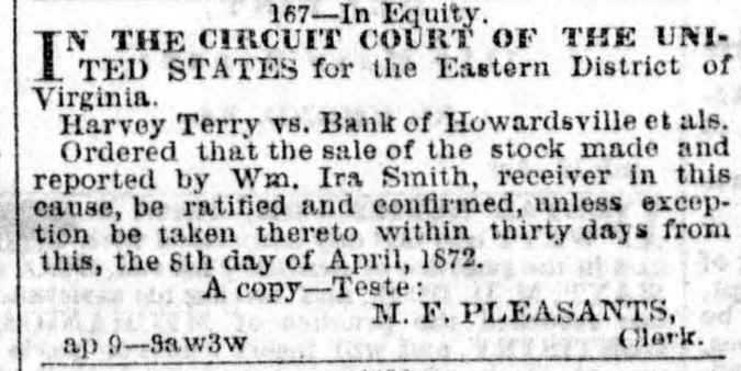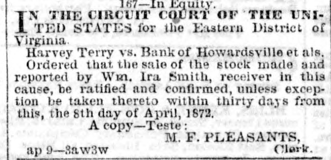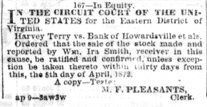 167-In Equity. IN THE CIRCUIT COURT OF THE UNITED. STATES for the Eastern District of Virginia. Harvey Terry vs. Bank of Howardsville et als. Ordered that the sale of the stock made and reported by Wm. Ira Smith, receiver in this cause, be ratified and confirmed, unless exception be taken thereto within thirty days from this, the 8th day of April, 1872. A copy-Teste: M. F. PLEASANTS, Clerk. ap 9-3aw3w
