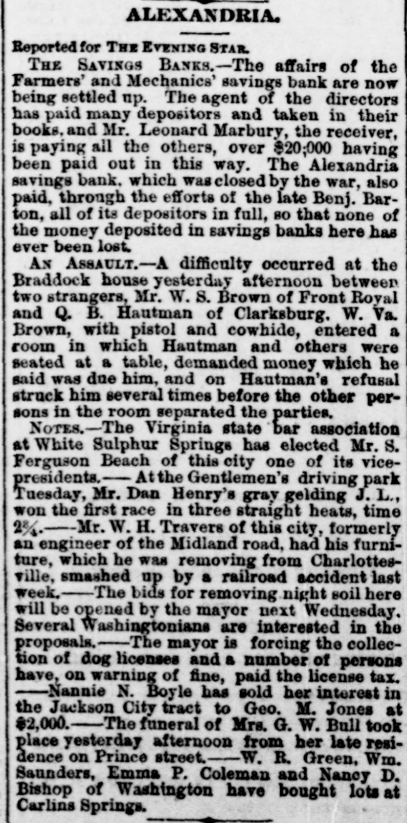 À Batch of Brief Items From the Ancient City. ALEXANDRIA, VA., Aug. 19.-[Special.]Mr. William Murtaugh died at his home on south Patrick street this morning, after a I long illness, aged thirty-five years. He was a genial young man, and much regret is expressed at his death. Softie of the délegates to the Leesburg convention are arriving here this evening. They will probably go up with the local delegation of seventeen by the early morning train. It is believed that the convention will assemble and get right to work nominating General Lee before sundown. Mr. John Morgan Johnson, in whose hands the affairs of the old Alexandria SavI ings Institution were put, gives notice that those. or the heirs of those having balances due them, will receive the same by sending ) him their old pass-books. This bank failed many years ago, but through the good management of the late Benjamin Barton it cancelled all its obligations-dollar for dollar. ) Mr. A. T. Barton. of Winchester, the W. and O. railroad commissioner, gives out a like notice to those creditors who have not received their allowances from the fifth or last dividend. Both gentlemen are desirous of winding up the affairs of these concerns, and as speedily as possible. The "cannon-ball" train of the Richmond and Danville road between Washington and Atlanta will be put on about October will run on a fast-express It will at but three after this 1st, and leaving stop city-Charlotteeville, points in schedule. Virginia Lynchburg, and Danville-and will be a solid train, fitted up with every modern convenience and appurtenance. William Kpeas died in Fauquier county Saturday, aged ninety-three years. He was the father of twenty-seven children, one of his sons being nearly seventy-tive years old. L. W. L. Hough, for many years one of the most active and successful merchants of Leesburg, died Saturday night, in the seventy-first year of his age. Mrs. Mildred, widow of the late Captain Edward Denty, died in West Washington on Sunday. The remains were brought here this afternoon and buried in the family plot, a number of Alexandrians meeting the boat and escorting the remains thither. One of the marble firms here has just closed a contract for a m onument over the graves of the late David Storm and wife at Glasgow. It will be one of the largest pieces of work done here in many years. The contract calls for a shaft of pure white Georgia marble, twelve feet high, and of neat and tastv design: drapery and wreath near the apex, and a shield centre-piece. Mrs. Storm died a short time ago, and this is erected in compliance with the wishes and designs of the deceased. City Auditor Price is back from his trip in the Northern States. Mr. W. J. Hall has returned. Major Samuel Beach. of Richmond. is visiting his brother, Captain John S. Beach, of the Corporation Court. Dr. Wm. G. Ashby has gone to Berkeley Springs for a short vacation. Dr. Bedford Brown, who recently purchased the fine residence of the late Judge Charles E. Stuart, on north Washington street, is moving thither. Mr. Alfred G. Uhter has purchased Dr. Bedford's late home on south Fairfax street. Mr. Robert L. Marye, of Ashland, is visiting friends here. Mr. Harry Fisher is back at his old key in the W. U. Telegraph office here. Harry savs there's no place like home. Mr. Percy Wimsatt has been transferred to Washington. Miss Mamie Judkins, of Richmond, was in the city yesterday on a visit to her uncle, Mr. Lewis McKenzie. Mr. John W. Boutz, of the Portner Company, located at the Norfolk depot, is on a visit to his old home.