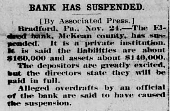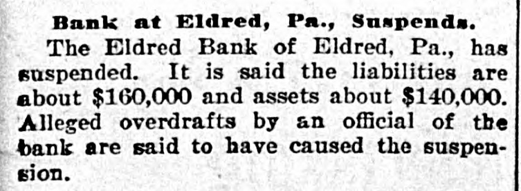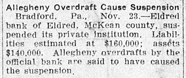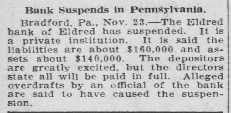 FINANCIAL Jan. 2-State Bank, Rockyford, Col., closed doors. 6-Four big New York diamond firms forced into trustee's hands; liabilities, $4,500,000. -Chicago Great Western railroad JOHN placed in hands of receivers. 16-Western Bank and Trust Co., Dallas, Tex., largest Texas saving bank, placed in receiver's hands. 18-John R. Walsh, president Chicago National bank and several railroads, convicted of misappropriating institution's funds. 21-Capital State Bank, Boise, Idaho, suspended. 22-Traders and Mechanics' Bank, Pittsburg, Pa., closed doors. 25-National Bank of North America, New York, closed for liquidation, by order of government. 29-New Amsterdam National bank, capital $1,000,000, and Mechanics and Traders' bank, both of New York, taken in charge by comptroller of currency. 31-Oriental Bank of New York closed doors, following run. Feb. 13-W. B. Ridgely, comptroller of currency, accepted presidency of reorganized National Bank of Commerce, Kansas City, Mo. 26-International and Great Northern Railroad Co., a Gould line, placed in receivers' hands. 27-Financiers E. R. Thomas and O. F. Thomas indicted on charge of mismanagement of funds of Provident Savings Life Assurance society. Mar. 13-John R. Walsh denied new trial; sentenced to five years in federal prison. 16-People's National bank, Aspin, Col., closed. Apr. 1-Pike County Bank and Trust Co., Macomb City, Miss., placed in receiver's hands. 21-Bank of Wauseon, Wauseon, O., closed doors. 24-T. A. McIntyre & Co., with houses in many cities, failed for $1,000,000. May 8-Euclid Avenue Trust Co., Cleveland, O., assigned. 14-Reserve Trust Co., and American Savings bank, Cleveland, O., closed their doors. 28-G. W. MacMillen & Co., Pittsburg, Pa., stockbrokers, failed; liabilities, $1,800,000. Jun. 3-Kosclusko Company bank, Warsaw, Ind., closed by state auditor. 23-Citizens' bank, Dover, Ky., closed doors. Jul. 14-National Deposit bank, Philadelphia, Pa., closed by comptroller of currency. 17-Farmers and Merchants' Banking Co., Cleveland, O., failed. 22-Standard on $29,240,000 fine decision unanimously reversed by United States court of appeals at ChiAug. cago. 6-First National bank, Belle Plaine, Minn., closed by order comptroller of currency; bank was insolvent: President J. G. Lund committed suicide. 25-A. O. Brown & Co., one of largest New York brokerage firms, failed; liabilities over $1,000,000. Sep. 10-A. Booth & Co., largest fish house in country, forced into receiver's hands. Oct. 16-Union National bank, Sommerville, Pa., closed by government. Nov. 5-Charles W. Morse and Alfred H. Curtis, great financiers, found guilty of misapplication of funds and falsifying books of National Bank of America, New York. 6-C. W. Morse sentenced to 15 years; Curtis given liberty on suspended sentence. 23-Eldred bank of Eldred, Pa., suspended; capital stock, $100,000. Dec. 7-National exchange bank at Springfield, Mo., closed; excitement caused by effort of W. O. Oldham, cashier of State Savings bank, to shoot President H. B. McDaniel, of Union National bank. 11-Springport, Mich., State Savings bank closed by bank examiner. 16-Somersworth, N. H., First National bank closed, following discovery of shortage of $85,000. 23-Thomas F. Ryan announced retirement from finance. 26-Henry W. Poor, New York broker, assigned for creditors.