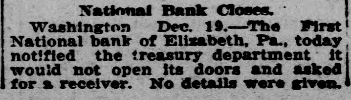 PENNSYLVANIA BANK CLOSED. First National Bank of Elizabeth Asks Appointment of Receiver. Washington, Dec. 19.-The First National bank of Elizabeth, Pa., today notified the treasury department that it would not open its doors and asked for the appointment ,of a receiver. No details were given . Acting Comptroller of the Currency Kane will send a national bank examiner to take temporary charge.