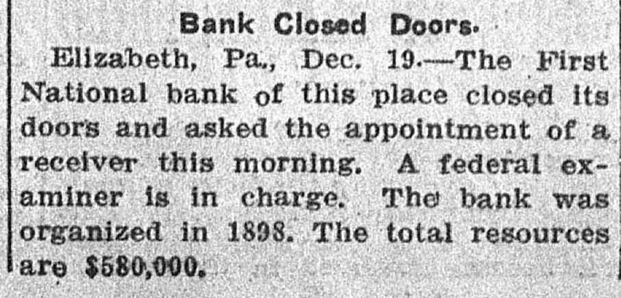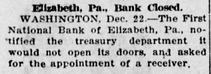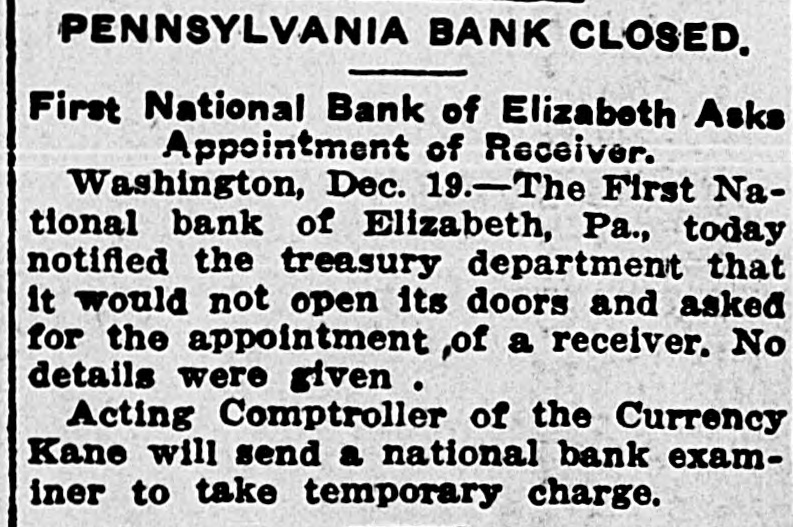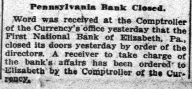 Pennsylvania Bank Closed. Word was received at the Comptroller of the Currency's office yesterday that the First National Bank of Elizabeth, Pa., closed its doors yesterday by order of the directors. A receiver to take charge of the bank's affairs has been ordered to Elizabeth by the Comptroller of the Currency,