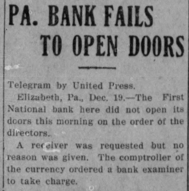 PA. BANK FAILS TO OPEN DOORS Telegram by United Press. Elizabeth, Pa., Dec. 19.-The First National bank here did not open its doors this morning on the order of the directors. A receiver was requested but no reason was given. The comptroller of the currency ordered a bank examiner to take charge.