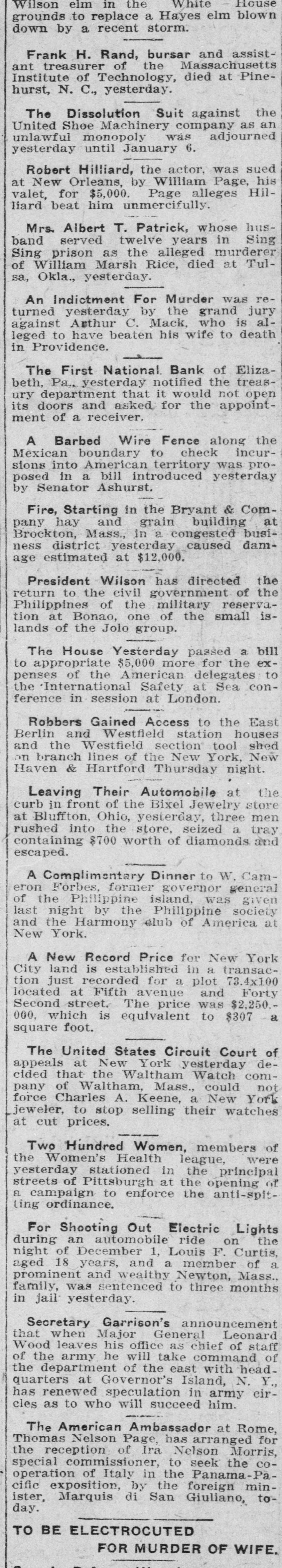 Wilson elm in the White House grounds to replace a Hayes elm blown down by a recent storm. Frank H. Rand, bursar and assistant treasurer of the Massachusetts Institute of Technology, died at Pinehurst, N. C., yesterday. The Dissolution Suit against the United Shoe Machinery company as an unlawful monopoly was adjourned yesterday until January 6. Robert Hilliard, the actor. was sued at New Orleans, by William Page, his valet, for $5,000. Page alleges Hilliard beat him unmercifully. Mrs. Albert T. Patrick, whose husband served twelve years in Sing Sing prison as the alleged murderer of William Marsh Rice, died at Tulsa, Okla., yesterday. An Indictment For Murder was returned yesterday by the grand jury against Arthur C. Mack, who is alleged to have beaten his wife to death in Providence. The First National Bank of Elizabeth. Pa., yesterday notified the treasury department that it would not open its doors and asked for the appoint ment of a receiver. A Barbed Wire Fence along the Mexican boundary to check incursions into American territory was proposed in a bill introduced yesterday by Senator Ashurst. Fire, Starting in the Bryant & Company hay and grain building at Brockton, Mass., in a congested business district yesterday caused damage estimated at $12,000. President Wilson has directed the return to the civil government of the Philippines of the military reservation at Bonao, one of the small islands of the Jolo group. The House Yesterday passed a bill to appropriate $5,000 more for the expenses of the American delegates to the International Safety at Sea conference in session at London. Robbers Gained Access to the East Berlin and Westfield station houses and the Westfield section tool shed on branch lines of the New York, New Haven & Hartford Thursday night. Leaving Their Automobile at the curb in front of the Bixel Jewelry store at Bluffton, Ohio, yesterday, three men rushed into the store. seized a tray containing 8700 worth of diamonds and escaped. A Complimentary Dinner to W. Cam eron Forbes, former governor general of the Philippine island, was given last night by the Philippine society and the Harmony elub of America at New York. A New Record Price for New York City land is established in a transaction just recorded for a plot 73.4x100 located at Fifth avenue and Forty Second street, The price was $2,250. a 000, which is equivalent to $307 square foot. The United States Circuit Court of appeals at New York yesterday decided that the Waltham Watch company of Waltham, Mass., could not force Charles A. Keene, a New York jeweler, to stop selling their watches at cut prices. Two Hundred Women, members of the Women's Health league, were yesterday stationed in the principal streets of Pittsburgh at the opening of a campaign to enforce the anti-spitting ordinance. For Shooting Out Electric Lights during an automobile ride on the night of December 1, Louis F. Curtis, a aged 18 years, and a member of prominent and wealthy Newton, Mass. family, was sentenced to three months in jail yesterday. Secretary Garrison's announcement that when Major General Leonard Wood leaves his office as chief of staff of the army he will take command of the department of the east with head. quarters at Governor's Island, N. Y., has renewed speculation in army circles as to who will succeed him. The American Ambassador at Rome, Thomas Nelson Page, has arranged for the reception of Ira Nelson Morris, special commissioner, to seek the cooperation of Italy in the Panama-Pacific exposition, by the foreign minister, Marquis di San Giuliano, today. TO BE ELECTROCUTED FOR MURDER OF WIFE.