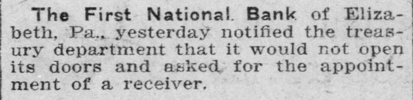 The First National. Bank of Elizabeth, Pa., yesterday notified the treasury department that it would not open its doors and asked for the appointment of a receiver.