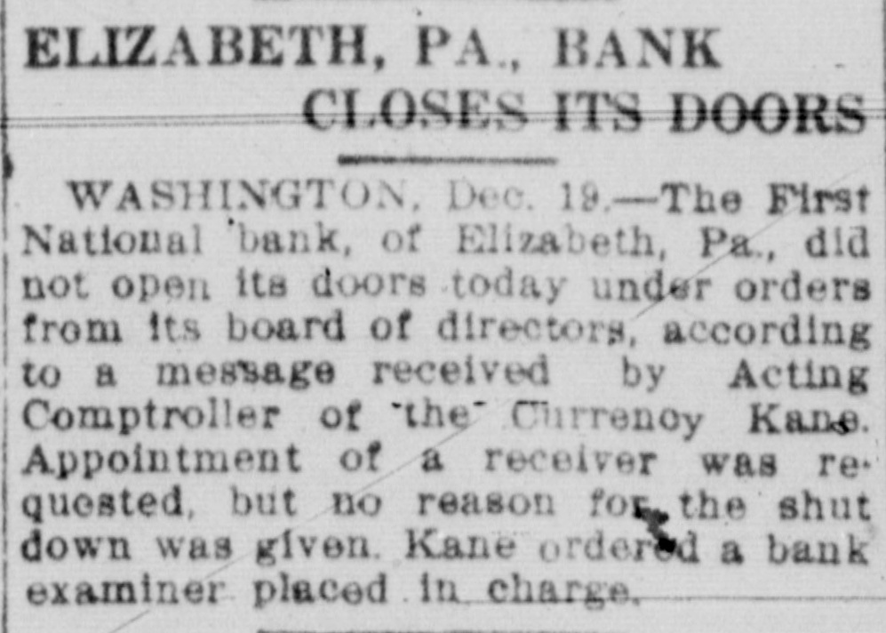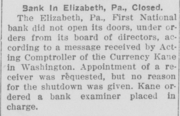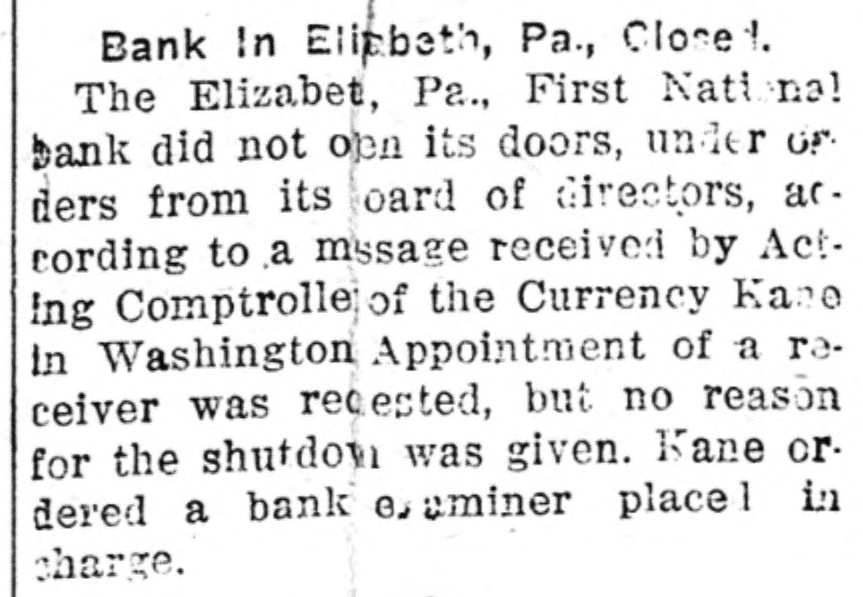 Bank In Elizabeth, Pa., Closed. The Elizabeth, Pa., First National bank did not open its doors, under orders from its board of directors, according to a message received by Acting Comptroller of the Currency Kane in Washington. Appointment of a receiver was requested, but no reason for the shutdown was given. Kane ordered a bank examiner placed in charge.