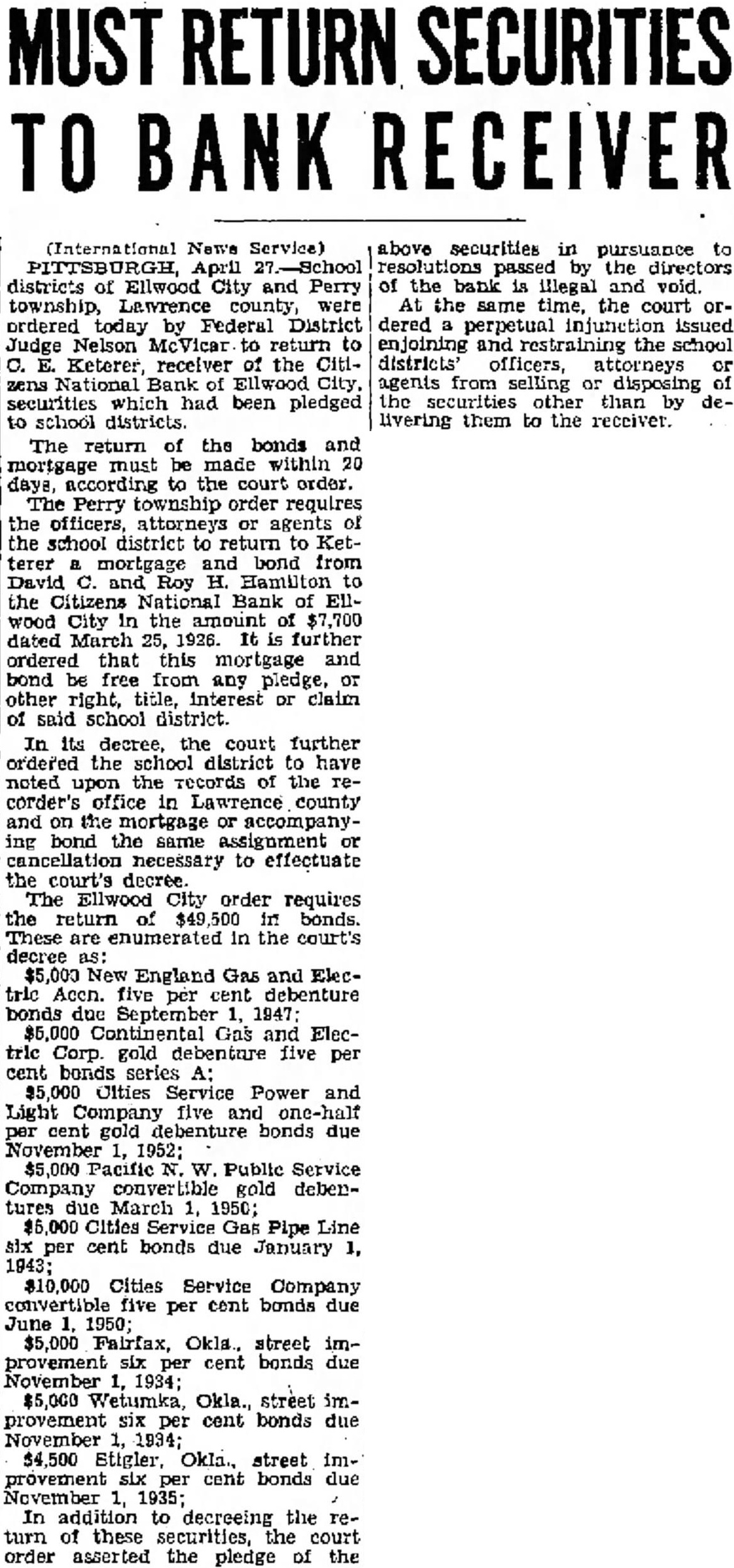 (International News Service) April districts of Ellwood City and Perry township, Lawrence county, were ordered today by Federal District Judge Nelson to return to Keterer, receiver the Citizens National Bank City, securities which had been pledged to school districts. The return of the bonds and mortgage must be made within days, according to the court order. The Perry township order requires the officers, attorneys or agents of the school district to return to Ketterer mortgage and bond from David and Roy Hamilton the Citizens National Bank Ellwood City in the amount of $7,700 dated March 25, 1926. It is further ordered that this mortgage and bond free from any pledge, or other right, title, interest or claim of said school district. In its decree, the court further ordered the school district have noted upon the records of the recorder's office in Lawrence county and the mortgage or accompanying bond the same assignment or cancellation necessary to effectuate the court's decree. The Ellwood City order requires the return of in bonds. These are enumerated in the court's decree New England Gas and Electric Accn. five per cent debenture bonds September 1947; $5,000 Continental Gas and Electric Corp. gold debenture five per cent bonds series Cities Service Power and Light Company five and cent gold debenture bonds due November 1952; $5,000 Pacific W. Public Service Company convertible gold debentures due March 1950; Cities Service Gas Pipe Line six per cent bonds due January $10,000 Cities Service Company convertible five per cent bonds due June 1950; $5,000 Fairfax, Okla. street improvement six per cent bonds due November 1934; $5,000 Wetumka, Okla., street improvement six per cent bonds due November 1934; $4,500 Stigler, Okla., street improvement cent bonds due November 1935; In addition to decreeing the turn of these securities, the court order asserted the pledge of the above securities in pursuance to by the directors of the bank is illegal and void. At the same time, the court ordered issued enjoining and the school districts' officers, agents from selling or disposing the other than by livering them to the receiver.