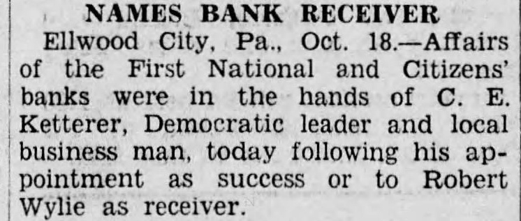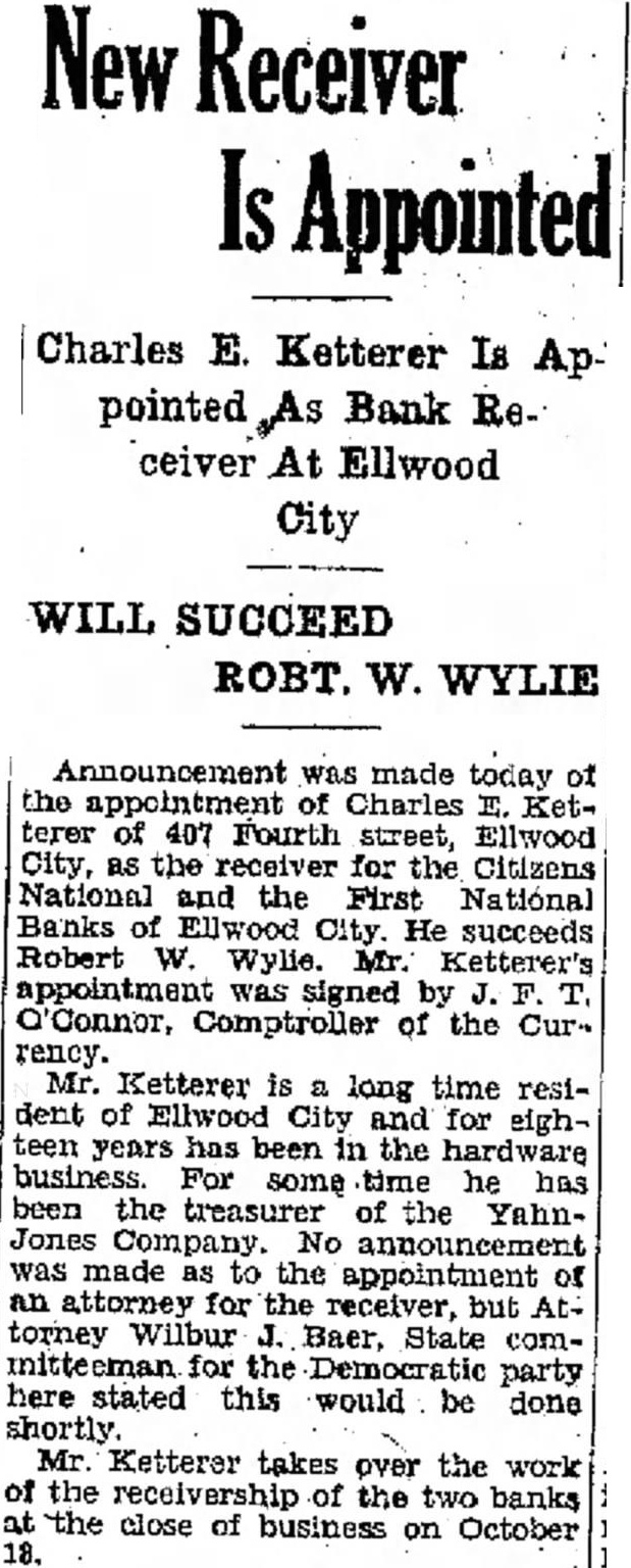 Announcement was made today of the appointment of Charles Ketterer of 407 Fourth street, Ellwood City, as the receiver for the Citizens National and the First National Banks of Ellwood City. He succeeds Robert Wylie. Ketterer's appointment was signed by Comptroller of the rency. Mr. Ketterer long time resident of Ellwood City and for eighteen years has been the hardware business. some time he has been the treasurer of the YahnJones Company. No announcement was made to the appointment an attorney for the receiver, but Attorney Wilbur Baer, State committeeman for the party here stated this would be done shortly. Mr. Ketterer takes over the work of the receivership of the two banks the close of business October on 18.
