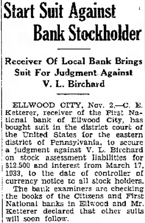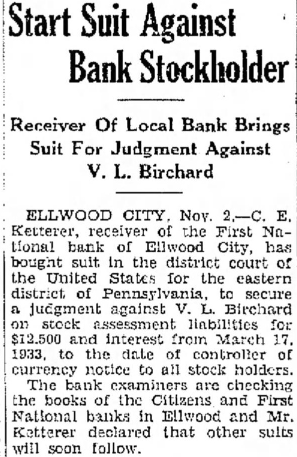 ELLWOOD Nov. Ketterer, receiver the First National bank of Ellwood City, has bought suit in the district court of the United States for the eastern district Pennsylvania, to secure judgment against Birchard on stock assessment liabilities for and interest from March 1933. to the date of controller of currency notice to all stock holders. The bank examiners are checking the books of the Citizens and First National banks Ellwood and Mr. Ketterer declared that other sults will soon follow.