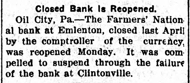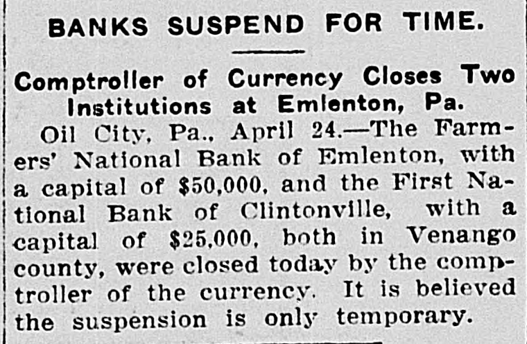 The Farmers' National Bank of Emlenton was closed by the Comptroller of the Currency on April 24, 1908 and placed in the hands of a receiver; reports state the suspension resulted from the failure/connection with the Clintonville bank (a subsidiary). The bank restored impaired capital and was allowed to resume business in mid‑August 1908. No articles describe a depositor run.