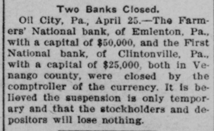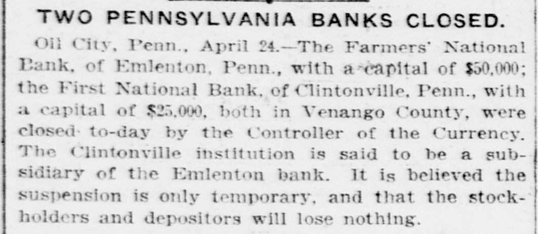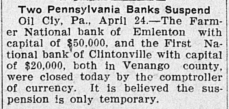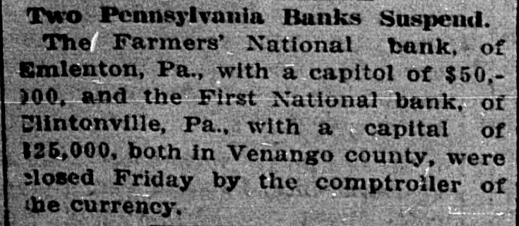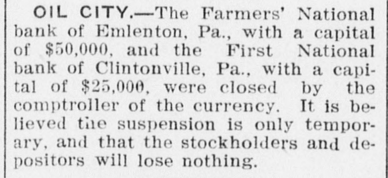 OIL CITY.-The Farmers' National bank of Emlenton, Pa., with a capital of $50,000, and the First National bank of Clintonville, Pa., with a capital of $25,000, were closed by the comptroller of the currency. It is believed the suspension is only temporary, and that the stockholders and depositors will lose nothing.