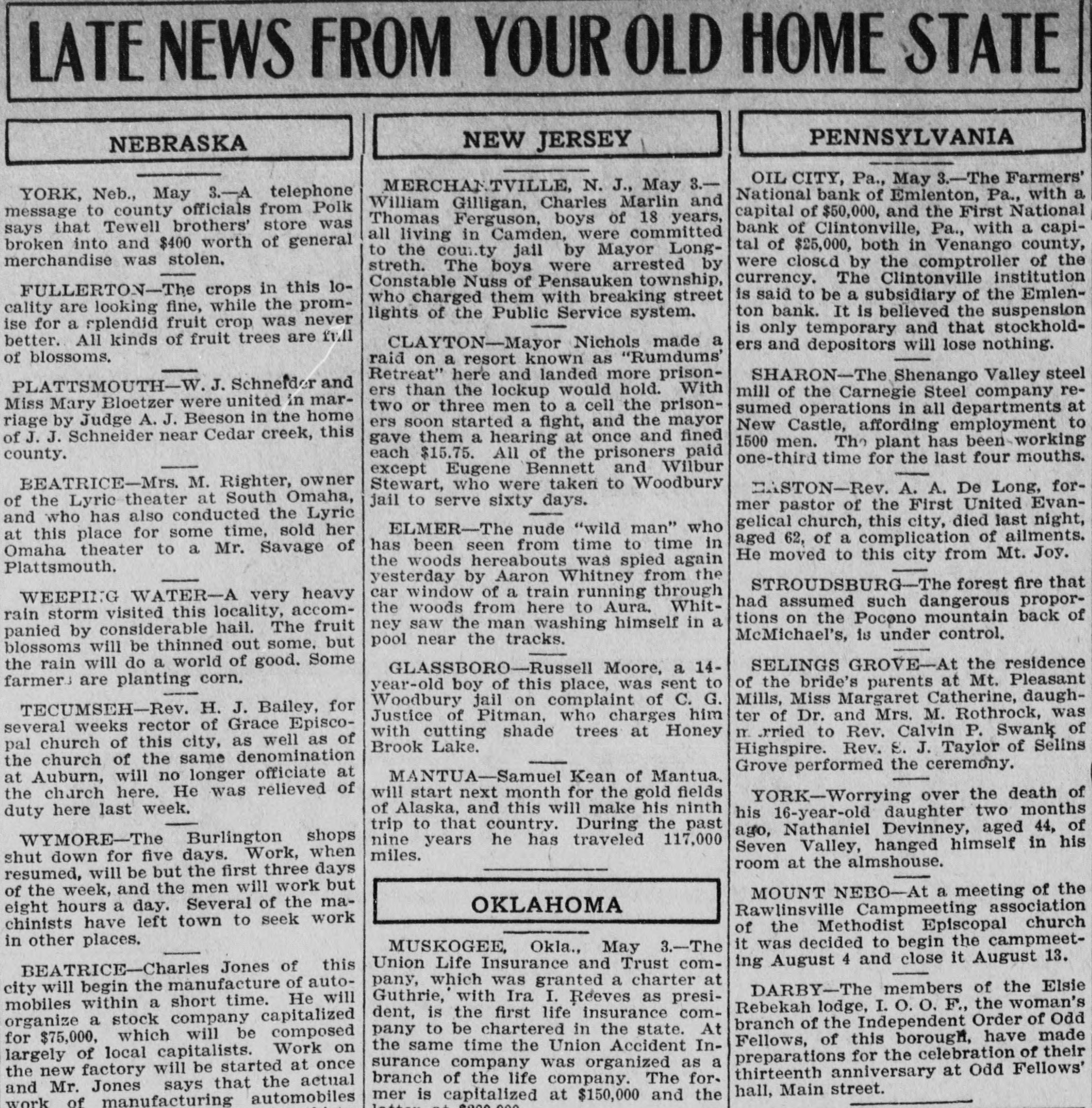 LATE NEWS FROM YOUR OLD HOME STATE PENNSYLVANIA NEBRASKA NEW JERSEY OIL CITY, Pa., May 3.-The Farmers' MERCHAN TVILLE, N. J., May 3.YORK, Neb., May 3.-A telephone National bank of Emlenton, Pa., with a William Gilligan, Charles Marlin and message to county officials from Polk capital of $50,000, and the First National Thomas Ferguson, boys of 18 years, says that Tewell brothers' store was bank of Clintonville, Pa., with a capiall living in Camden, were committed broken into and $400 worth of general tal of $25,000, both in Venango county, to the county jail by Mayor Longmerchandise was stolen. were closed by the comptroller of the streth. The boys were arrested by currency. The Clintonville institution Constable Nuss of Pensauken township, FULLERTO-The crops in this lois said to be a subsidiary of the Emlenwho charged them with breaking street cality are looking fine, while the promton bank. It is believed the suspension lights of the Public Service system. ise for a splendid fruit crop was never is only temporary and that stockholdbetter. All kinds of fruit trees are Ivill CLAYTON-Mayor Nichols made a ers and depositors will lose nothing. of blossoms. raid on a resort known as "Rumdums' Retreat" here and landed more prisonSHARON-The Shenango Valley steel PLATTSMOUTH-V J. Schnelder and ers than the lockup would hold. With mill of the Carnegie Steel company reMiss Mary Bloetzer were united in martwo or three men to a cell the prisonsumed operations in all departments at riage by Judge A. J. Beeson in the home ers soon started a fight, and the mayor New Castle, affording employment to of J. J. Schneider near Cedar creek, this gave them a hearing at once and fined 1500 men. The plant has working each $15.75. All of the prisoners paid county. one-third time for the last four mouths. except Eugene Bennett and Wilbur BEATRICE-Mrs. M. Righter, owner Stewart, who were taken to Woodbury HASTON-Rev. A. A. De Long, forof the Lyric theater at South Omaha, jail to serve sixty days. mer pastor of the First United Evanand who has also conducted the Lyric gelical church, this city, died last night, ELMER-The nude "wild man" who at this place for some time, sold her aged 62, of a complication of ailments. has been seen from time to time in Omaha theater to a Mr. Savage of He moved to this city from Mt. Joy. the woods hereabouts was spied again Plattsmouth. yesterday by Aaron Whitney from the STROUDSBURG-The forest fire that car window of a train running through WEEPING WATER-A very heavy had assumed such dangerous proporthe woods from here to Aura. Whitrain storm visited this locality, accomtions on the Pocono mountain back of ney saw the man washing himself in a panied by considerable hail. The fruit McMichael's, is under control. pool near the tracks. blossoms will be thinned out some, but the rain will do a world of good. Some SELINGS GROVE-At the residence GLASSBORO-Russell Moore, a 14farmer are planting corn. of the bride's parents at Mt. Pleasant year-old boy of this place, was sent to Mills, Miss Margaret Catherine, daughWoodbury jail on complaint of C. G. TECUMSEH-Rev. H. J. Bailey, for ter of Dr. and Mrs. M. Rothrock, was Justice of Pitman, who charges him several weeks rector of Grace EpiscoII. .rried to Rev. Calvin P. Swank of with cutting shade trees at Honey pal church of this city, as well as of Brook Lake. Highspire. Rev. E. J. Taylor of Selins the church of the same denomination Grove performed the ceremony. MANTUA-Samuel Kean of Mantua, at Auburn, will no longer officiate at the church here. He was relieved of will start next month for the gold fields YORK-Worrying over the death of of Alaska, and this will make his ninth duty here last week. his 16-year-old daughter two months trip to that country. During the past ago, Nathaniel Devinney, aged 44, of WYMORE-The Burlington shops nine years he has traveled 117,000 Seven Valley, hanged himself in his miles. shut down for five days. Work, when room at the almshouse. resumed, will be but the first three days of the week, and the men will work but MOUNT NEBO-At a meeting of the OKLAHOMA eight hours a day. Several of the maRawlinsville Campmeeting association chinists have left town to seek work of the Methodist Episcopal church in other places. it was decided to begin the campmeetMUSKOGEE, Okla., May 3.-The ing August 4 and close it August 13. Union Life Insurance and Trust comBEATRICE-Charles Jones of this pany, which was granted a charter at city will begin the manufacture of autoDARBY-The members of the Elsie Guthrie," with Ira I. Reeves as presimobiles within a short time. He will Rebekah lodge, I. O. O. F., the woman's dent, is the first life insurance comorganize a stock company capitalized branch of the Independent Order of Odd pany to be chartered in the state. At for $75,000, which will be composed Fellows, of this borough, have made the same time the Union Accident Inlargely of local capitalists. Work on preparations for the celebration of their surance company was organized as a the new factory will be started at once thirteenth anniversary at Odd Fellows' branch of the life company. The for. and Mr. Jones says that the actual hall, Main street. mer is capitalized at $150,000 and the work of manufacturing automobiles