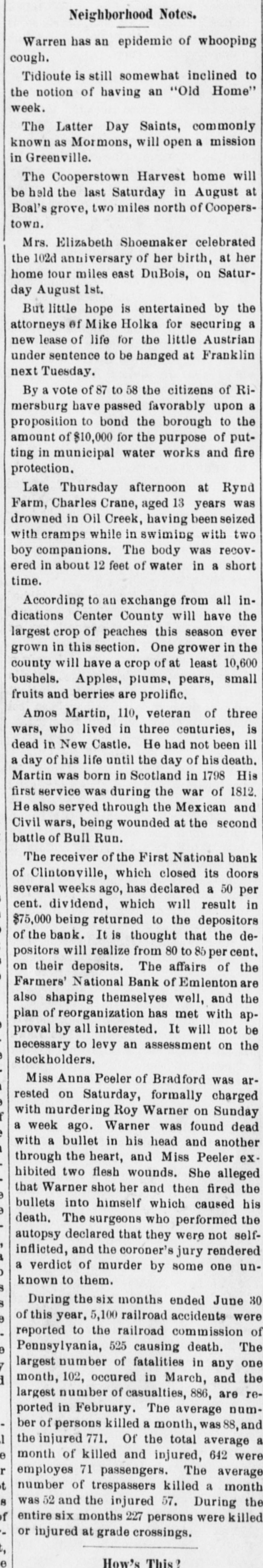 Neighborhood Notes. Warren has an epidemic of whooping cough. Tidioute is still somewhat inclined to the notion of having an "Old Home" week. The Latter Day Saints, commonly known as Mormons, will open a mission in Greenville. The Cooperstown Harvest home will be held the last Saturday in August at Boal's grove, two miles north of Cooperstown. Mrs. Elizabeth Shoemaker celebrated the 102d anniversary of her birth, at her home tour miles east DuBois, on Saturday August 1st. But little hope is entertained by the attorneys of Mike Holka for securing a new lease of life for the little Austrian under sentence to be hanged at Franklin next Tuesday. By a vote of 87 to 58 the citizens of Rimersburg have passed favorably upon a proposition to bond the borough to the amount of $10,000 for the purpose of putting in municipal water works and fire protection. Late Thursday afternoon at Rynd Farm, Charles Crane, aged 13 years was drowned in Oil Creek, having been seized with cramps while in swiming with two boy companions. The body was recovered in about 12 feet of water in a short time. According to an exchange from all indications Center County will have the largest crop of peaches this season ever grown in this section. One grower in the county will have a crop of at least 10,600 bushels. Apples, plums, pears, small fruits and berries are prolific. Amos Martin, 110, veteran of three wars, who lived in three centuries, is dead in New Castle. He had not been ill a day of his life until the day of his death. Martin was born in Scotland in 1798 His first service was during the war of 1812. He also served through the Mexican and Civil wars, being wounded at the second battle of Bull Run. The receiver of the First National bank of Clintonville, which closed its doors several weeks ago, has declared a 50 per cent. dividend, which will result in $75,000 being returned to the depositors of the bank. It is thought that the depositors will realize from 80 to 85 per cent. on their deposits. The affairs of the Farmers' National Bank of Emlenton are also shaping themselyes well, and the plan of reorganization has met with approval by all interested. It will not be necessary to levy an assessment on the stockholders. Miss Anna Peeler of Bradford was arrested on Saturday, formally charged with murdering Roy Warner on Sunday a week ago. Warner was found dead with a bullet in his head and another through the heart, and Miss Peeler exhibited two flesh wounds. She alleged that Warner shot her and then fired the bullets into himself which caused his death. The surgeons who performed the autopsy declared that they were not selfinflicted, and the coroner's jury rendered a verdict of murder by some one unknown to them. During the six months ended June 30 of this year, 5,100 railroad accidents were reported to the railroad commission of Pennsylyania, 525 causing death. The largest number of fatalities in any one month, 102, occured in March, and the largest number of casualties, 886, are reported in February. The average number of persons killed a month, was 88, and the injured 771. Of the total average a month of killed and injured, 642 were employes 71 passengers. The average number of trespassers killed a month was 52 and the injured 57. During the entire six months 227 persons were killed or injured at grade crossings.