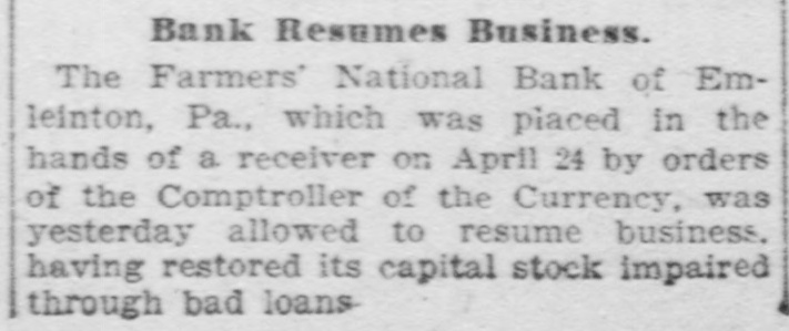The Farmers' National Bank of Emlenton, Pa., which was placed in the hands of a receiver on April 24 ... was yesterday allowed to resume business. having restored its capital stock impaired through bad loans