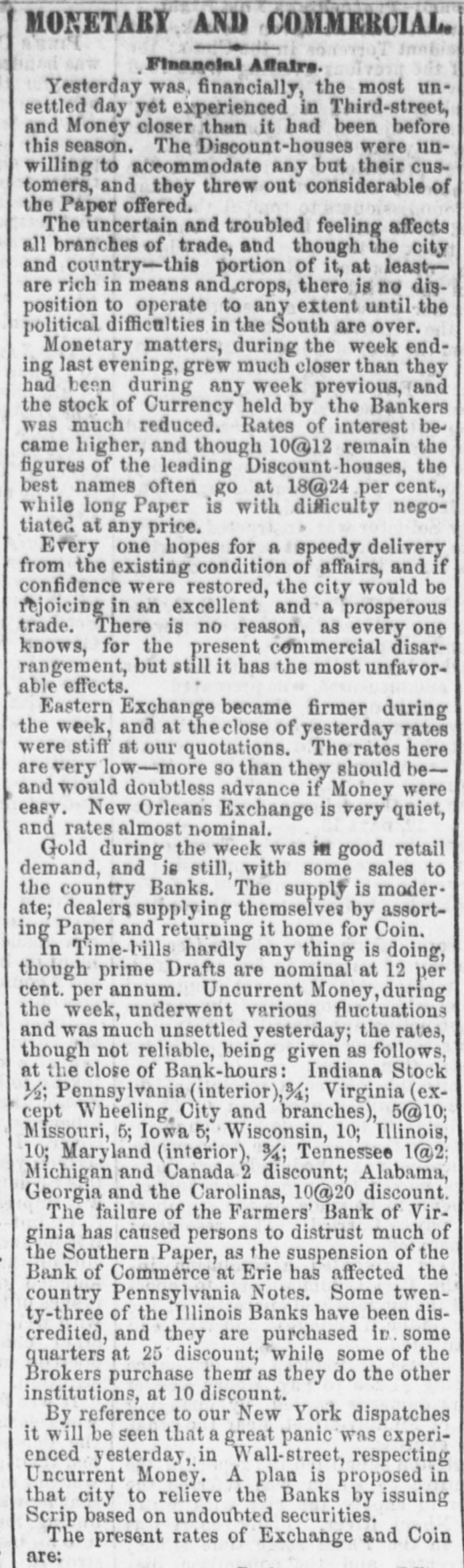 MONETARY AND COMMERCIAL. Financial Affairs. Yesterday was, financially, the most unsettled day yet experienced in Third-street, and Money closer than it had been before this season. The Discount-houses were unwilling to accommodate any but their customers, and they threw out considerable of the Paper offered. The uncertain and troubled feeling affects all branches of trade, and though the city and country-this portion of it, at leastare rich in means and.crops, there is no disposition to operate to any extent until the political difficulties in the South are over. Monetary matters, during the week ending last evening, grew much closer than they had been during any week previous, and the stock of Currency held by the Bankers was much reduced. Rates of interest became higher, and though 10@12 remain the figures of the leading Discount-houses, the best names often go at 18@24 per cent., while long Paper is with difficulty negotiated at any price. Every one hopes for a speedy delivery from the existing condition of affairs, and if confidence were restored, the city would be rejoicing in an excellent and a prosperous trade. There is no reason, as every one knows, for the present commercial disarrangement, but still it has the most unfavorable effects. Eastern Exchange became firmer during the week, and at the close of yesterday rates were stiff at our quotations. The rates here are very low-more so than they should beand would doubtless advance if Money were easy. New Orleans Exchange is very quiet, and rates almost nominal. Gold during the week was in good retail demand, and is still, with some sales to the country Banks. The supply is moderate; dealers supplying themselves by assorting Paper and returning it home for Coin. In Time-bills hardly any thing is doing, though prime Drafts are nominal at 12 per cent. per annum. Uncurrent Money, during the week, underwent various fluctuations and was much unsettled yesterday; the rates, though not reliable, being given as follows, at the close of Bank-hours: Indiana Stock ½; Pennsylvania (interior),%; Virginia (except Wheeling City and branches), 5@10; Missouri, 5; Iowa 5; Wisconsin, 10; Illinois, 10; Maryland (interior), 3/4; Tennessee 1@2; Michigan and Canada 2 discount; Alabama, Georgia and the Carolinas, 10@20 discount. The failure of the Farmers' Bank of Virginia has caused persons to distrust much of the Southern Paper, as the suspension of the Bank of Commerce at Erie has affected the country Pennsylvania Notes. Some twenty-three of the Illinois Banks have been discredited, and they are purchased in. some quarters at 25 discount; while some of the Brokers purchase them as they do the other institutions, at 10 discount. By reference to our New York dispatches it will be seen that a great panic was experienced yesterday, in Wall-street, respecting Uncurrent Money. A plan is proposed in that city to relieve the Banks by issuing Scrip based on undoubted securities. The present rates of Exchange and Coin are:
