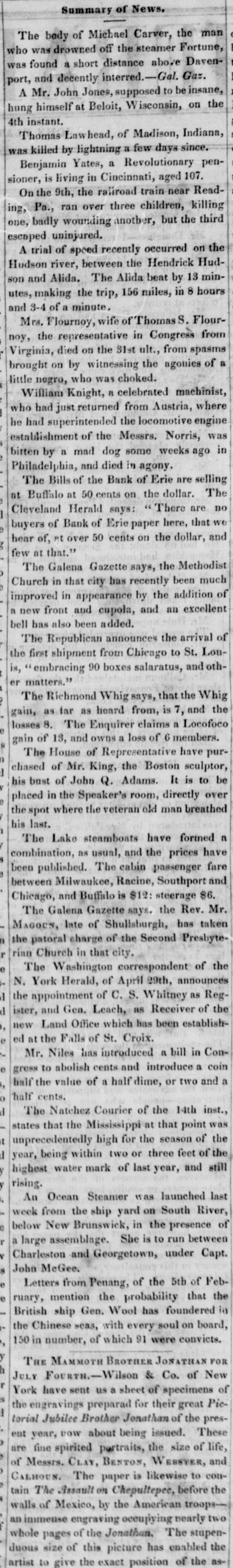 Summary of News. body of Michael Carver, the Fortune, man The was drowned off the steamer Davenwho found a short distance above was port, and decently Jones, interred.-Gal. Gar. supposed to be insane, the hung A Mr. himself John at Beloit, Wisconsin, on 4th instant. Thomas Lawhead, of Madison, since. Indiana, was killed by lightning a few days penBenjamin Yates, a Revolutionary 107. is living in Cincinnati, aged sioner, 9th, the railroad train near killing ReadOn the ran over three children, the third ing, one, badly Pa., wounding another, but escaped trial uninjured. of speed recently occurred on Hud- the A river, between the Hendrick minHudson and Alida. The Alida beat by 8 13 hours son utes, making the trip, 156 miles, in and 3-4 of a minute. Mrs. Flournoy, wife of Thomas S. Flour- from the representative in Congress spasms noy, died on the S1st ult., from of brought Virginia, on by witnessing the agonies little negro, who was choked. William Knight, a celebrated machinist, where had just returned from Austria, who had superintended the locomotive engine was establishment he of the Messrs. Norris, in bitten by a mad dog some weeks ago Philadelphia, and died in agony. Bills of the Bank of Erie are selling The The Buffalo at 50 cents on the dollar. at Cleveland Herald says: There are that we no of Bank of Erie paper here, and buyers hear of, At over 50 cents on the dollar, few at that." Galena Gazette says, the Methodist much The in that city has recently been of Church in appearance by the addition excellent improved a new front and cupola, and an bell has also been added. The Republican announces the arrival Lou- of first shipment from Chicago to St. and oththe is, embracing 90 boxes salaratus, er matters." The Richmond Whig says, that the Whig the as far as heard from, is 7, Locofoco and e gain, losses 8. The Enquirer claims members. a gain of 13, and owns a loss of 6 The House of Representative have purchased of Mr. King, the Boston sculptor, to be his bust of John Q. Adams. It is over in the Speaker's room, directly breathed placed the spot where the veteran old man his last. The Lake steamboats have formed have a combination, as usual, and the prices fare been published. The cabin passenger and between Milwaukee, Racine, Southport $6. Chicago, and Buffalo is $12: steerage Mr. The Galena Gazette says. the Rev. MAGOUN, late of Shullsburgh, has taken n the patoral charge of the Second Presbyter rian Church in that city, e The Washington correspondent of the York Herald, of April 29th, announces I d the N. appointment of C. S. Whitney as of Reg- the ister, and Gen. Leach, as Receiver establish, new Land Office which has been e ed the Falls of St. Croix. Mr. at Niles has introduced a bill in Con- coin e to abolish cents and introduce a and , half gress the value of a half dime, or two a o half cents. d The Natchez Courier of the 14th inst., was that the Mississippi at that point of the t d states unprecedentedly high for the season of the being within two or three feet and still y year, highest water mark of last year, y rising. An Ocean Steamer was launched last week from the ship yard on South River, of e below New Brunswick, in the presence r large assemblage. She is to run between Capt. a Charleston and Georgetown, under s John McGee. e Letters from Penang, of the 5th of Feb- the e mention the probability that in ruary, British ship Gen. Wool has foundered the Chinese seas, with every soul on board, , 150 in number, of which 91 were convicts. y h MAMMOTH BROTHER JONATHAN FOR FOURTH.-Wilson & Co. have sent us a sheet of York JULY THE specimens of New Pie- of the engravings preparad for their great torial Jubilee Brother Jonathan of the These present year, POW about being issued. of fine spirited pertraits, the size life, and of are Messrs. CLAY, BENTON, WEBSTER, CALHOUS. The paper is likewise to conAssault on Chepultepee, before Mexico, by the engraving occupying an walls tain immense The of American nearly t troops... whole pages of the Jonathan. The stupen- the duous size of this picture has enabled artist to give the exact position of the as-