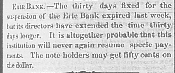 ERIE BANK.-The thirty days fixed for the suspension of the Erie Bank expired last week, but its directors have extended the time thirty days longer. It is altogether probable that this institution will never again resume specie payments. The note holders may get fifty cents on the dollar.