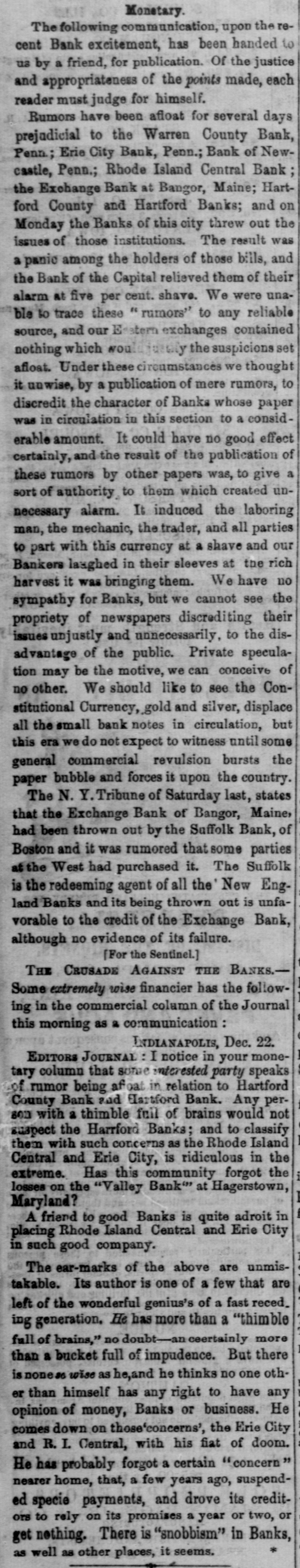Monetary. The following communication, upon the recent Bank excitement, has been handed to us by a friend, for publication. Of the justice and appropriateness of the points made, each reader must judge for himself. Rumors have been afloat for several days prejudicial to the Warren County Bank, Penn; Erie City Bank, Penn.; Bank of Newcastle, Penn.; Rhode Island Central Bank the Exchange Bank at Bangor, Maine; Hartford County and Hartford Banks; and on Monday the Banks of this city threw out the issues of those institutions. The result was a panic among the holders of those bills, and the Bank of the Capital relieved them of their alarm at five per cent. shave. We were unable to trace these rumors" to any reliable source, and our Eastern exchanges contained nothing which wouldjurelly the suspicions set afloat. Under these circumstances we thought it unwise, by a publication of mere rumors, to discredit the character of Banks whose paper was in circulation in this section to a considerable amount. It could have no good effect certainly, and the result of the publication of these rumors by other papers was, to give a sort of authority. to them which created unnecessary alarm. It induced the laboring man, the mechanic, the trader, and all parties to part with this currency at a shave and our Bankers laughed in their sleeves at the rich harvest it was bringing them. We have no sympathy for Banks, but we cannot see the propriety of newspapers discrediting their issues unjustly and unnecessarily, to the disadvantage of the public. Private speculation may be the motive, we can conceive of no other. We should like to see the Constitutional Currency, gold and silver, displace all the small bank notes in circulation, but this era we do not expect to witness until some general commercial revulsion bursts the paper bubble and forces it upon the country. The N. Y. Tribune of Saturday last, states that the Exchange Bank of Bangor, Maine, had been thrown out by the Suffolk Bank, of Boston and it was rumored that some parties at the West had purchased it. The Suffolk is the redeeming agent of all the' New England Banks and its being thrown out is unfavorable to the credit of the Exchange Bank, although no evidence of its failure. [For the Sentinel.] THE CRUSADE AGAINST THE BANKS.Some extremely wise financier has the following in the commercial column of the Journal this morning as a communication INDIANAPOLIS, Dec. 22. EDITORS JOURNAL I notice in your monetary column that some interested party speaks of rumor being afoat in relation to Hartford County Bank and Hartford Bank. Any person with a thimble full of brains would not suspect the Harrford Banks; and to classify them with such concerns as the Rhode Island Central and Erie City, is ridiculous in the extreme. Has this community forgot the losses on the "Valley Bank" at Hagerstown, Maryland? A friend to good Banks is quite adroit in placing Rhode Island Central and Erie City in such good company. The ear-marks of the above are unmistakable. Its author is one of a few that are left of the wonderful genius's of a fast reced. ing generation. He has more than a "thimble full of brains," no doubt-an ceertainly more than a bucket full of impudence. But there is none wise as he,and he thinks no one other than himself has any right to have any opinion of money, Banks or business. He comes down on those'concerns', the Erie City and R. I. Central, with his fiat of doom. He has probably forgot a certain "concern nearer home, that, a few years ago, suspended specie payments, and drove its creditors to rely on its promises a year or two, or get nothing. There is "snobbism" in Banks, as well as other places, it seems.
