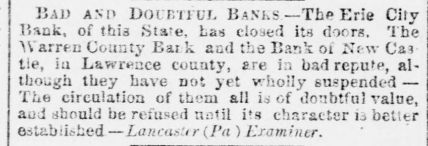 BAD AND DOUBTFUL BANKS - The Erie City Bank, of this State, has closed its doors. The Warren County Bank and the Bank of New Cas tie, in Lawrence county, are in bad repute, although they have not yet wholly suspended The circulation of them all is of doubtful value, and should be refused until its character is better established - Lancaster (Pa) Examiner.
