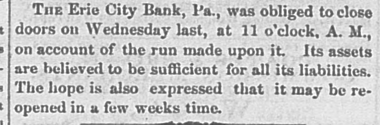 THE Erie City Bank, Pa., was obliged to close doors on Wednesday last, at 11 o'clock, A. M., on account of the run made upon it.