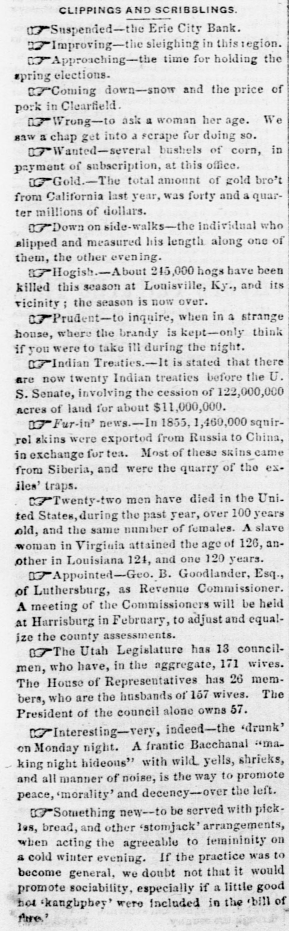 CLIPPINGS AND SCRIBBLINGS. Suspended-the Erie City Bank. Improving-the sleighing in this region. Approaching-the time for holding the spring elections. Coming down-snow and the price of pork in Clearfield. Wrong-to ask a woman her age. We saw a chap get into a scrape for doing SO. Wanted-several bushels of corn, in payment of subscription, at this office. Gold.-The total amount of gold bro't from California last year, was forty and a quarter millions of dollars. Down on side-walks-the individual who 17 slipped and measured his length along one of them, the other evening. F Hogish.-About 245,000 hogs have been killed this season at Louisville, Ky., and its vicinity the season is now over. Prudent-to inquire, when in a strange house, where the brandy is kept-only think if you were to take ill during the night. Indian Treaties.-It is stated that there are now twenty Indian treaties before the U. S. Senate, involving the cession of 122,000,000 acres of land for about $11,000,000. Fur-in' news.-In 1855, 1,460,000 squirrel skins were exported from Russia to China, in exchange for tea. Most of these skins came from Siberia, and were the quarry of the exiles' traps. Twenty-two men have died in the United States, during the past year, over 100 years old, and the same number of females. A slave woman in Virginia attained the age of 126, another in Louisiana 124, and one 120 years. Appointed-Geo. B. Goodlander, Esq., of Luthersburg, as Revenue Commissioner. A meeting of the Commissioners will be held at Harrisburg in February, to adjust and equalize the county assessments. The Utah Legislature has 13 council17 men, who have, in the aggregate, 171 wives. The House of Representatives has 26 members, who are the husbands of 157 wives. The President of the council alone owns 57. Interesting-very, indeed-the 'drunk' on Monday night. A frantic Bacchanal "making night hideous" with wild yells, shrieks, and all manner of noise, is the way to promote peace, 'morality' and decency-over the left. Something new-to be served with pickles, bread, and other 'stomjack' arrangements, when acting the agreeable to femininity on a cold winter evening. If the practice was to become general, we doubt not that it would promote sociability, especially if a little good hot 'kanghphey' were included in the 'bill of fire.'