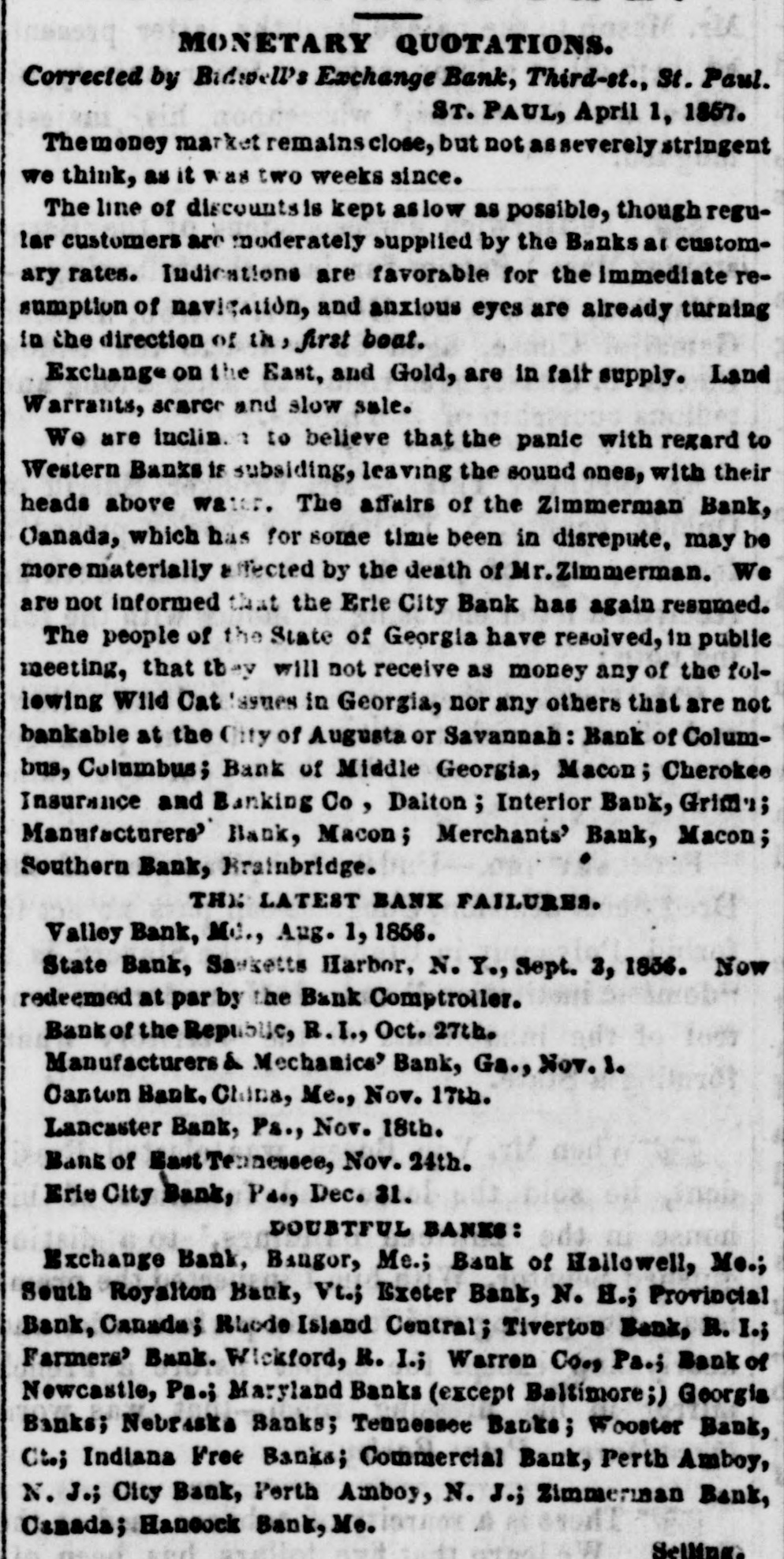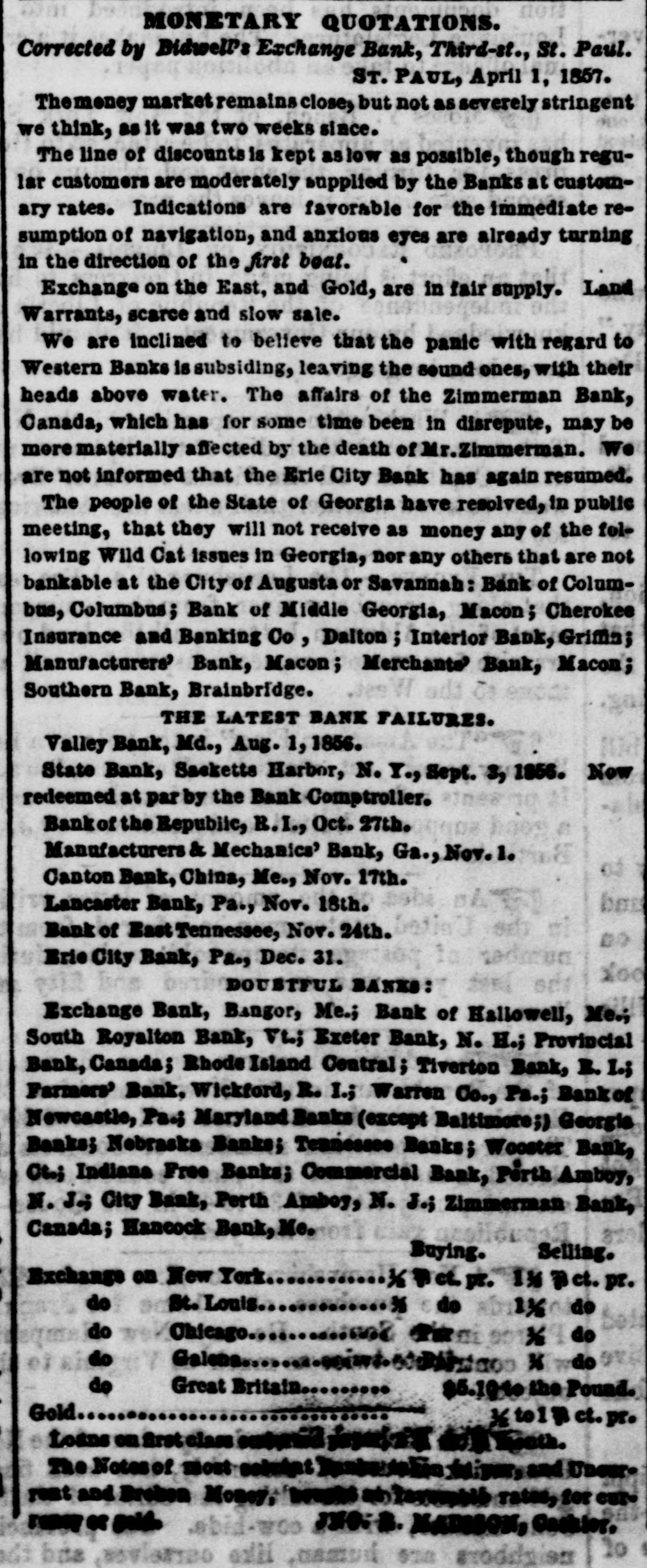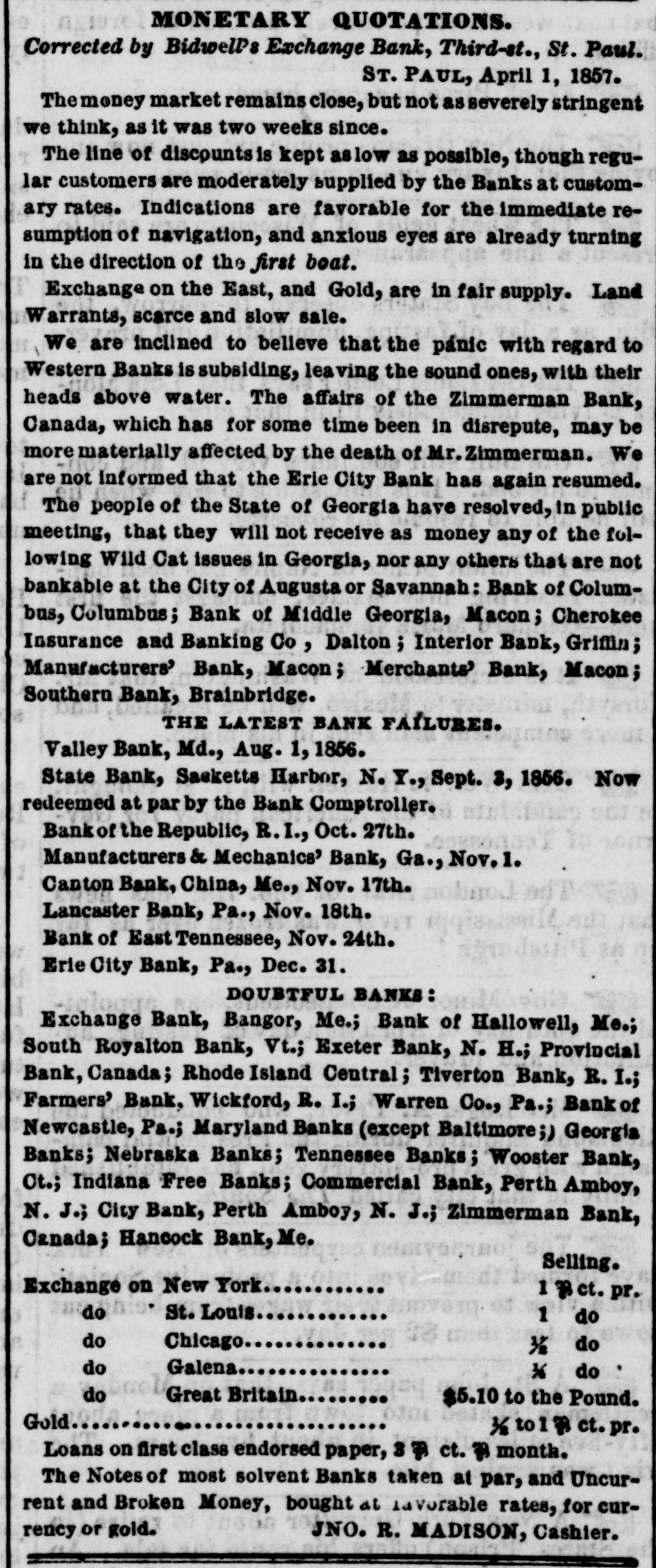 MONETARY QUOTATIONS. Corrected by Bidwell's Exchange Bank, Third-st., St. Paul. ST. PAUL, April 1, 1857. Themoney market remains close, but not as severely stringent we think, as it was two weeks since. The line of discounts is kept aslow as possible, though regular customers are moderately supplied by the Banks at customary rates. Indications are favorable for the immediate resumption of navigation, and anxious eyes are already turning in the direction of the first boat. Exchange on the East, and Gold, are in fair supply. Land Warrants, scarce and slow sale. We are inclined to believe that the pánic with regard to Western Banks is subsiding, leaving the sound ones, with their heads above water. The affairs of the Zimmerman Bank, Canada, which has for some time been in disrepute, may be more materially affected by the death of Mr. Zimmerman. We are not informed that the Erie City Bank has again resumed. The people of the State of Georgia have resolved, in public meeting, that they will not receive as money any of the following Wild Cat issues in Georgia, nor any others that are not bankable at the City of Augusta or Savannah: Bank of Columbus, Columbus; Bank of Middle Georgia, Macon; Cherokee Insurance and Banking Co, Dalton; Interior Bank, Griffin; Manufacturers' Bank, Macon; Merchants' Bank, Macon; Southern Bank, Brainbridge. THE LATEST BANK FAILURES. Valley Bank, Md., Aug. 1, 1856. State Bank, Saeketts Harbor, N. Y., Sept. 3, 1856. Now redeemed at par by the Bank Comptroller. Bank of the Republic, R.I., Oct. 27th. Manufacturers & Mechanics' Bank, Ga., Nov. 1. Canton Bank, China, Me., Nov. 17th. Lancaster Bank, Pa., Nov. 18th. Bank of East Tennessee, Nov. 24th. Erie City Bank, Pa., Dec. 31. DOUBTFUL BANKS: Exchange Bank, Bangor, Me.; Bank of Hallowell, Me.; South Royalton Bank, Vt.; Exeter Bank, N. H.; Provincial Bank, Canada; Rhode Island Central; Tiverton Bank, R. I.; Farmers' Bank, Wickford, R. I.; Warren Co., Pa.; Bank of Newcastle, Pa.; Maryland Banks (except Baltimore;) Georgia Banks; Nebraska Banks; Tennessee Banks; Wooster Bank, Ct.; Indiana Free Banks; Commercial Bank, Perth Amboy, N. J.; City Bank, Perth Amboy, N. J.; Zimmerman Bank, Canada; Hancock Bank, Me. Selling. Exchange on New York 1 78 ct. pr. do St. Louis 1 do do Chicago do do Galena x do do Great Britain $5.10 to the Pound. Gold 1/a to F ct.pr. Loans on first class endorsed paper, 3 F ct. 7 month. The Notes of most solvent Banks taken at par, and Uncurrent and Broken Money, bought at savorable rates, for currency or gold. JNO. R. MADISON, Cashier.