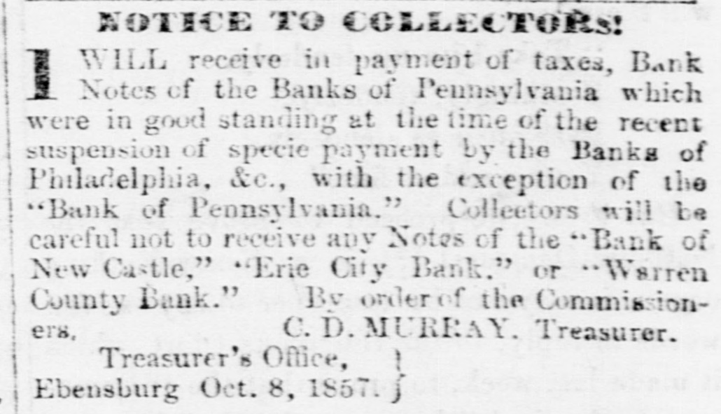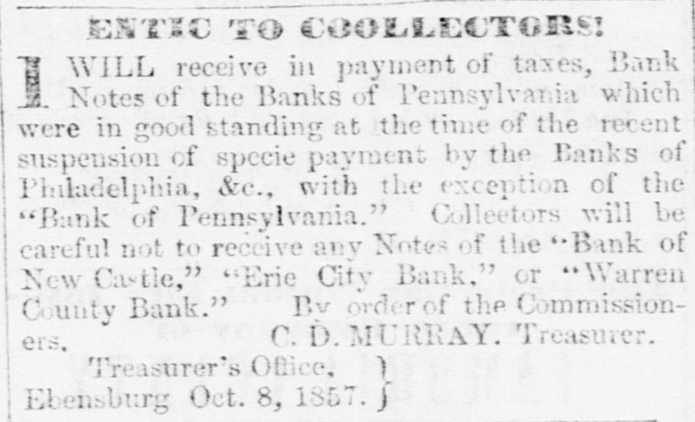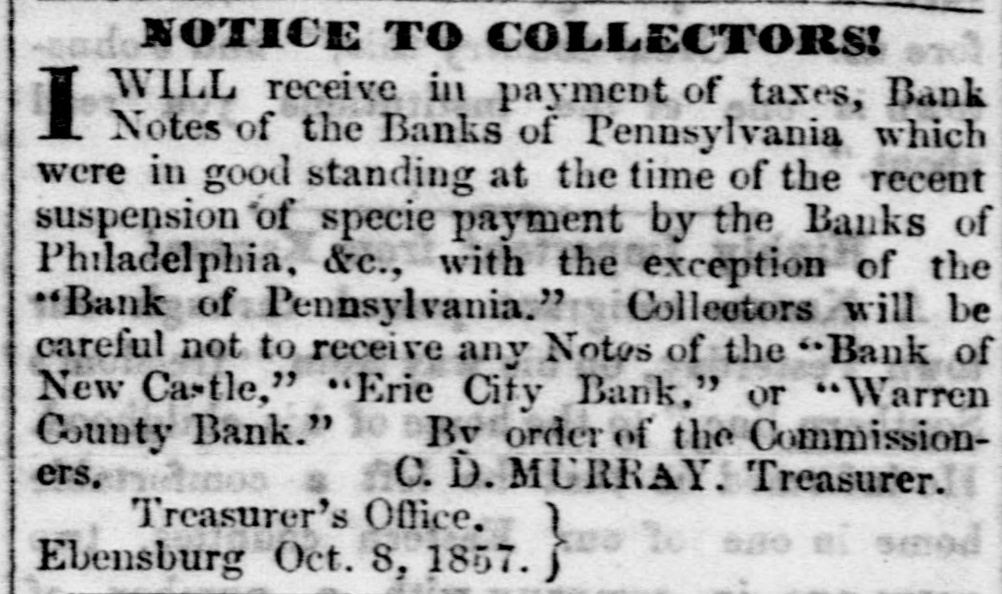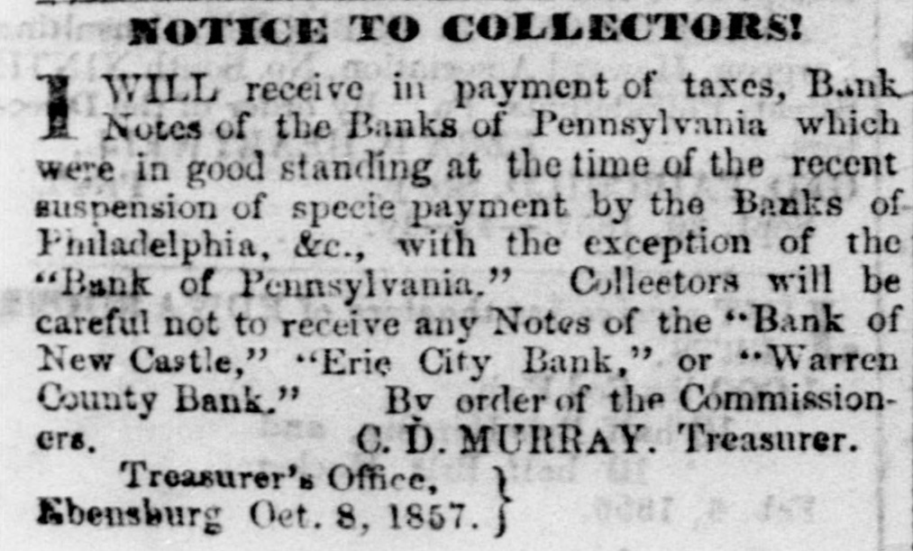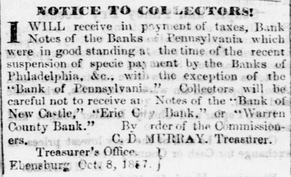 # NOTICE TO COLLECTORS! I WILL receive in payment of taxes, Bank Notes of the Banks of Pennsylvania which were in good standing at the time of the recent suspension of specie payment by the Banks of Philadelphia, &c., with the exception of the "Bank of Pennsylvania." Collectors will be careful not to receive any Notes of the "Bank of New Castle," "Erie City Bank," or "Warren County Bank." By order of the Commissioners. C. D. MURRAY. Treasurer. Treasurer's Office, Ebensburg Oct. 8, 1857.