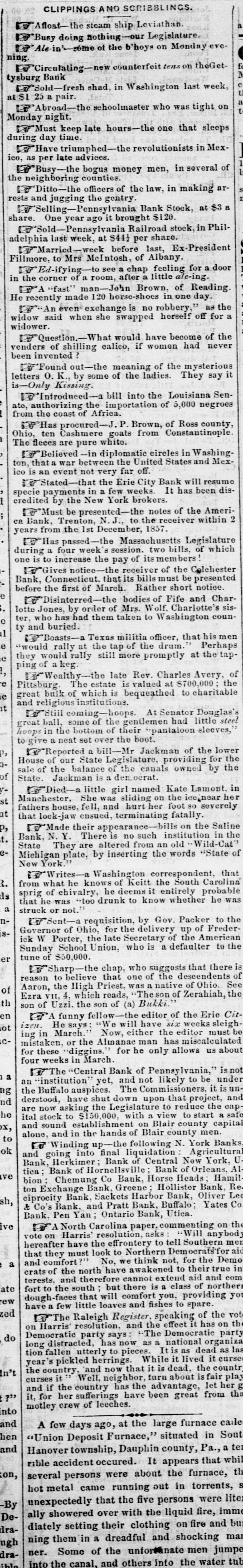 CLIPPINGS AND SCRIBBLINGS. Afloat-the steam ship Leviathan. Busy doing nothing-our Legislature. Ale-in-some of the b'hoys on Monday eve-ning. Circulating-new counterfeit tens on the Gettysburg Bank Sold-fresh shad, in Washington last week, at $1 25 a pair. Abroad-the schoolmaster who was tight on Monday night. Must keep late hours-the one that sleeps during day time. Have triumphed-the revolutionists in Mexico, as per late advices. Busy--the bogus money men, in several of the neighboring counties. Ditto-the officers of the law, in making arrests and jugging the gentry. Selling-Pennsylvania Bank Stock, at $3 a share. One year ago it brought $120. Sold-Pennsylvania Railroad stock, in Philadelphia last week, at $44½ per share. Married-week before last, Ex-President Fillmore, to Mrs McIntosh, of Albany. Ed-ifying to see a chap feeling for a door in the corner of a room, after a little ale-ing. A "fast" man-John Brown, of Reading. He recently made 120 horse-shoes in one day. "An even exchange is no robbery," as the widow said when she swapped herself off for a widower. Question. What would have become of the venders of shilling calico, if women had never been invented? Found out-the meaning of the mysterious letters O. K., by some of the ladies. They say it is-Only Kissing. Introduced-a bill into the Louisiana Senate, authorizing the importation of 5,000 negroes from the coast of Africa. Has procured-J. P. Brown, of Ross county, Ohio, ten Cashmere goats from Constantinople. The fleeces are pure whito. Believed in diplomatic circles in Washington, that a war between the United States and Mexico is an event not very far off. Stated-that the Erie City Bank will resume specie payments in a few weeks. It has been discredited by the New York brokers. Must be presented-the notes of the America Bank, Trenton, N. J., to the receiver within 2 years from the 1st December, 1857. Has passed-the Massachusetts Legislature during a four week's session, two bills, of which one is to increase the pay of its members! Gives notice-the receiver of the Colchester Bank, Connecticut, that its bills must be presented before the first of March. Rather short notice. Disinterred-the bodies of Fife and Charlotte Jones, by order of Mrs. Wolf. Charlotte's sister, who has had them taken to Washington county and buried. Boasts-a Texas militia officer, that his men "would rally at the tap of the drum." Perhaps they would rally still more promptly at the tapping of a keg. Wealthy-the late Rev. Charles Avery, of Pittsburg. The estate is valued at $700,000; the great bulk of which is bequeathed to charitable and religious institutions. Still coming-hoops. At Senator Douglas's great ball, some of the gentlemen had little steel hoops in the bottom of their "pantaioon sleeves," to give a neat set over the boot. Reported a bill-Mr Jackman of the lower House of our State Legislature, providing for the sale of the balance of the canals owned by the State. Jackman is a democrat. Died-a little girl named Kate Lamont, in Manchester. She was sliding on the ice near her fathers house, fell, and hurt her foot so severely that lock-jaw ensued, terminating fatally. Made their appearance-bills on the Saline Bank. N. Y. There is no such institution in the State They are altered from an old "Wild-Cat" Michigan plate, by inserting the words "State of New York." Writes-a Washington correspondent, that from what he knows of Keitt the South Carolina sprig of chivalry, he deems it entirely probable that he was "too drunk to know whether he was struck or not." Sent-a requisition, by Gov. Packer to the Governor of Ohio, for the delivery up of Frederick W Porter, the late Secretary of the American Sunday School Union, who is a defaulter to the tune of $50,000. Sharp-the chap, who suggests that there is reason to believe that one of the descendents of Aaron, the Iligh Priest, was a native of Ohio. See Ezra VII, 4, which reads, "The son of Zerahiah, the son of Uzzi. the son of (a) Bukki." A funny fellow-the editor of the Erie Citizen. He says: "We will have six weeks sleighing in March." Now, either the editor must be mistaken, or the Almanac man has miscalculated for these "diggins," for he only allows us about four weeks in March. The "Central Bank of Pennsylvania," is not an "institution" yet, and not likely to be under the Buffalo auspices. The Commissioners, it is understood, have shut down upon that project, and are now asking the Legislature to reduce the capital stock to $150,000, with a view to start a safe and sound establishment on Blair county capital alone, and in the hands of Blair county men. Winding up the following N. York Banks. and going into final liquidation: Agricultural Bank, Herkimer; Bank of Central New York, Utica; Bank of Hornellsville; Bank of Orleans, Albion; Chemung Co Bank, Horse Heads; Hamilton Exchange Bank, Greene; Hollister Bank, Reciprocity Bank, Sackets Harbor Bank, Oliver Lee & Co's Bank, and Pratt Bank, Buffalo; Yates Co. Bank, Pen Yan; Ontario Bank, Utica. A North Carolina paper, commenting on the vote on Harris' resolution, asks: "Will anybody hereafter have the effrontery to tell Southern men that they must look to Northern Democrats for aid and comfort?" No, we think not, for the Democrats of the north have awakened to their true interests, and therefore cannot extend aid and comfort to the south; but there is a class of northern dough-faces that will comfort you, providing you have a few little loaves and fishes to spare. The Raleigh Register, speaking of the vote on Harris' resolution, and the effect it has on the Democratic party says: "The Democratic party, long distracted, has now as a national organization fallen utterly to pieces. It is as dead as last year's pickled herrings. While it lived it cursed the country, and now that it is dead, the country curses it" Well, neighbor, turn about is fair play and if the country has the advantage, let her get it, for her sufferings have been great from that motley 