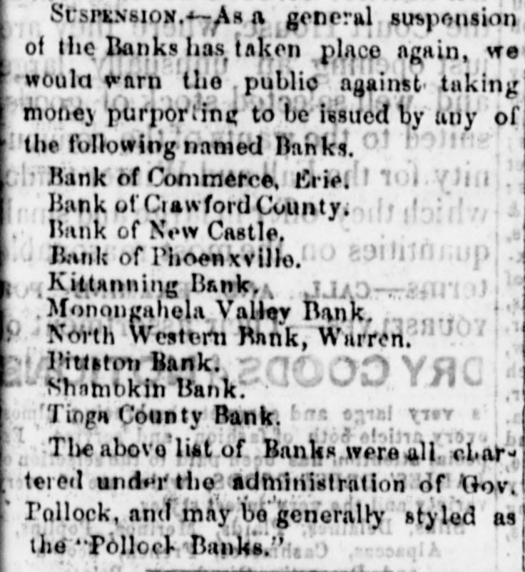 SUSPENSION. As a general suspension of the Banks has taken place again, we would warn the public against taking money purporting to be issued by any of boline the following named Banks. of 101 Bank of Commerce, Eriel ytin Bank of Crawford County: Bank of New Castle, no Bank of Phoenxville. Kittanning Bank Monongahela Valley Bank. North Western Bank, W17.1388007 Y.R.O (TOY Tinga County Bank. bas ogral The above list of Banks were all 77070 char tered under the administration of Gov. Pollock, and may be generally styled as the Pollock Banks.