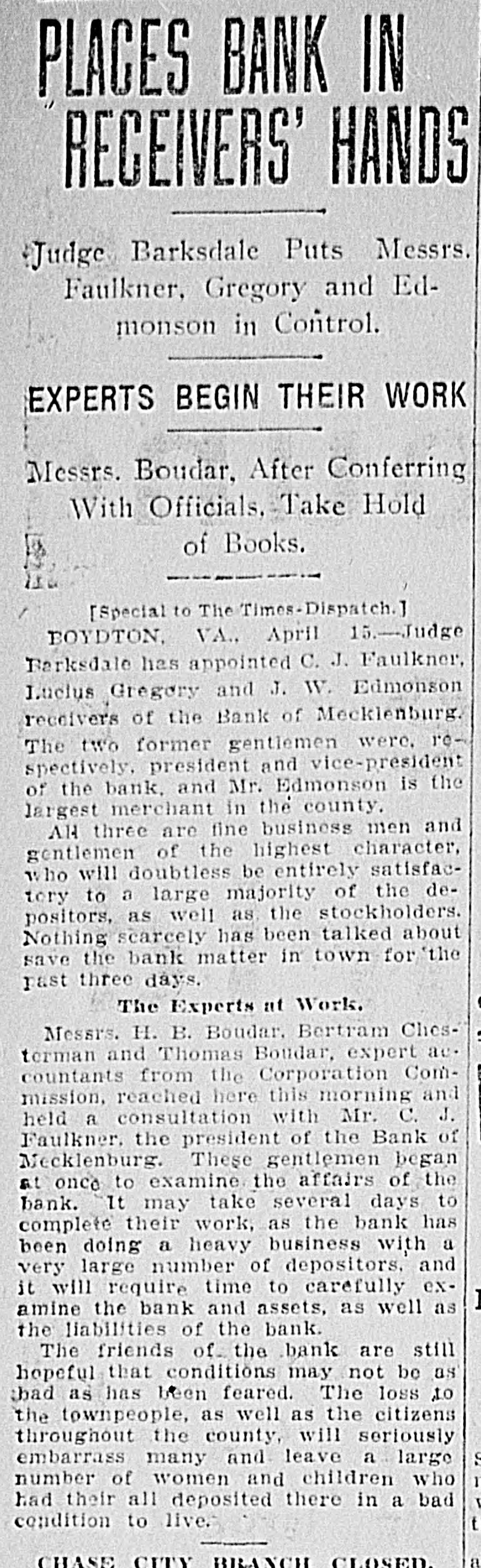 Virginia News. Miss Mary E. Sangster, sister of the late Judge James Sangster, of Fairfax, died at Ashland, on Monday last. The conference of the High School and College Association of Virginia met at the University of Virginia today and will continue through tom rrow. W. J. Quick, who succeeded Prof. A. M. Soule in charge of experimental work at the V. P. I. st Blacksburg, has tendered his resignation to take effect September 1. Mrs. E. P. Winston, of Hanover county, sister of Mrs. General Thomas L. Rosser, of CharJostesville, died yesterday at the University of Virginia Hospital, where she had been under treatment for two weeks. A piece of white oak, weighing twenty pounds, cut near Jefferson's home, "Monticello," was sent by express to Mr. Bryan. From this piece of oak will be made the gavel which will open the democratic national convention at Denver. Miss Eliza Lippet, daughter of the late Dr. C. E. Lippett, was married at her home at "Elmington," near Berryville, Wednesday night, to Bertram Fox, of London, England. Owing to the recent death of the bride's father the ceremony was very quiet. After the honeymoon in Canada the couple 8 will sail for London, their future home. The grand jury of the county circuit court at Boydtown, Va., yesterday afternoon reported five indicuments against E. W. Overbey, former cashier of the closed Bank of Mecklenburg. The jury last night returned four indictments against C. Haskins, assistant cashier of the branch bank at Chase City. A shortage of $120,000 of the funds of the Mecklenburg bank is alleged. At Carter's Run Bapt'st Church, Fauquier county yesterday, Miss Lucy Marshall Holtzclaw and Mr. Lindsay Crawley were married. The bride's attendants were Miss Claude McLaughlin, of f Americus, Ga.: Miss Grace Jones, of Doe Hill, Va.; Miss Grace Brooks, of Leesburg, Va., and Miss Lily Powers, of White Post, Va. The best man was Dr. R. M. Grimm, of Baltimore, and the ushers were Mr. V. H. Kellam, of e Norfolk; Prof. Le Roy Buckingham, of Warren, Obio, and Prof. R. J. Brandeng burg, of Morgan, Md. Tne ceremony was performed by Rev. F. R. Boston. The bride is the only child of Mr. and r Mrs. C. E. Holtzclaw. Mr. Crawley is 8 president of the State Agricultural College of Georgia, The annual meeting of the Virginia Bar Association will be held this year at Hut Springs, August 4 to 6, inclusive, d Secretary of War Taft will make the annual address, but his subject has not yet been stated. Other speakers will be Wyndham R. Meredith, president of the association, on "Federal Control of Intrastate Commerce;" William Lindsay, former United States Senator from Kentucky, on "The Man and the Corporation; Holmes Conrad, of Winchester, on "The Old Virginia County Court;" A. C. Gordon, of Staunton, on "The Legal Foundations of Socialism," and H. C. McDowell, judge of the United States District Court for Western district of Virginia, on "Some Misconceptions as to Federal Precedent."