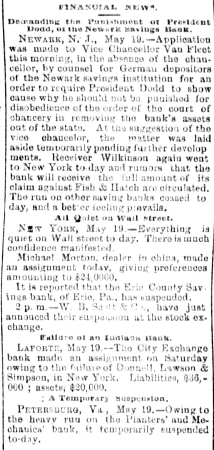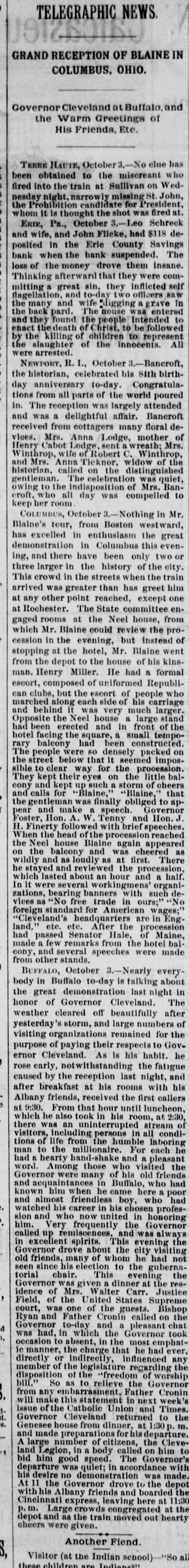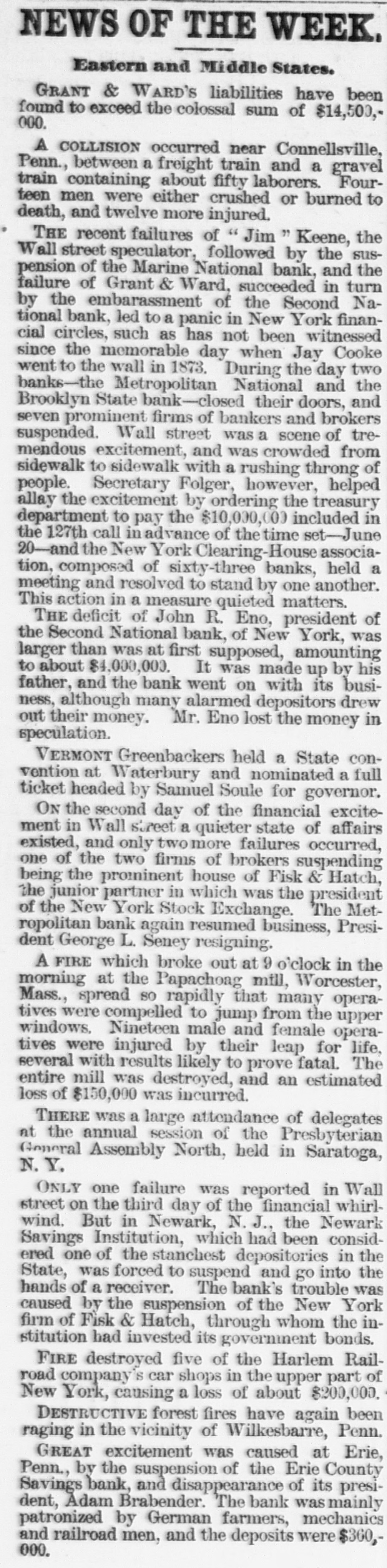 ties have been debating the question as to who should make the repairs. These investigations and debates have already cost ten times as much money as would have been required in the first place to make the repairs. In the meantime the pollution has been'constantly going on, not withstanding the protests of those who have to drink the water. How to Tell a Mugwump at Sight. Wash. Cor. Cincinnati Commercial Gazette. The great question with the mugwumps is one of eye-glasses. The republican wears spectacles or a pair of eye-glasses; the mugwump wears a single eye-glass. COLORED MEN THANK THE PRESIDENT.-A colored political club of Boston has adopted resolutions thanking President Cleveland for his humane sympathy in rebuking the democratic party of Hazelhurst. Miss., by withholding the commission of J. L. Meade, who was, the resolutions state, the head and front of the outrages committed on r race in Copiah county." NEW OFFICERS OF THE TYPOGRAPHICAL UNION.-The balloting in the Typographical Union convention in New York yesterday resulted in the election of the following: President, M. R. H. Witter, of St. Louis; vice presidents, Thomas J. Lacey, of Ottawa, and Chas. Jamewell, of Philadelphia; secretary and treas. urer, E. S. McIntosh, of Philadelphia; corresponding secretary, H. T. Elder, of Boston; chief organizer, D. P. Boyer, of Columbus, Ohio. SPEAKER HAINES REBUKED.-In the Illinois house yesterday Representative Graham moved to expunge from the journal all that part relating to senate appropriation bills. These bills were read and declared advanced by the speaker Monday in defiance of the wish of the house. Mr. Graham spoke on the motion, scoring SpeakerHaines severely for hisallegedarbitrary and illegal action Friday. Messrs.Parker & Boutel also denounced Speaker Haines-the latter very severely. The speaker, in justification, said his actions were for the purpose of restoringorder in the house. The matter was expunged from the journal with 5 negative votes. THE BOSTON BERRY TRAIN WRECKED.-The Boston berry train from Norfolk upward bound collided with a peninsula freight train below Middletown at 'clock m.yesterday and both engines and three freight care were totally wrecked and six others were damaged. Engineer Wm. Rushton, of the freight train, was instantly killed. Brakeman Hitch, of the same train, was severely hurt about the head, probably fatally. THE TYPOGRAPHICAL UNION.-At the Typographical Union convention in New York Monday, Chief Organizer Crawford reported that the 174 unions have a total membership of 18,000. The membership could have been largely increased if "rats' had been taken m. "Rats," said Mr. Crawford, "are without honor or manhood, and we have no room for them. President R. H. Witter advocated an international strike fund, and the suggestion was referred to a committee of five. The secretarytreasurer reported the receipts for the year to have been $10,442 and the expenditures $7,088. +@+ GOLD EXCITEMENT IN OREGON.-A dispatch from Portland, Oregon, says that the excitement over the discovery of gold mines in Josephine county is the greatest seen for many years. Prof. McNevin, an expert sent from San Francisco to investigate Big Yank ledge, reports an immense ledge of gold quartz. The excitement incident to the discovery has driven McNevin crazy, and he is now confined in the hotel. MR. HAYES SELLS HIS SALOON.-A dispatch from Omaha, Neb., says that ex-President Rutherford B. Hayes yesterday sold to Henry Osthoff and Garlichs & Johnson, for $14,000, the saloon property at 16th and California streets. The price paid is much below the value of the property. TRAGEDIES DUE TO BANK FAILURES.-At Erie, Pa., Monday, Frank Maguire, a demented depositor of the wrecked Erie County Savings bank, shot his twelve-year-old sister through her body and arm. He had brooded over the loss of his savings until his mind gave way. This is the fourth tragedy arising out of the .bank villainy. The girl will die. Monday morning Jesse Ebersole, one of the principal stockholders in the Humboldt bank, which suspended lately, died of brain-softening. His losses preyed upon his mind and caused his death. +@+ ANOTHER ATTEMPTED OUTRAGE IN MARYLAND.-A negro named Gaither on Sunday attempted to outrage the twelve-year-old daughter of Wm. Pickett, near Poplar Springs, Howard county, Md. He was frightened off before accomplishing his purpose, and although search parties have been looking for him since, he has not been captured. THE CINCINNATI TRAGEDY.-At the inquest in Cincinnati yesterday on the body of Henry Champlin the testimony of Mrs. Champlin showed that her son had frequently assaulted and beaten her, and that Monday night, in the darkness, he threw a chair at her bed, breaking the bedstead and the window. The coroner found that Dr. Loy's shooting was in selfdefense, and done with a view tointimidation instead of inflicting bodily injury. A STATE SENATOR CHARGED WITH BRIBERY.- Robert A. Gunn has put into the form of an affidavit his statement that State Senator Coggeshall, of New York, asked from him $500 to report favorably the bill to establish the college desired by the doctor and his school. SIX DAYS IN AN OPEN BOAT.-The captain of the bark Themis, his family and crew, in all sixteen persons, were six days and nights in a small open boat before being picked up. They were all in an exhausted condition, owing to the terrible nature of their sufferings. The Themis was bound from Havre for Miramichi, and was lost as a result of a collision with an iceberg. The steamship Missouri, from Boston, took the shipwrecked people to Liverpool. GEN. GRANT TO LEAVE NEW YORK THIS MONTH.-Dr. Douglas said last evening that the swelling outside and inside Gen. Grant's throat had so far abated that the parts were now examined with greater ease than at any timesince the general's serious illness. The patient this week has eaten solids-asparagus and steakin very moderate quantities. Dr. Douglas expects Gen. Grant w