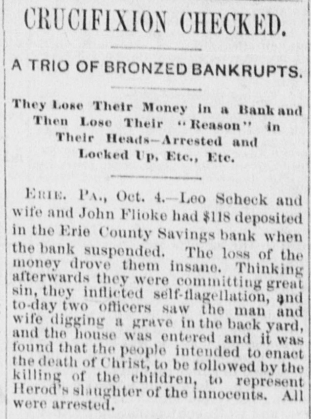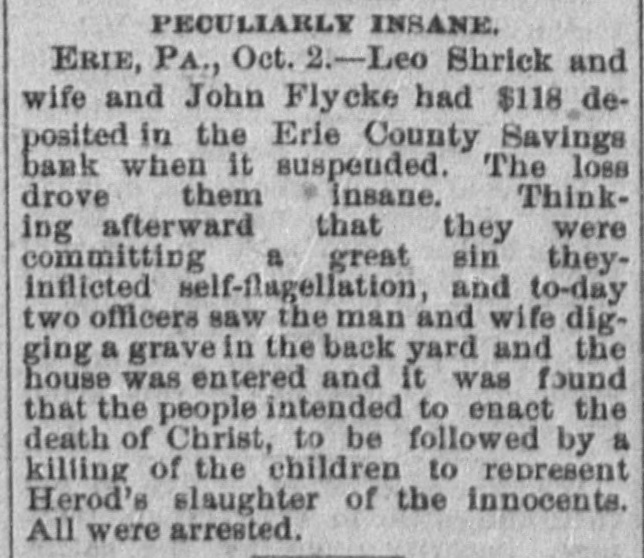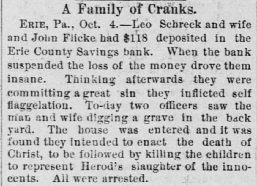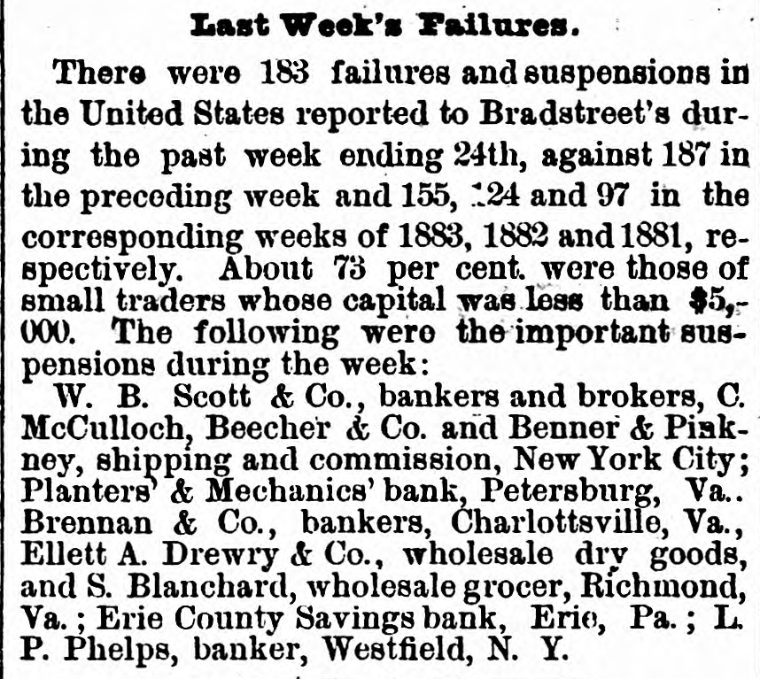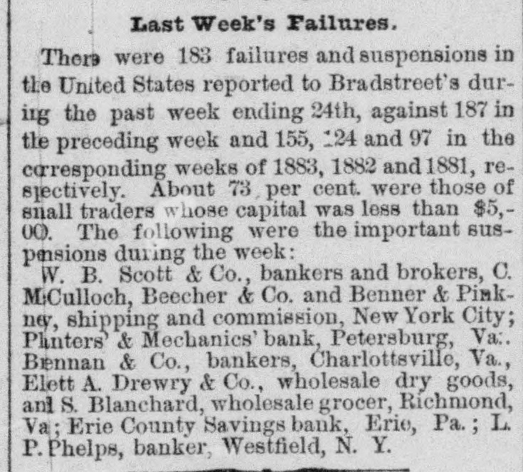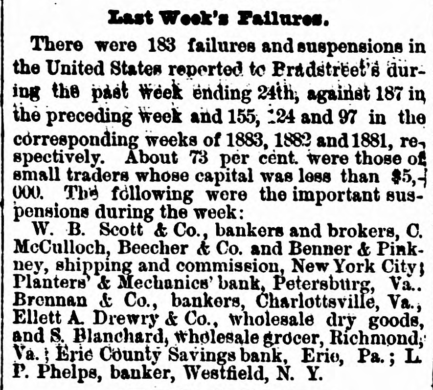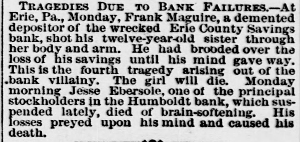 ties have been debating the question as to who should make the repairs. These investigations and debates have already cost ten times as much money as would have been required in the first place to make the repairs. In the meantime the pollution has been'constantly going on, not withstanding the protests of those who have to drink the water. How to Tell a Mugwump at Sight. Wash. Cor. Cincinnati Commercial Gazette. The great question with the mugwumps is one of eye-glasses. The republican wears spectacles or a pair of eye-glasses; the mugwump wears a single eye-glass. COLORED MEN THANK THE PRESIDENT.-A colored political club of Boston has adopted resolutions thanking President Cleveland for his humane sympathy in rebuking the democratic party of Hazelhurst. Miss., by withholding the commission of J. L. Meade, who was, the resolutions state, the head and front of the outrages committed on r race in Copiah county." NEW OFFICERS OF THE TYPOGRAPHICAL UNION.-The balloting in the Typographical Union convention in New York yesterday resulted in the election of the following: President, M. R. H. Witter, of St. Louis; vice presidents, Thomas J. Lacey, of Ottawa, and Chas. Jamewell, of Philadelphia; secretary and treas. urer, E. S. McIntosh, of Philadelphia; corresponding secretary, H. T. Elder, of Boston; chief organizer, D. P. Boyer, of Columbus, Ohio. SPEAKER HAINES REBUKED.-In the Illinois house yesterday Representative Graham moved to expunge from the journal all that part relating to senate appropriation bills. These bills were read and declared advanced by the speaker Monday in defiance of the wish of the house. Mr. Graham spoke on the motion, scoring SpeakerHaines severely for hisallegedarbitrary and illegal action Friday. Messrs.Parker & Boutel also denounced Speaker Haines-the latter very severely. The speaker, in justification, said his actions were for the purpose of restoringorder in the house. The matter was expunged from the journal with 5 negative votes. THE BOSTON BERRY TRAIN WRECKED.-The Boston berry train from Norfolk upward bound collided with a peninsula freight train below Middletown at 'clock m.yesterday and both engines and three freight care were totally wrecked and six others were damaged. Engineer Wm. Rushton, of the freight train, was instantly killed. Brakeman Hitch, of the same train, was severely hurt about the head, probably fatally. THE TYPOGRAPHICAL UNION.-At the Typographical Union convention in New York Monday, Chief Organizer Crawford reported that the 174 unions have a total membership of 18,000. The membership could have been largely increased if "rats' had been taken m. "Rats," said Mr. Crawford, "are without honor or manhood, and we have no room for them. President R. H. Witter advocated an international strike fund, and the suggestion was referred to a committee of five. The secretarytreasurer reported the receipts for the year to have been $10,442 and the expenditures $7,088. +@+ GOLD EXCITEMENT IN OREGON.-A dispatch from Portland, Oregon, says that the excitement over the discovery of gold mines in Josephine county is the greatest seen for many years. Prof. McNevin, an expert sent from San Francisco to investigate Big Yank ledge, reports an immense ledge of gold quartz. The excitement incident to the discovery has driven McNevin crazy, and he is now confined in the hotel. MR. HAYES SELLS HIS SALOON.-A dispatch from Omaha, Neb., says that ex-President Rutherford B. Hayes yesterday sold to Henry Osthoff and Garlichs & Johnson, for $14,000, the saloon property at 16th and California streets. The price paid is much below the value of the property. TRAGEDIES DUE TO BANK FAILURES.-At Erie, Pa., Monday, Frank Maguire, a demented depositor of the wrecked Erie County Savings bank, shot his twelve-year-old sister through her body and arm. He had brooded over the loss of his savings until his mind gave way. This is the fourth tragedy arising out of the .bank villainy. The girl will die. Monday morning Jesse Ebersole, one of the principal stockholders in the Humboldt bank, which suspended lately, died of brain-softening. His losses preyed upon his mind and caused his death. +@+ ANOTHER ATTEMPTED OUTRAGE IN MARYLAND.-A negro named Gaither on Sunday attempted to outrage the twelve-year-old daughter of Wm. Pickett, near Poplar Springs, Howard county, Md. He was frightened off before accomplishing his purpose, and although search parties have been looking for him since, he has not been captured. THE CINCINNATI TRAGEDY.-At the inquest in Cincinnati yesterday on the body of Henry Champlin the testimony of Mrs. Champlin showed that her son had frequently assaulted and beaten her, and that Monday night, in the darkness, he threw a chair at her bed, breaking the bedstead and the window. The coroner found that Dr. Loy's shooting was in selfdefense, and done with a view tointimidation instead of inflicting bodily injury. A STATE SENATOR CHARGED WITH BRIBERY.- Robert A. Gunn has put into the form of an affidavit his statement that State Senator Coggeshall, of New York, asked from him $500 to report favorably the bill to establish the college desired by the doctor and his school. SIX DAYS IN AN OPEN BOAT.-The captain of the bark Themis, his family and crew, in all sixteen persons, were six days and nights in a small open boat before being picked up. They were all in an exhausted condition, owing to the terrible nature of their sufferings. The Themis was bound from Havre for Miramichi, and was lost as a result of a collision with an iceberg. The steamship Missouri, from Boston, took the shipwrecked people to Liverpool. GEN. GRANT TO LEAVE NEW YORK THIS MONTH.-Dr. Douglas said last evening that the swelling outside and inside Gen. Grant's throat had so far abated that the parts were now examined with greater ease than at any timesince the general's serious illness. The patient this week has eaten solids-asparagus and steakin very moderate quantities. Dr. Douglas expects Gen. Grant w