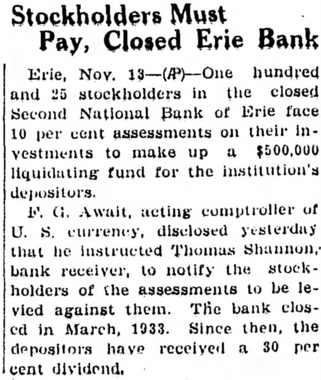 Stockholders Must Closed Erie Bank Pay, Erie, Nov. hundred and stockholders the closed Second National Bank Erie face assessments their make up $500,000 vestments Hquidating fund for the institution's Await, acting comptroller disclosed yesterday that he instructed Thomas Shannon, bank receiver, to notify the stockholders of the assessments them. The bank closagainst March, 1933. Since then, the depositors received 30 dividend.