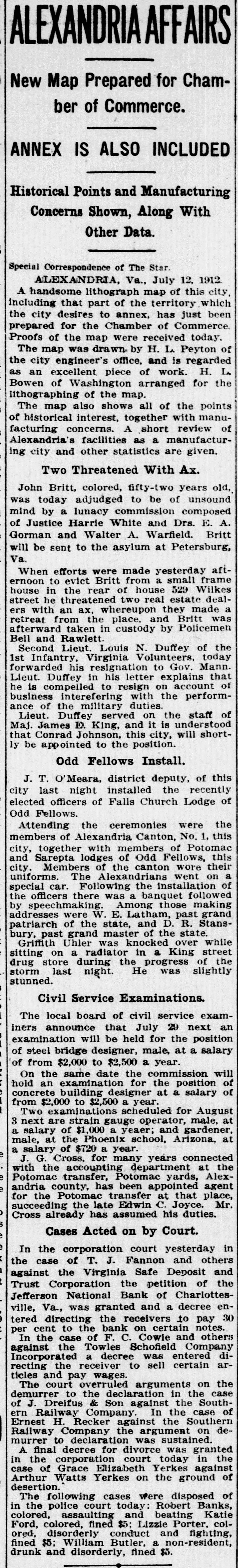 ALEXANDRIA AFFAIRS New Map Prepared for Chamber of Commerce. ANNEX IS ALSO INCLUDED Historical Points and Manufacturing Concerns Shown, Along With Other Data. Special Correspondence of The Star. ALEXANDRIA, Va., July 12. 1912 lithograph map of this city, that part of the the desires to annex, has including A handsome city territory just which been prepared for the Chamber of Commerce. Proofs of the map were received today. The map was drawn by H. L. Peyton of the city engineer's office, and is regarded L. an excellent piece of work. H. as Bowen of Washington arranged for the lithographing of the map. The map also shows all of the points of historical interest, together with manu- of facturing concerns. A short review Alexandria's facilities as a manufacturing city and other statistics are given. Two Threatened With Ax. John Britt, colored, fifty-two years old, was today adjudged to be of unsound mind by a lunacy commission composed of Justice Harrie White and Drs. E. Britt A. Gorman and Walter A. Warfield. will be sent to the asylum at Petersburg, Va. efforts were made yesterday frame aftevict Britt from a ernoon rear of house 529 house When in to the small estate Wilkes dealhe threatened two real made a street with an ax, whereupon they was ers from the place, and Britt afterward retreat taken in custody by Policemen Bell and Rawlett. Lieut. Louis N. Duffey of the Second Infantry, Virginia Volunteers. Mann. today 1st his resignation to Gov. that Lieut. in his letter to resign on he with the business forwarded is compelled Duffey interefering duties. explains account perform- of of ance of the military served on the staff Lieut. Duffey E. King, and it is understood that Maj. Conrad James Johnson, this city, will shortly be appointed to the position. Odd Fellows Install. J. T. O'Meara, district deputy, of this last night installed the recently of elected city officers of Falls Church Lodge Odd Fellows. the ceremonies were the of Alexandria with members of members Attending together Canton, Fellows, No. Potomac 1, this this city, and Sarepta lodges of Odd their Members of the canton wore city. The Alexandrians went on of a uniforms. car. Following the installation followed special officers there was a banquet making the speechmaking. Among those grand by were W. E. Latham, past Stansaddresses patriarch of the state, and D. state. R. past grand master of the bury, Griffith Uhler was knocked over street while on a radiator in a King of the sitting store during the progress stunned. storm drug last night. He was slightly Civil Service Examinations. board of civil service examthat July 29 next an iners The announce local position examination will be held for the of steel bridge designer, male, at a salary of from $2,000 to $2,500 a year. the same date the commission will of hold On an examination for the position salary of concrete building designer at a from $2,000 to $2,500 a scheduled year. for August Two examinations strain gauge operator, male, at 3 next are of $1,000 a yeaer; and gardener, at male, a salary at the Phoenix school, Arizona, e a J. salary G. Cross, of $720 for a year. many years connected at the department e with the transfer, accounting Potomac yards, agent AlexPotomac county, has been appointed place, andria the Potomac transfer at Joyce. that Mr. succeeding for the late Edwin C. duties. Cross already has assumed his Cases Acted on by Court. In the corporation court yesterday in case of T. J. Fannon and others the the Virginia Safe Deposit and the against Trust Corporation petition Charlottes- of the Jefferson National Bank of enwas granted and a 30 ville, Va., certain decree pay tered directing the receivers to notes. to the bank on others per cent case of F. C. Cowie and the Towles Schofield dia decree was arIncorporated against In the entered certain Company recting the receiver to sell ticles and pay overruled wages. arguments on the & Son demurrer The court to the declaration in the the South- case against of J. Railway Dreifus Company. In the Southern case of ern Ernest H. Recker against the deCompany the argument on declaration was decree for divorce was the court Railway murrer A final to today sustained. granted in in Elizabeth Yerkes of case Watts Yerkes on the Arthur the of corporation Grace ground against desertion. following cases were disposed Banks, of The the police court today: Robert Katie in assaulting and beating colored, colored, fined $5: Lizzie Porter, fighting, colFord, disorderly conduct and fined ored, $5: William Butler, a non-resident, drunk and disorderly, fined $5.