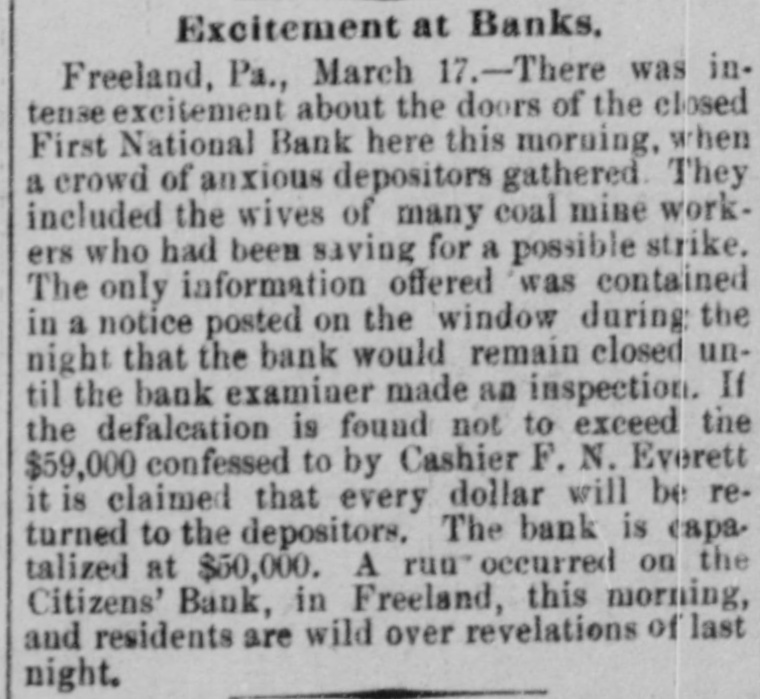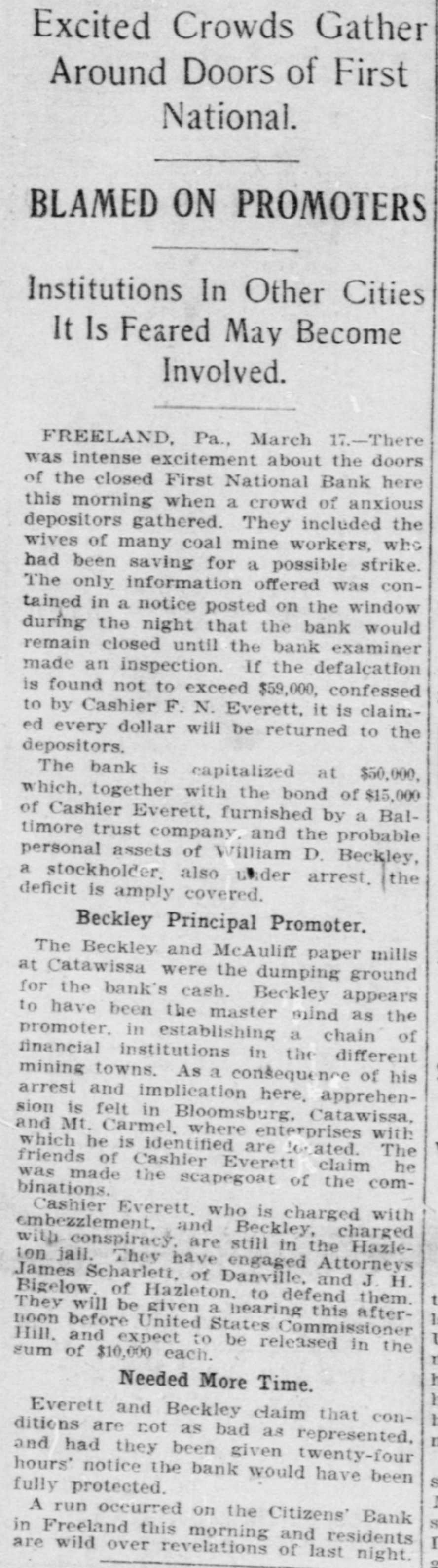 Excited Crowds Gather Around Doors of First National. BLAMED ON PROMOTERS Institutions In Other Cities It Is Feared May Become Involved. FREELAND, Pa., March 17.-There was intense excitement about the doors of the closed First National Bank here this morning when a crowd of anxious depositors gathered. They included the wives of many coal mine workers, who had been saving for a possible strike. The only information offered was contained in a notice posted on the window during the night that the bank would remain closed until the bank examiner made an inspection. If the defalcation is found not to exceed $59,000. confessed to by Cashier F. N. Everett. it is claimed every dollar will be returned to the depositors. The bank is capitalized at $50,000. which, together with the bond of $15,000 of Cashier Everett, furnished by a Baltimore trust company, and the probable personal assets of William D. Beckley, a stockholder. also Lider arrest. the deficit is amply covered. Beckley Principal Promoter. The Beckley and McAuliff paper mills at Catawissa were the dumping ground for the bank's cash. Beckley appears to have been the master mind as the promoter, in establishing a chain of financial institutions in the different mining towns, As a consequence of his arrest and implication here. apprehension is felt in Bloomsburg, Catawissa, and Mt. Carmel, where enterprises with which he is identified are to lated. The friends of Cashier Everett claim he was made the scapegoat of the combinations. Cashier Everett. who is charged with embezzlement, and Beckley, charged are still in They have James ton with jail. conspiracy, engaged the Attorneys HazleScharlett. of Danville, and J. H. Bigelow. of Hazleton. to defend them. t They will be given a hearing this afternoon before United States Commissioner Hill. and expect to be released in the sum of $10,000 each. Needed More Time. Everett and Beckley claim that are not as bad as II and ditions had represented, conthey been given twenty-four hours' notice the bank would have been fully protected. A run occurred on the Citizens' Bank S in Freeland this morning and residents I are wild over revelations of last night. 2