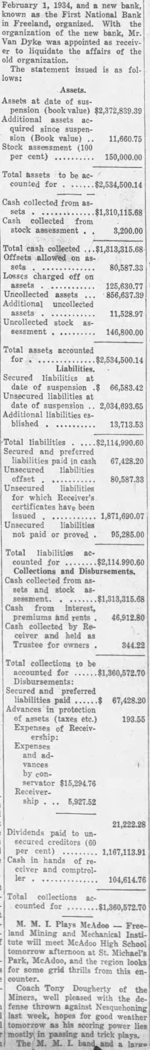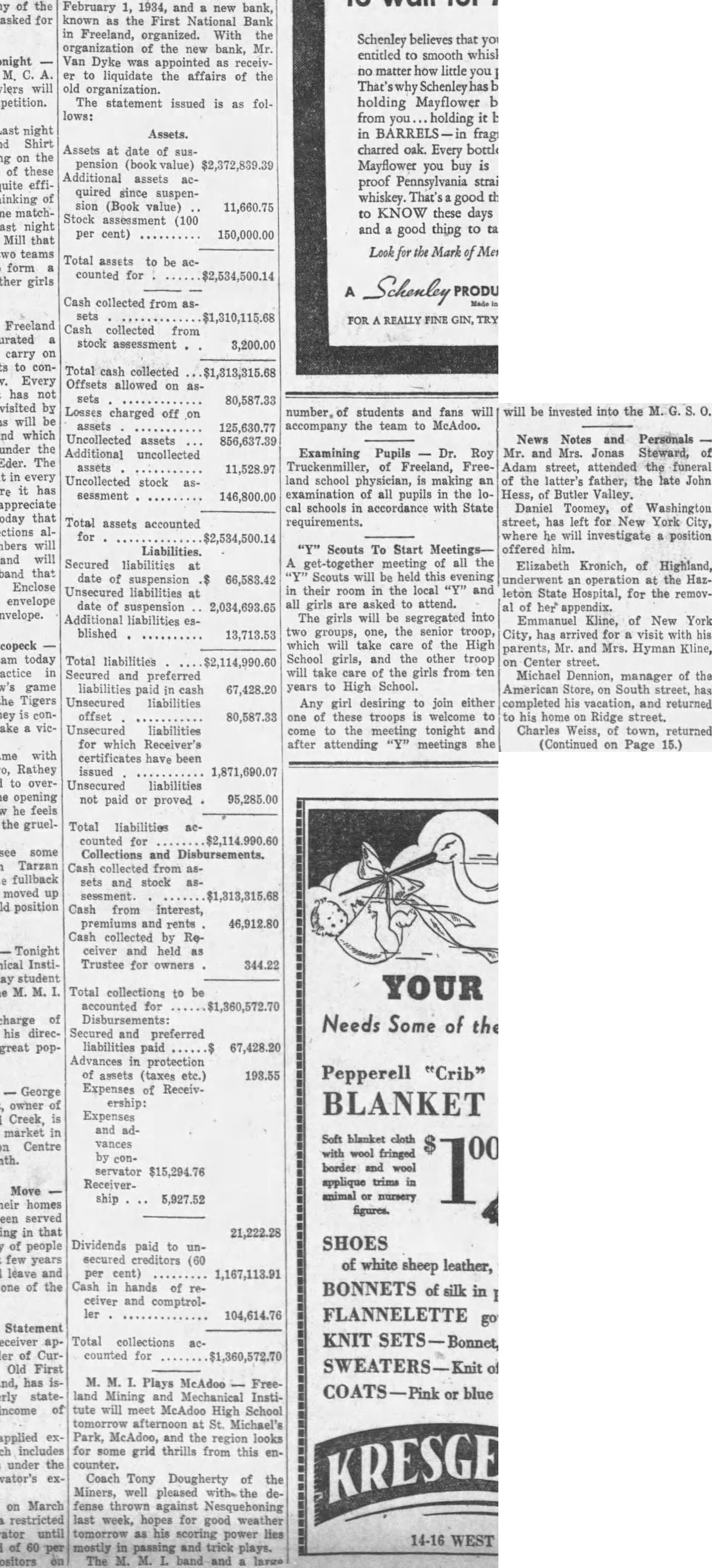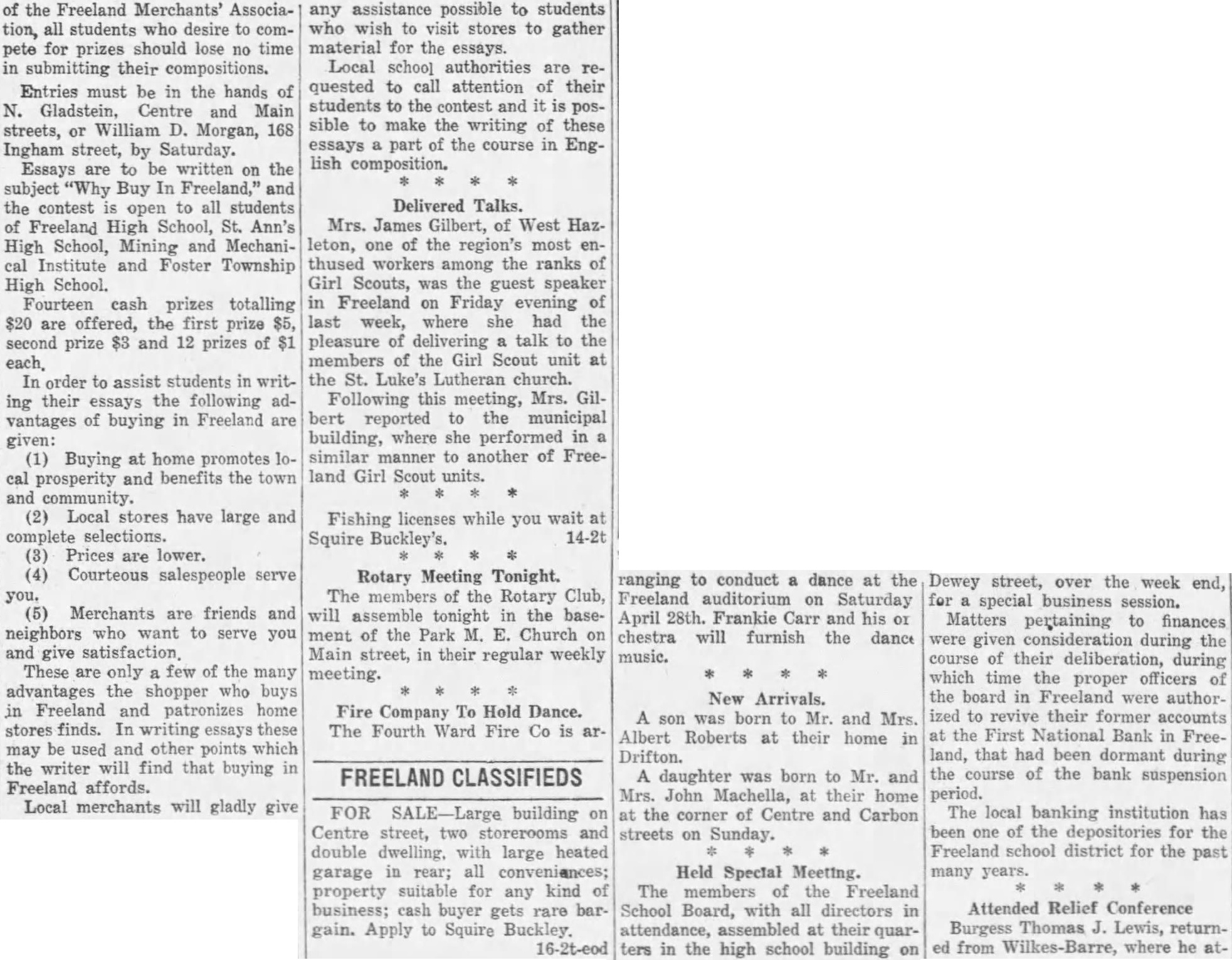 of the Freeland Merchants' Association, all students who desire to compete for prizes should lose no time in submitting their compositions. Entries must be in the hands of N. Gladstein, Centre and Main streets, or William D. Morgan, 168 Ingham street, by Saturday. Essays are to be written on the subject "Why Buy In Freeland," and the contest open to all students of Freeland High School, St. Ann's High School, Mining and Mechanical Institute and Foster Township High School. Fourteen cash prizes totalling $20 are offered, the first prize $5, second prize $3 and 12 prizes of $1 each, In order to assist students in writing their essays the following advantages of buying in Freeland are given: (1) Buying at home promotes local prosperity and benefits the town and community. (2) Local stores have large and complete selections. (3) Prices are lower. (4) Courteous salespeople serve you. (5) Merchants are friends and neighbors who want to serve you and give satisfaction, These are only a few of the many advantages the shopper who buys in Freeland and patronizes home stores finds. In writing essays these may be used and other points which the writer will find that buying in Freeland affords. Local merchants will gladly give any assistance possible to students who wish to visit stores to gather material for the essays. Local school authorities are requested to call attention of their students to the contest and it is possible to make the writing of these essays part of the course in English composition. Delivered Talks. Mrs. James Gilbert, of West Hazleton, one of the region's most enthused workers among the ranks of Girl Scouts, was the guest speaker in Freeland on Friday evening of last week, where she had the pleasure of delivering a talk to the members of the Girl Scout unit at the St. Luke's Lutheran church. Following this meeting, Mrs. Gilbert reported to the municipal building, where she performed in similar manner to another of Freeland Girl Scout units. Fishing licenses while you wait at Squire Buckley's. 14-2t Rotary Meeting Tonight. The members of the Rotary Club, will assemble tonight in the basement of the Park M. E. Church on Main street, in their regular weekly meeting. Fire Company To Hold Dance. The Fourth Ward Fire Co is ar- FREELAND CLASSIFIEDS FOR SALE-Large building on Centre street, two storerooms and double dwelling, with large heated garage in rear; all conveniances; property suitable for any kind of business; cash buyer gets rare bargain. Apply to Squire Buckley. 16-2t-eod ranging to conduct a dance at the Freeland auditorium on Saturday April 28th. Frankie Carr and his or chestra will furnish the dance music. New Arrivals. A son was born to Mr. and Mrs. Albert Roberts at their home in Drifton. A daughter was born to Mr. and Mrs. John Machella, at their home at the corner of Centre and Carbon streets on Sunday. Held Special Meeting. The members of the Freeland School Board, with all directors in attendance, assembled at their quarters in the high school building on Dewey street, over the week end, for special business session. Matters pertaining to finances were given consideration during the course of their deliberation, during which time the proper officers of the board in Freeland were authorized to revive their former accounts at the First National Bank in Freeland, that had been dormant during the course of the bank suspension period. The local banking institution has been one of the depositories for the Freeland school district for the past many years. Attended Relief Conference Burgess Thomas J. Lewis, returned from Wilkes-Barre, where he at-