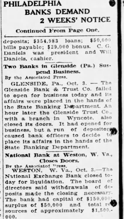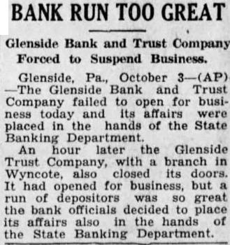 Two Shut-One Opened, But Calls in State Banking Department After Run Glenside, Pa., Oct. (/P)-The Glenside Bank Trust Company failed to open for business today, and its affairs were placed in the hands of the State Banking Department An hour later the Glenside Trust Company, with branch in Wyncote, also closed its doors. It had opened for but run of depositors caused bank to decide to place its affairs in the hands of the State Banking also.