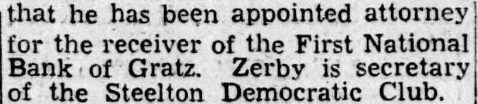 that he has been appointed attorney for the receiver of the First National Bank of Gratz. Zerby is secretary of the Steelton Democratic Club.