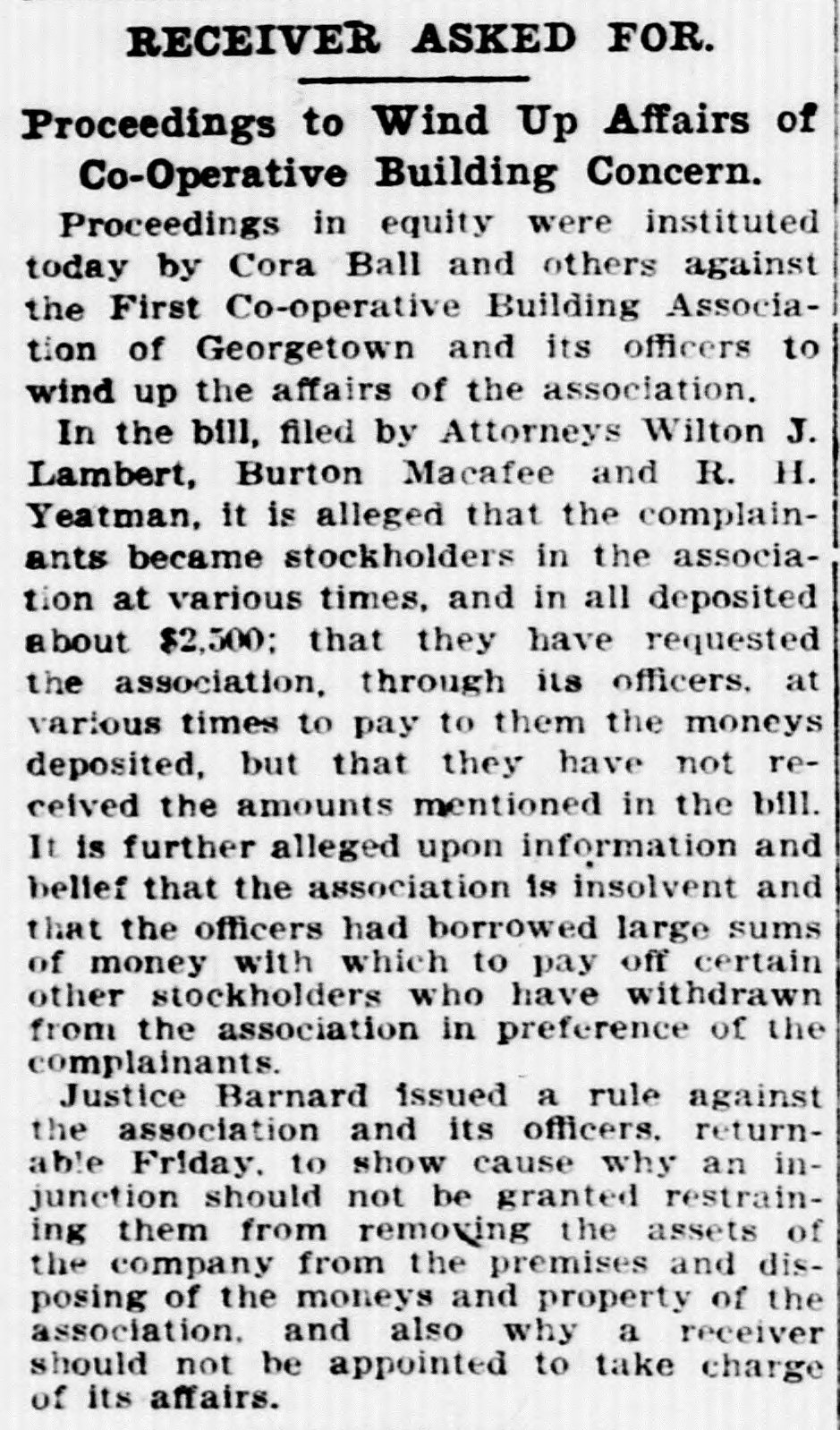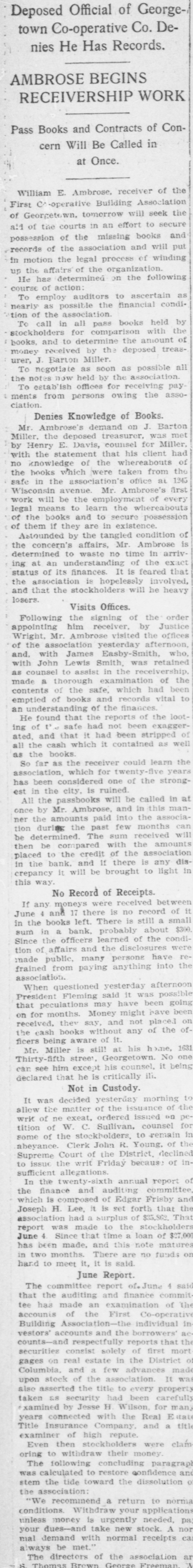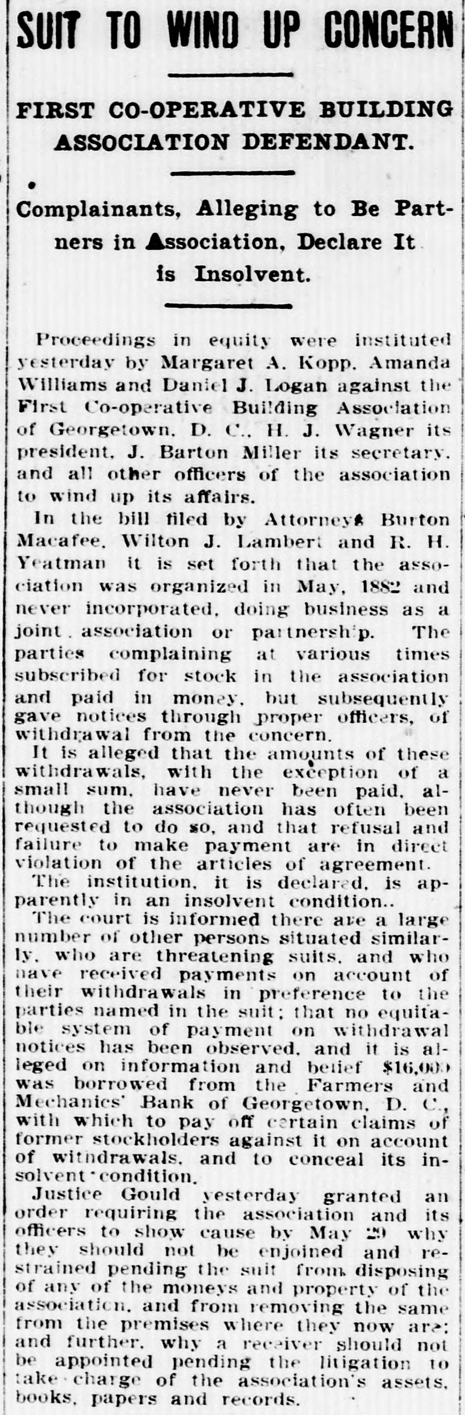 SUIT TO WIND UP CONCERN FIRST CO-OPERATIVE BUILDING ASSOCIATION DEFENDANT. Complainants, Alleging to Be Partners in Association. Declare It. is Insolvent. Proceedings in equity were instituted yesterday by Margaret A. Kopp. Amanda Williams and Daniel J. Logan against the First Co-operative Building Association of Georgetown. D. C., H. J. Wagner its president. J. Barton Miller its secretary. and all other officers of the association to wind up its affairs. In the bill filed by Attorney# Burton Macafee. Wilton J. Lambert and R. H. Yeatman it is set forth that the association was organized in May, 1882 and never incorporated, doing business as a joint. association or partnership. The parties complaining at various times subscribed for stock in the association and paid in money. but subsequently gave notices through proper officers, of withdrawal from the concern. It is alleged that the amounts of these withdrawals, with the exception of a small sum, have never been paid. although the association has often been requested to do so, and that refusal and failure to make payment are in direct violation of the articles of agreement. The institution, it is declared, is apparently in an insolvent condition.. The court is informed there are a large number of other persons situated similarly. who are threatening suits. and who have received payments on account of their withdrawals in preference to the parties named in the suit; that no equitable system of payment on withdrawal notices has been observed. and it is alleged on information and belief $16,000 was borrowed from the Farmers and Mechanics' Bank of Georgetown, D. C., with which to pay off certain claims of former stockholders against it on account of withdrawals. and to conceal its insolvent-condition. Justice Gould yesterday granted an order requiring the association and its officers to show cause by May 29 why they should not be enjoined and restrained pending the suit from disposing of any of the moneys and property of the association. and from removing the same from the premises where they now are: and further. why a receiver should not be appointed pending the litigation to take charge of the association's assets, books, papers and records.