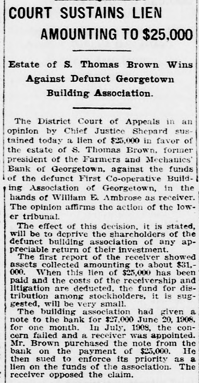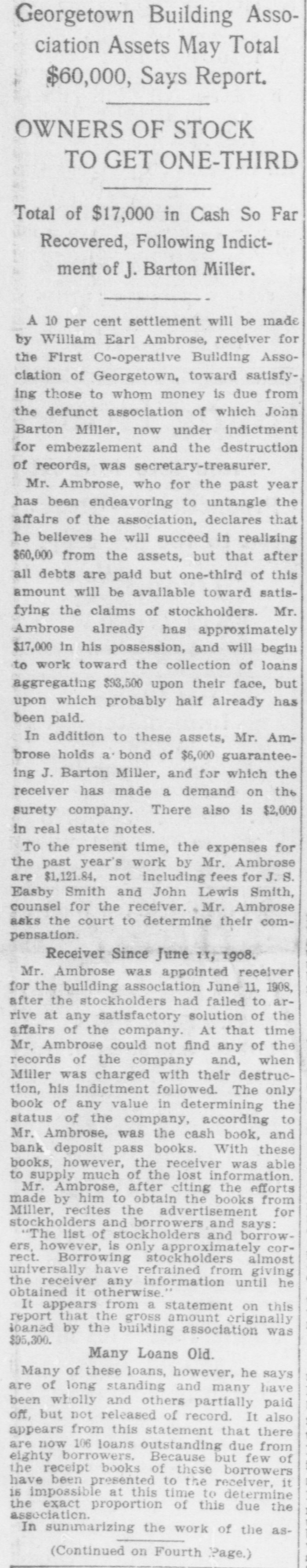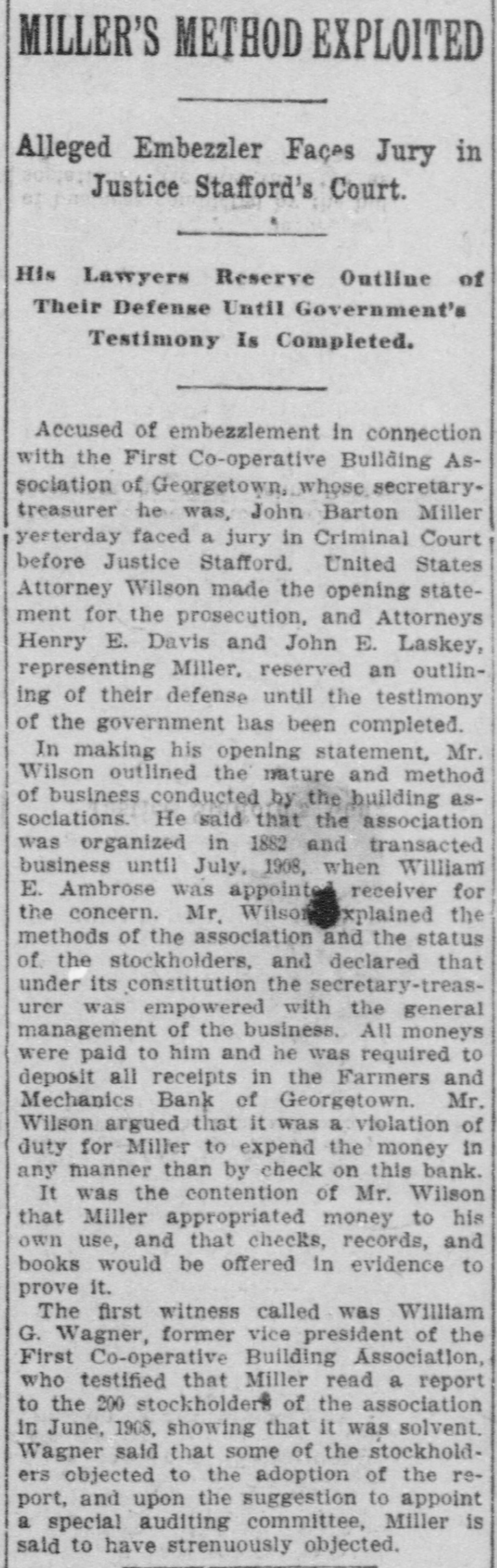 SUIT TO WIND UP CONCERN FIRST CO-OPERATIVE BUILDING ASSOCIATION DEFENDANT. Complainants, Alleging to Be Partners in Association. Declare It. is Insolvent. Proceedings in equity were instituted yesterday by Margaret A. Kopp. Amanda Williams and Daniel J. Logan against the First Co-operative Building Association of Georgetown. D. C., H. J. Wagner its president. J. Barton Miller its secretary. and all other officers of the association to wind up its affairs. In the bill filed by Attorney# Burton Macafee. Wilton J. Lambert and R. H. Yeatman it is set forth that the association was organized in May, 1882 and never incorporated, doing business as a joint. association or partnership. The parties complaining at various times subscribed for stock in the association and paid in money. but subsequently gave notices through proper officers, of withdrawal from the concern. It is alleged that the amounts of these withdrawals, with the exception of a small sum, have never been paid. although the association has often been requested to do so, and that refusal and failure to make payment are in direct violation of the articles of agreement. The institution, it is declared, is apparently in an insolvent condition.. The court is informed there are a large number of other persons situated similarly. who are threatening suits. and who have received payments on account of their withdrawals in preference to the parties named in the suit; that no equitable system of payment on withdrawal notices has been observed. and it is alleged on information and belief $16,000 was borrowed from the Farmers and Mechanics' Bank of Georgetown, D. C., with which to pay off certain claims of former stockholders against it on account of withdrawals. and to conceal its insolvent-condition. Justice Gould yesterday granted an order requiring the association and its officers to show cause by May 29 why they should not be enjoined and restrained pending the suit from disposing of any of the moneys and property of the association. and from removing the same from the premises where they now are: and further. why a receiver should not be appointed pending the litigation to take charge of the association's assets, books, papers and records.