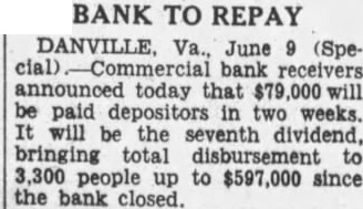 DANVILLE. Va., June 9 (Special) -Commercial bank receivers announced today that $79,000 will be paid depositors in two weeks. It will be the seventh dividend, bringing total disbursement to 3,300 people up to $597,000 since the bank closed.