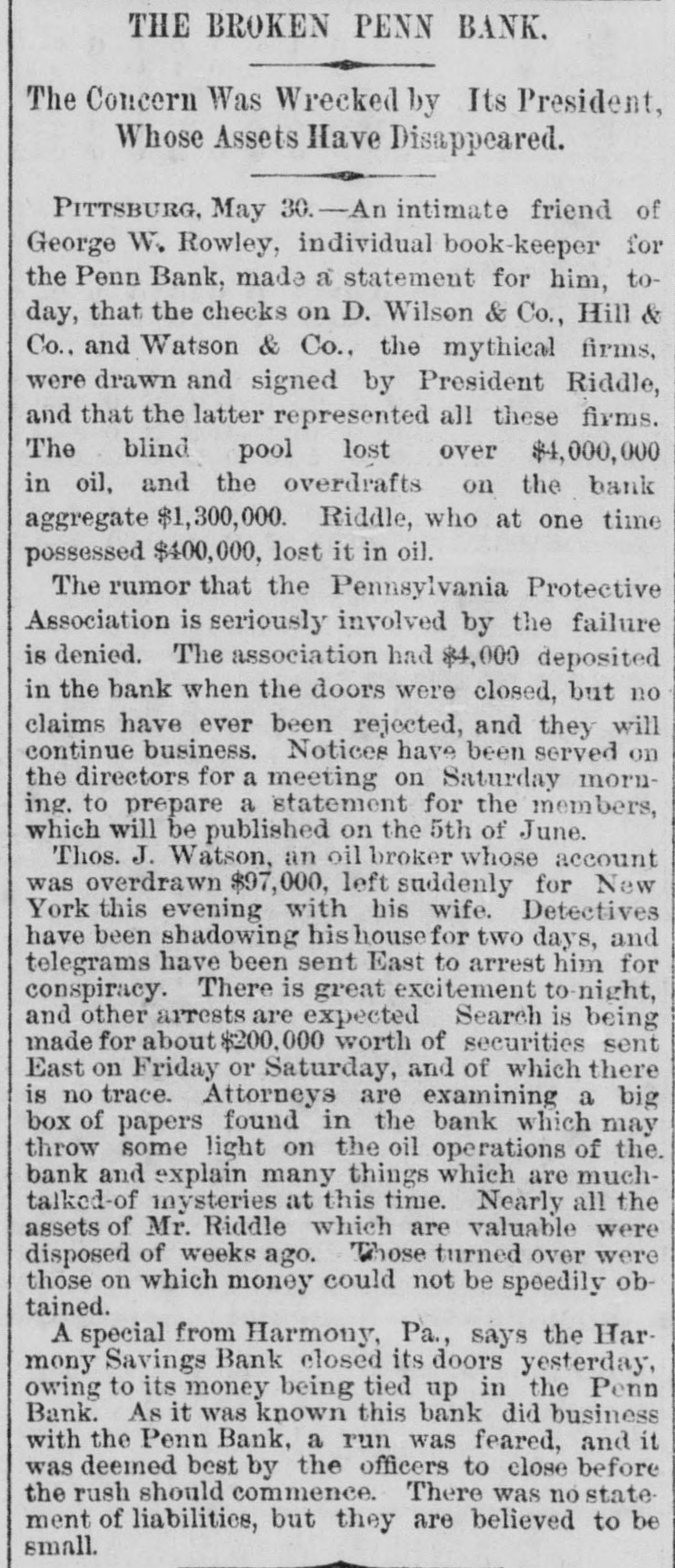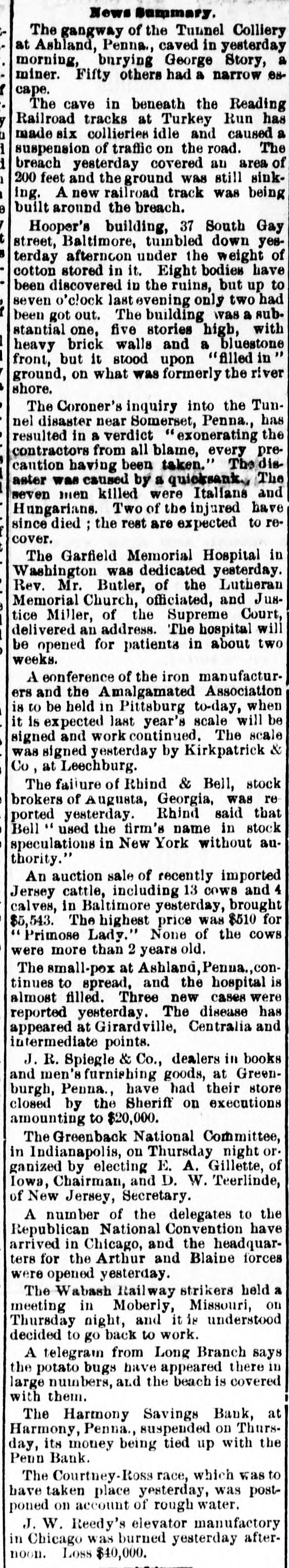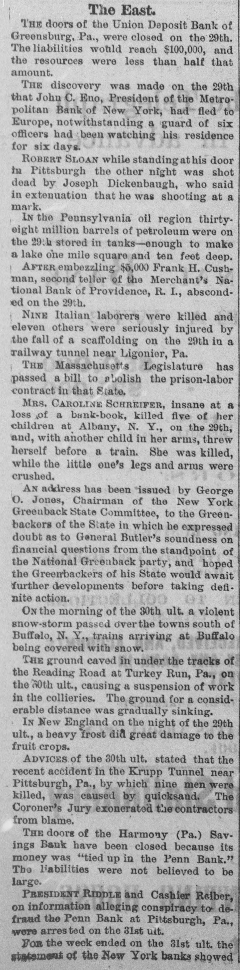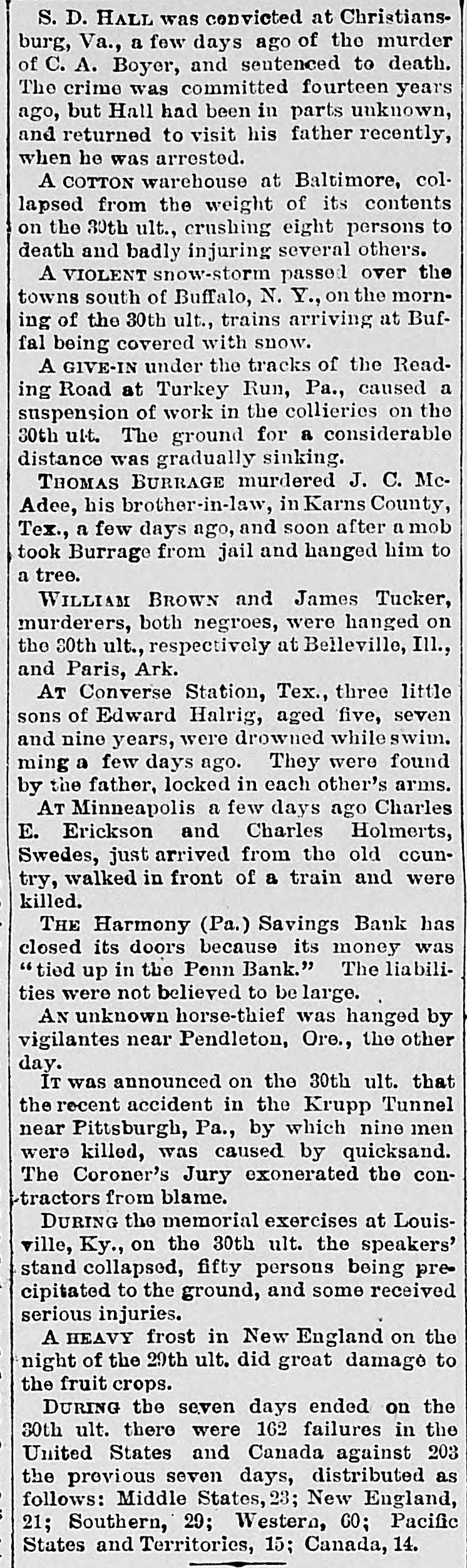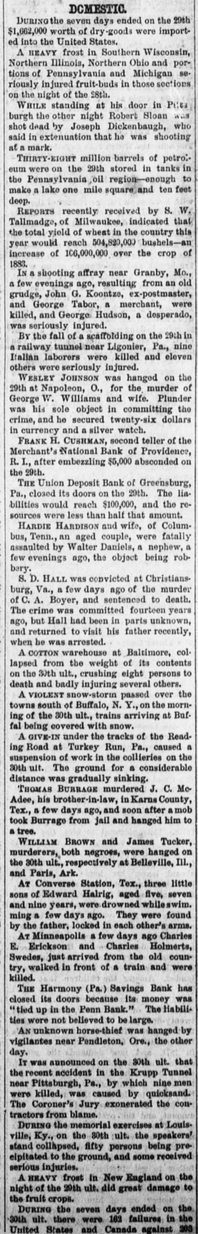News of the Week. The receipts at the places of amusement in New York city, from September last to May, is estimated at $8,000,000. Subscriptions for a cotton mill to be erected Aberdeen, Miss., to cost $100,000 were secured in that town in few hours last week. The Harmony Savings Bank, at Harmony, Penna., suspended on Thursday of last week, its money being tied up with the Penn Bank. Nearly four score young lawyers were turned loose from the Columbian University Law Department, Washington, on Tuesday night. The East London Aquarium was burned on Wednesday. Lions, bears, jackals and monkeys perished in the flames, and many animals were shot. There was a heavy snow storm last Friday morning along the route of the Lake Shore Railroad. The trains arriving in Buffalo were covered with snow. Mrs. J.N. Anders was burned to death by the explosion of a coal oil can, at Winchester, Va., on Wednesday evening, while she was starting a fire with coal oil. A faction of the United Presbyterians threaten to secede from the General Assembly, because that body did not condemn the use of musical instruments in the churches. The failure of Rhind & Bell, stock brokers of Augusta, Georgia, was reported last Friday. Rhind said that Bell used the firm's name in stock speculations in New York without au thority. A violent shock of earthquake occurred May 19 on the Island of Kishm, near the mouth of the Persian gulf. Twelve villages were destroyed, 200 persons killed and many others injured. Mr. John C. Eno, the absconding president of the Second National Bank of New York, was arrested Saturday at Quebec, on board the steamer on which he had taken passage for Europe. Gen. O. E. Babcock, who obtained considerable notoriety for his indictment in the whiskey ring fraudsand in the Harrington safe burglary, was drowned while boating in Flor: ida on Tuesday. A cattle "round-up" camp on Frenchman Creek, near the Nebraska and Colorado'line, was destroyed by a cloud burst on Thursday of last week, and eleven cowboys perished. The bodies of four have been recovered. Two masked men entered the house of Mrs. M. J. Truax, widow of the late Senator Truax, at Osborn, Mo., about 2 o'clock on Sunday morning, for the purpose of robbery, but finding no money, bound and gagged Mrs. Truax and outraged her. The National Line's new steamer America, which left Queenstown at 11 A. M. May 29, arrived off the New York bar at 10 clock Wednesday night. The time of passage (including the 4 hours and 22 minutes difference of time) was 6 days 15 hours and 22 minutes. In St. Louis on Wednesday John Staunton, a steamboat engineer, threw almost a gobletful of sulphuric acid over his wife as she lay in bed, inflicting fatal injuries. Her eyes were eaten out by the acid, and her face, neck, breast and shoulders were terribly burned. Henry B. Palmer, of New Orleans, who has swindled hundreds of victims all over the country, is under arrest in New York for en deavoring to entrap young women to pay him $50 to be employed as saleswomen for military chess game called "Grant's National Victory. Wm. Wallace, one of the most prominent business men of Stroudsburg, Pa., and president of the Stroudsburg Bank, failed on Wedneaday with liabilities of over $100,000. Itis charged that he had used $90,000 of the bank's money secured by paper only. The bank is still open. The London Telegraph says that the London dynamiters are directed by leaders in New York whom the American goverment should be asked not to harbor. The Republique Francaise of Paris severely condemns the United States for allowing dynamiters to plan outrages In America. Considerable excitement has been caused at Hammonton, N.J., by the discovery ofthe bodies of twenty-one infants buried in a plot of ground attached to the Mission Home, a sanitarium for ohildren conducted by Miss S. S. Nivison. It is charged that the death of the children resulted from improper food and want of care. In consequence of the dullness of the trade and the low prices of goods, the Ettricks, Mattoaco, Battersea and Swift Creek Manu facturing Companies, of Petersburg, Va., have decided to run their mills only on half time. These are four of the largest eotton factories in Petersburg, and give employment to several hundred hands. The convention of Exposition and Fair Managers, at St. Louis, on Wednesday adopted a resolution for the appointment of a com. mittee to report # plan of organization and management of world' fair to be held in 1892, to commemprate the four hundredth anniversary of the discovery of America by Columbus. St Louis was recommended as the place for holding the fair, A Remarkable American Dwarf, who is not in a show, is Abechem Sawyer, of Cedar Key, Fla. He is 40, inches high, weighs 39 pounds, and is 22 years old. He is well proportioned, very bright, and can make a good speech in high voice that sounds like child's He was once reporter on the Key West Democrat, and is now clerk in a grocery store. He has a sister 17 years old, who is just a quarter of an inch taller than himself. The mill of Wood & Thayer, in Montealm county, Michigan, was destroyed by boiler explosion last Friday afternoon. Wesley Ammen, Augustus Newman and man named Matthews were killed. Four men were injured, one of them named Charles Sauers, it feared fatally, It is reported that the wife of one of the men killed being crazed by the shock, committed suicide on Saturday night by cutting her throat. The Rev. Benjamin Bosworth Smith, of Kentucky, presiding Bishop of the Protestant Episcopal Church in this country, died of old age Saturday morning at his home in New York city, Though the Bishop would have ended his ninetieth your in 140 weeks more, his mental and bodily powers retained their normal condition until within the last month, when be attended a special meeting of the House of Bishops, held in New York, Rufus Minor, # noted bank robber, was AP: rested in New York last week for complicity in the robbery of $2700 from the Comme