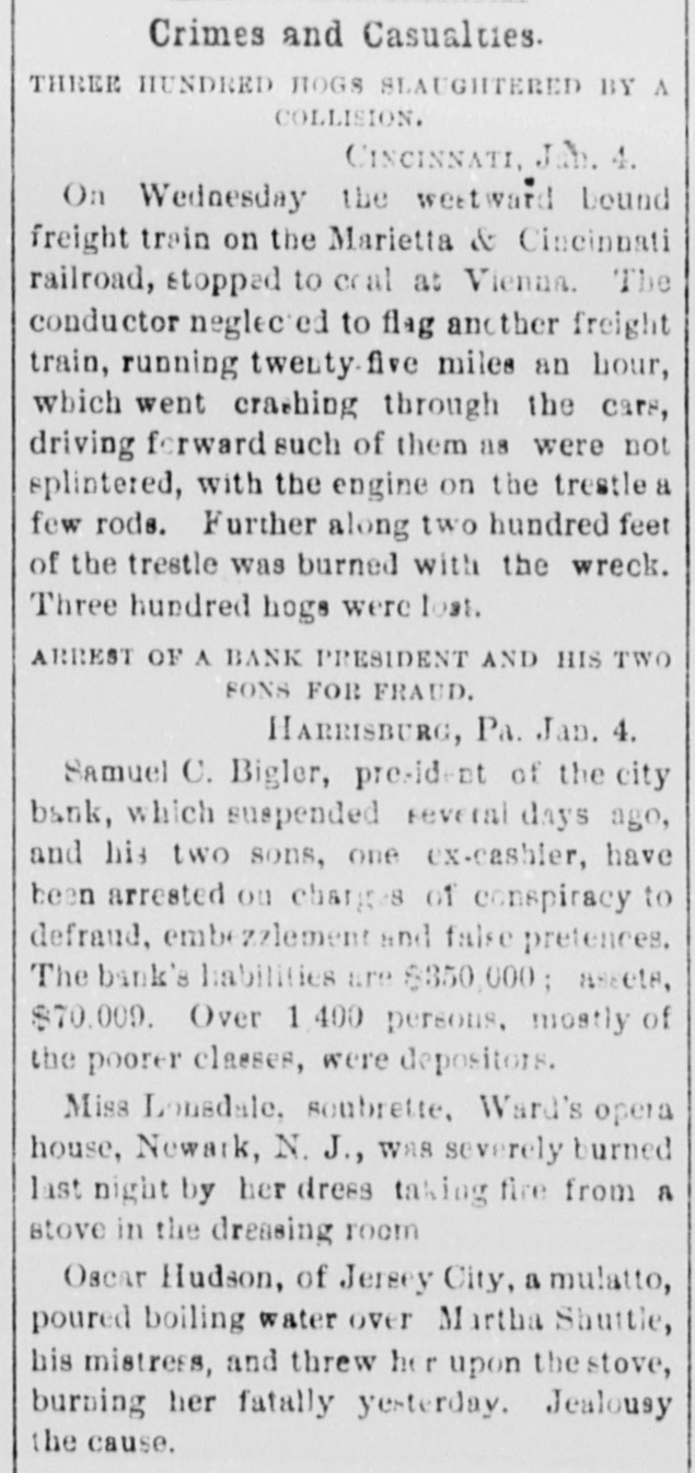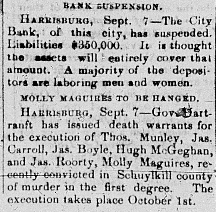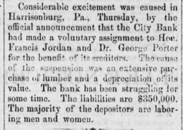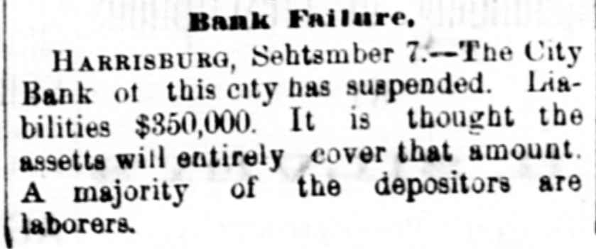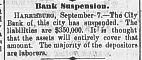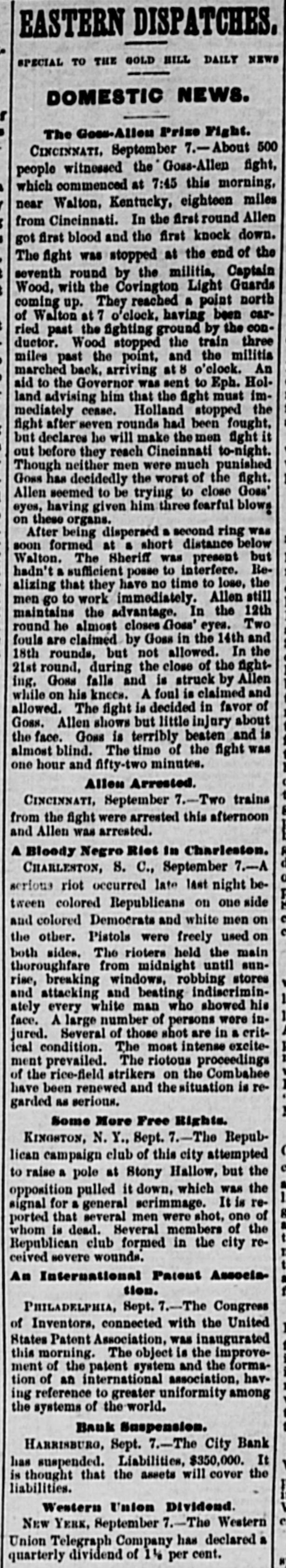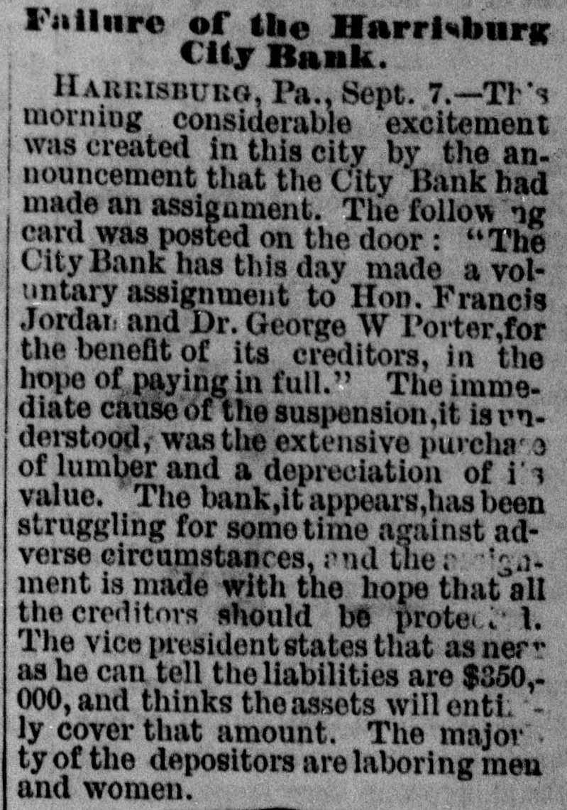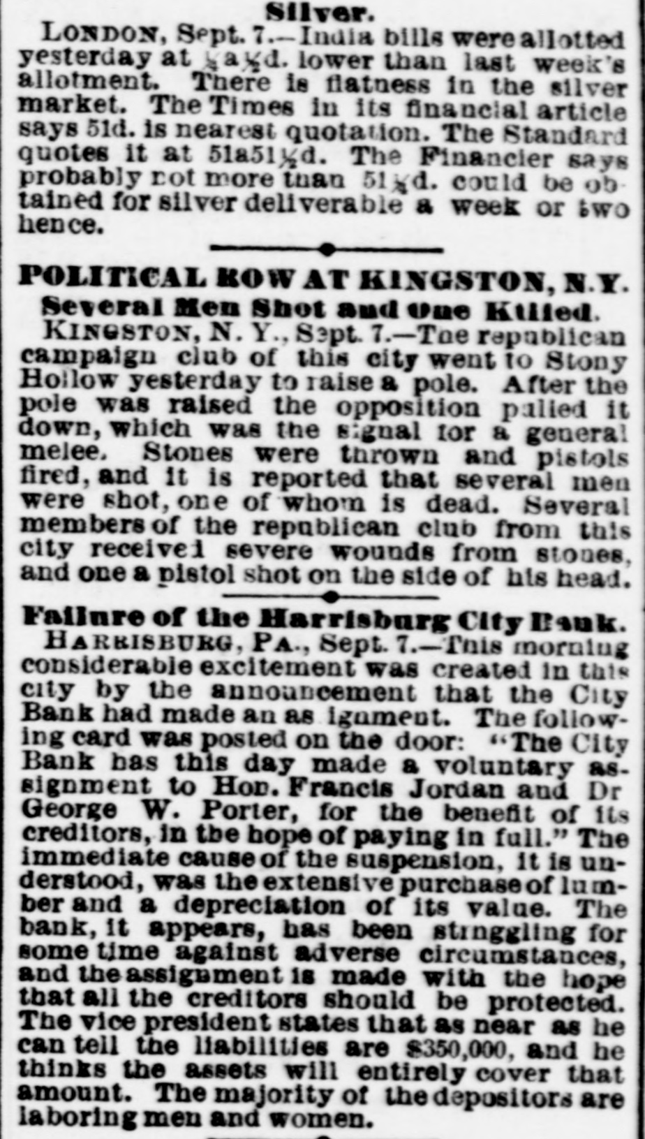 Silver. LONDON, Sept. I.-India bills were allotted yesterday at yayd. lower than last week's allotment. There is flatness in the silver market. The Times in its financial article says 51d. is nearest quotation. The Standard quotes it at 51a51ya. The Financier says probably not more than 51 (dd. could be ob tained for silver deliverable a week or two hence. POLITICAL KOW AT KINGSTON, N.Y. Several Men Shot and One Killed. KINGSTON, N. Y., Sept. 7.-Toe republican campaign club of this city went to Stony Hollow yesterday to raise a pole. After the pole was raised the opposition palied it down, which was the signal for a general melee. Stones were thrown and pistols fired, and it is reported that several men were shot, one of whom is dead. Several members of the republican club from this city receive severe wounds from stones, and one a pistol shot on the side of his head. Failure of the Harrisburg City Bank. HARRISBURG, PA., Sept. 7.-This morning considerable excitement was created in this city by the announcement that the City Bank had made an as ignment. The following card was posted on the door: "The City Bank has this day made a voluntary assignment to Hon. Francis Jordan and Dr George W. Porter, for the benefit of its creditors, in the hope of paying in full." The immediate cause of the suspension, it is understood, was the extensive purchase of lu mber and a depreciation of its value. The bank, it appears, has been strnggling for some time against adverse circumstances, and the assignment is made with the hope that all the creditors should be protected. The vice president states that as near as he can tell the liabilities are $350,000, and he thinks the assets will entirely cover that amount. The majority of the depositors are laboring men and women.