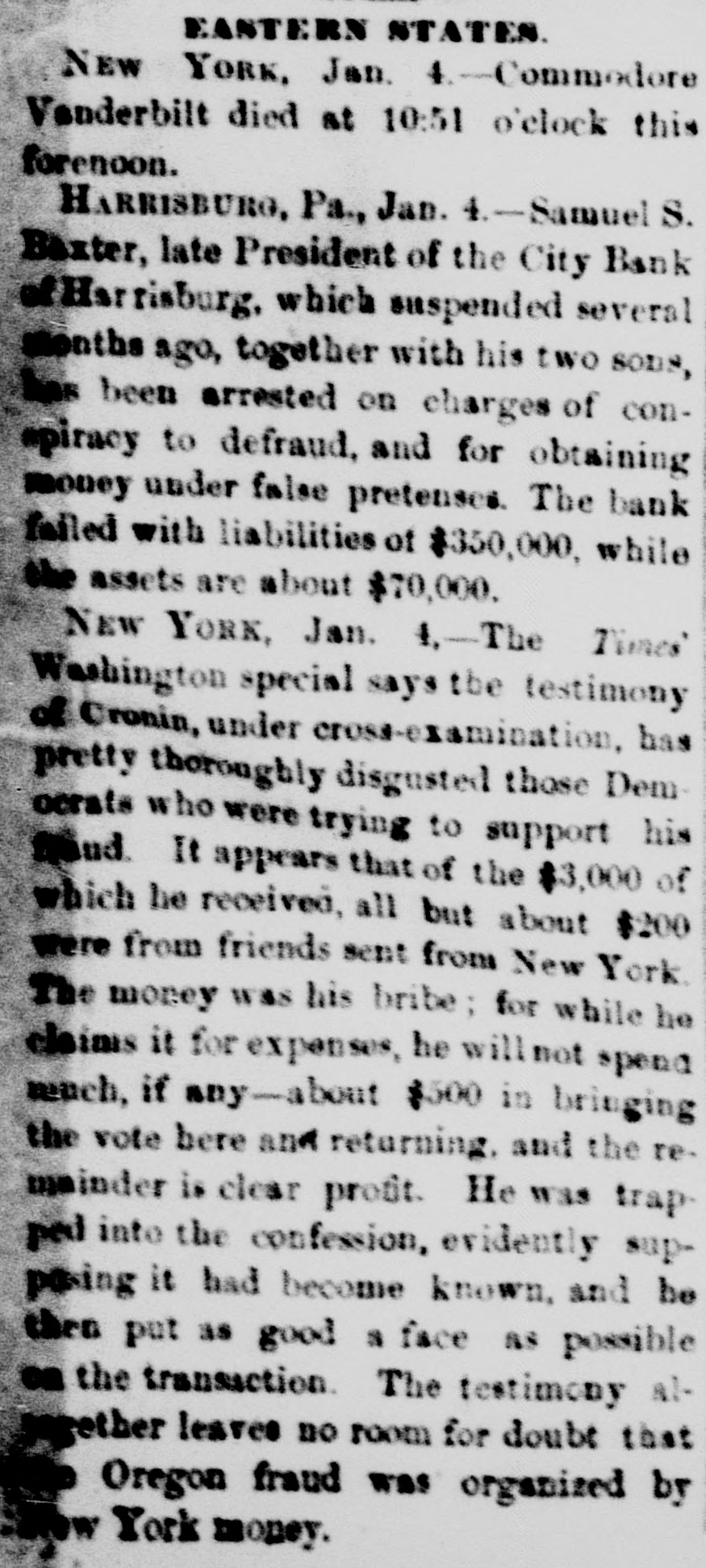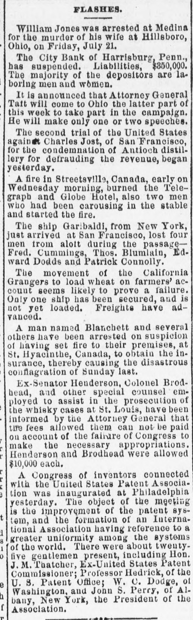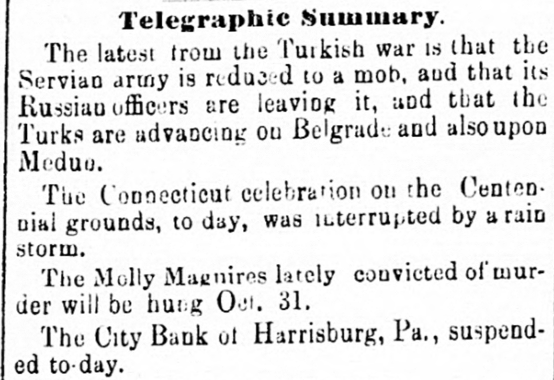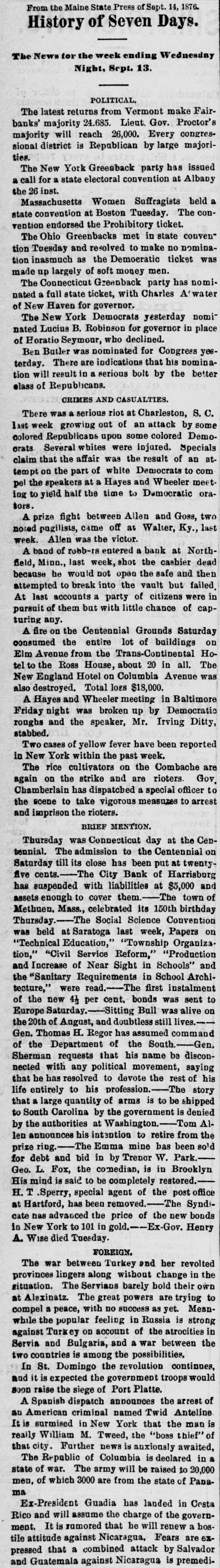 CURRENT NEWS. EAST. The Connecticut Democratic State Convention, held on the 6th, nominated the following ticket: For Governor, Richard D. Hubbard; Lieutenant-Governor, Francis B. Loomis: Secretary of State, Dwight L. Moore; Treasurer, Edwin A. Buck: Comptroller, Charles C. Hubbbard; Electors at Large, Gov. Charles R. Ingersoil and General William B. Franklin. The Massachusetts Democratic State Convention. held on the 6th, nominated the following ticket: For Governor, Charles Francis Adams; Lieutenant-Governor,Wil lian R. Plunkett: Secretary of State, Edwin H. Lathrop; Treasurer, Weston Howland; Auditor, John E. Fitzgerald: Attorney. General, Richard Olney. Ex-Governor Gaston heads the electoral ticket. Scott Lord, of New York, has been renominated for Congress. The City Bank of Harrisburg, Pa., has suspended. Liabilities, $350,000. which, it is claimed, are fully secured by assets, Eighmey, the murderer of B. F. Web. ster, in Ontario County, N. Y., was hanged at Canandaigua on the 8th. The railway passenger agents, at 3 meeting in New York on the 9th, agreed to a further reduction of 10 per cent. in the prices of Centennial tickets. Moses Y. Tilden, brother of Governor Tilden, died on the 9th. The earliest returns from the election in Maine indicate a Republican majority of from 10,000 to 12,000. The Republican majority for Governor in 1875 was 3,872: in 1874, 11,397, and in 1872, 17,216. Complete returns of the Vermont gubernatorial vote give Fairbanks (Rep.) 44,585, Bingham (Dem.) 21.035, and scattering 23. Fairbank's majority, 23,527. Full returns of the lower House give the Republicans 295: Democrats, 31, and no choice 5. A Democratic loss of 28. The Republican majority for Governor in 1872 was 25,383, and in 1874, 20.325. The Massachusetts Woman Sufrage State Convention met on the 12th and was presided over by Mrs. Mary A. Livermore. A full State ticket was nominated, headed by James I. Baker for Governor. The Connecticut Greenbackers have nominated a State ticket, headed by Charles Atwater for Governor. The boiler of 3 locometive on the Baltimore and Ohio Railroad exploded near Frederick, Maryland, on the 11th, and killed Aug. Schafer, the engineer, and James F. Cook, fireman. Two more deaths from yellow fever occurred [in New York on the 12th. One of the victims was Mr. John Evans, a wealthy business man of Savannah. who leit that city to escape the seourge: the other was a sailor. New York physicians say there is no cause for alarm, as the season is too far advanced. On account of the imminent danger of conflagration. it has been ordered that all the wooden buildings in the immediate vicinity of the Centennial grounds at Philadelphia shall be torn down. The favorable direction of the wind was probably all that saved the Centennial buildings from destruction 3 few days ago, when a number of these inflammablestructures was burned. A delegation of workingmen from Germany arrived on 3 visit to the Centennial Exhibition on the 10th.