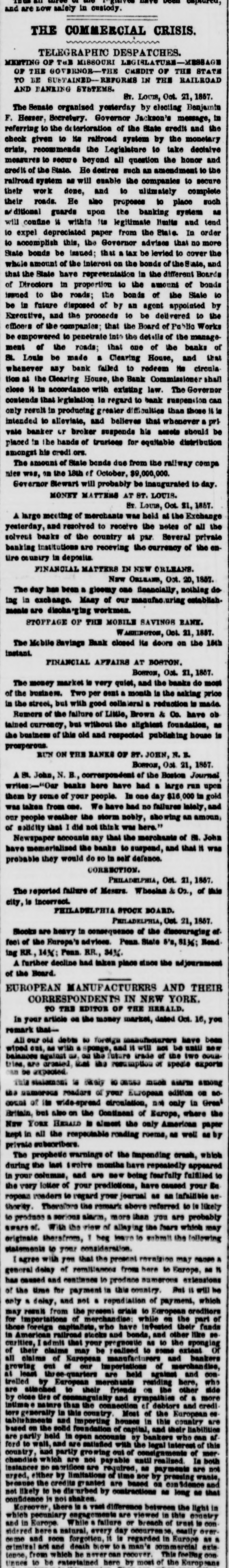 100 THE DOGIN capaurea, and are LOW safety in custody THE COMMERCIAL CRISIS. TELEGRAPHIC DESPATCHES. MENTING OF TaB MISSOURI LEGISLATURE MESSAGE OF THE GOVERNOR-THE CREDIT OF THE STATE TO BE SUSTAINED-REFORMS IN THE RAILROAD AND PANKING SYSTEMS. Sr. LOUIS, Oct. 21,1857. The Senate organized yesterday by electing Benjamta F. Heaser, Secretary. Governor Jackson's message, in referring to the deterioration of the State credit and the check given to its rattroad system by the monetary crisis, recommends the Legislature to take decisive measures to seowe beyond all question the honor and credit of the State He desires such an amendment to the railroad system as will enable the companies to secure their work done, and to ultimately complete their roads. He also proposes to place such ditional guards upon the banking system as will confine is withia its legitimate limits and tend to expel depreciated paper from the State In order to accomplish this, the Governor advises that no more State bonds be issued; that tax be levied to cover the whole amount of the interest on the bonds of the State, and that the State have representation in the different Boards of Directors in proportion to the amount of bonds issued to the roads: the bonds of the State to be in future disposed of by an agent appointed by Executive, and the proceeds to be delivered to the officers of the companies: that the Board of Pablic Works be empowered to penetrate into the details of the manage ment of the roads: that one of the banks of St. Louis be made a Clearing House, and that whenever any bank failed to redeem He circuia tion at the Clearing House, the Bank Commissioner shall close 14 in accordance with existing law. The Governor contends that legislation is regard to bank suspension can only result in producing greater difficulties than those it is intended to alleviate, and believes that whenever a pri vate banker OF broker suspends his assets should be placed in the hands of trustees for equitable distribution amongst his crediors. The amount of State bends due from the railway compa nice was, on the 18th of October. $9,000,000. Governor Stewart will probably be inaugurated to day MONEY MATTEMS AT ST. LOUIS. Sr. A large meeting of merchants was held at Exchange yesterday, and resolved to receive the notes of all the solvent banks of the country at par Several private banking institutions are receving the currency of the en tire country in deposits FINANCIAL MATTERS IN NEW ORLEANS. New ORLEANS, Ox. 20, 1887. The day has been a gloomy one financially, nothing do ing in exchange. Many of our masufno.uring establishments are discharging workmen. STOPPAGE OF THE MOBILE SAVINGS BANK. w ARHINGTON, Oct. 21, 1857 The Mobile Savings Bank closed its doors on the 16th instant. FINANCIAL AFFAIRS AT BORTON. Oct. 21,1867. BOSTON, The money market to very quiet, and the banks do most of the business. Two per sent month is the making price in the street, but with good collateral reduction is made Rumers of the failure of Little, Brown & Co. have ob tained currency, but without the slightest foundation, as the business of this old and respected publish ing house is prosperous. RUN ON THE BANKS OF BT.JOHN,N.B. Boston, ON 21, 1867. A SL John, N.B. correspondent of the Boston Journal writes banks here have had a large run upen them by some of your people. Is one day $16,000 im gold was taken from one. We have had no failures lately, and our people weather the nobly, showing an amoun of solidity that did was here." Newspaper accounts say that the merchants of as John have memerialised the banks to suspend, and that it was probable they would do to in self defence. CORRECTION. PHILADELPHIA, Oct. 21,1857. The reported failure of Mesers. Wheelan & O2., of Male city, is incorrect PHILADELPHIA STOCK BOARD. PHILADELPHIA, 1,1857 Blooks are heavy to sequence of the discouraging ef feel Penn State 8's, 81% Read A further decline had taken place since the adjournment of the Board EUROPEAN MANUFACTURERS AND THEIR CORRESPONDENTS IN NEW YORK. TO THE EDITOR OF THE HERALD. in your article on the money market, dated Oct. 16, you remark that All our old debta to foreign - have been with sponge, and 11 will not be antil sew balances against a as the future trade of the two oous tries,are Granted that the resumption or speale exports expected statement. is alamy asses much starts among the sumerous readars of your European edition on so count of its wide-spread circulation, an only in Great Britain but also the Continent of Europe, where the New York HERALD is almost the only American paper kept in all the respectable roading rooms, as well as by privale amberribers The prophetic warnings or the Impending crash, which during the last swolve months have repeatedly appeared in columns, and are new being fearfully falfilled to very letter of your predictions, have caused your Ba ropean readers regard journal as an infailable se thority. Therefore above referred to likely to produce a serious than you are probably ewere With alleying the fears which may originate therefrom, beg leave to submit the following statements to your consideration agree with yes that present revension may general delay of remittannes from here to Earope, has caused and continues to produce numerous extensions of the time for payment this country Ant is will be only . delay, and not . repudiation of payment, which may result from the present oriein to European creditors for importations of while part of funds those foreign capitaliete. have infested their American railroad bonds and other like se the that admit certies, of and Karapeas all of their claims claims may realised extent sponging of bankers our of Browing merchandise. least at held are con against and three-quarters Earonnan trelled who residing here, by are friends side their other of close ties more than nature credit and debtors is Most re generally European 00 tablishments this are country based partly held of their liabilit