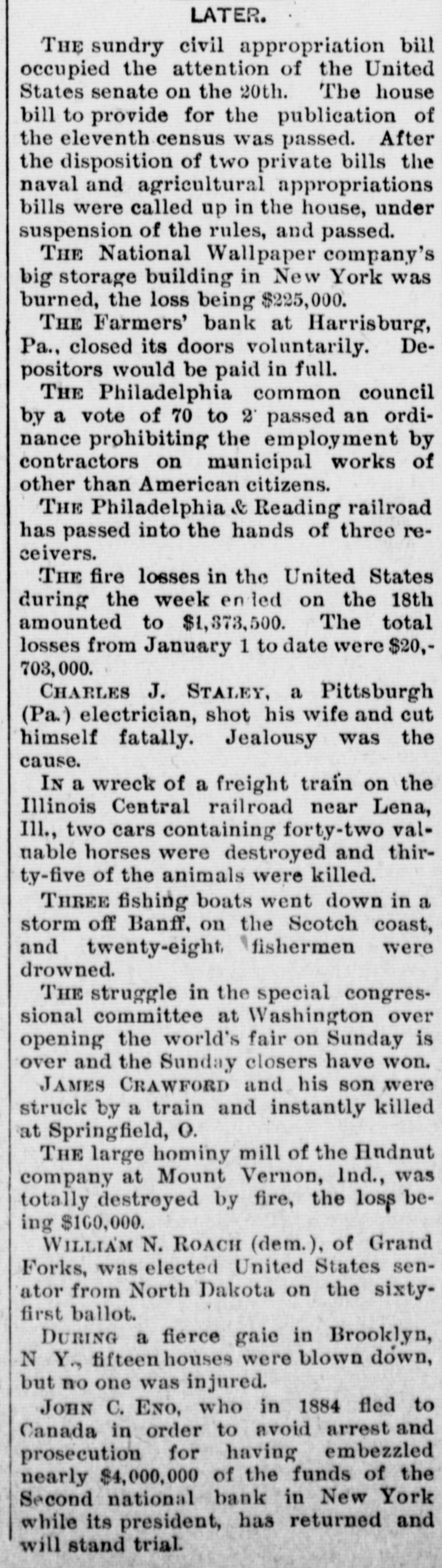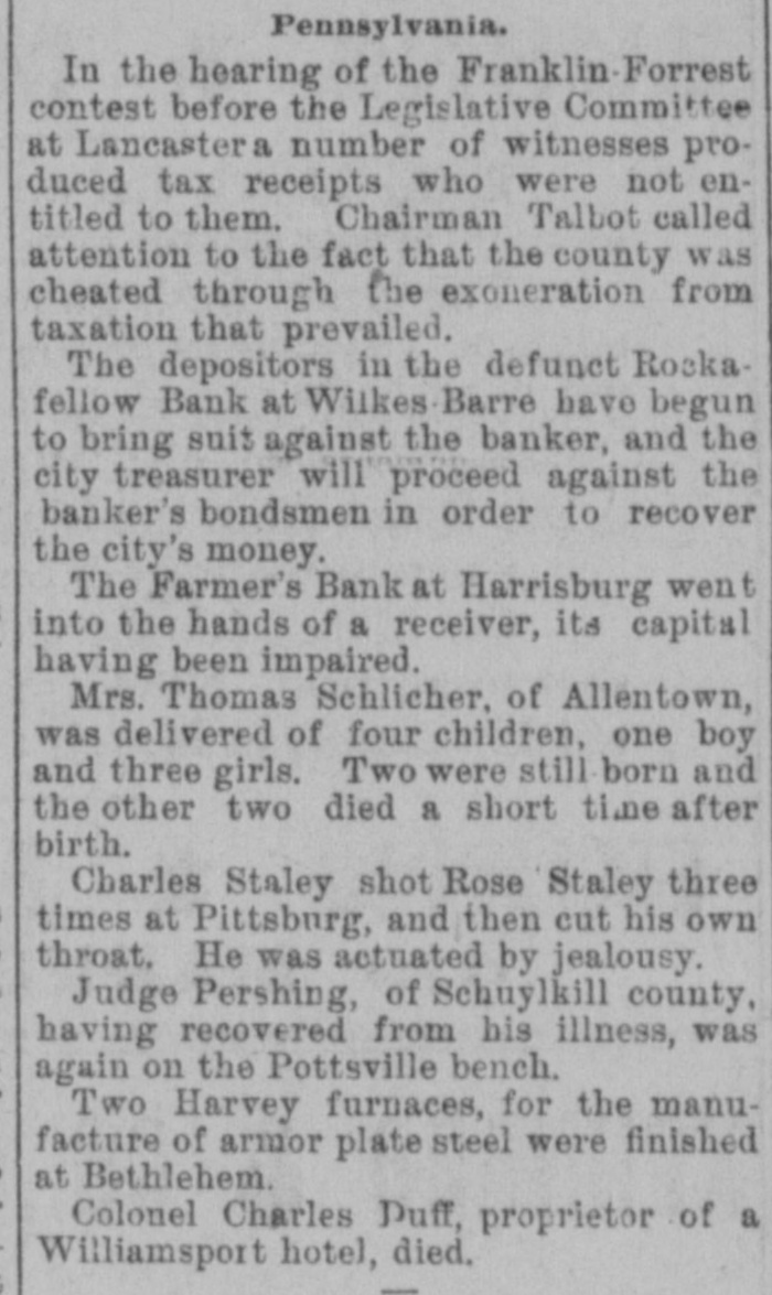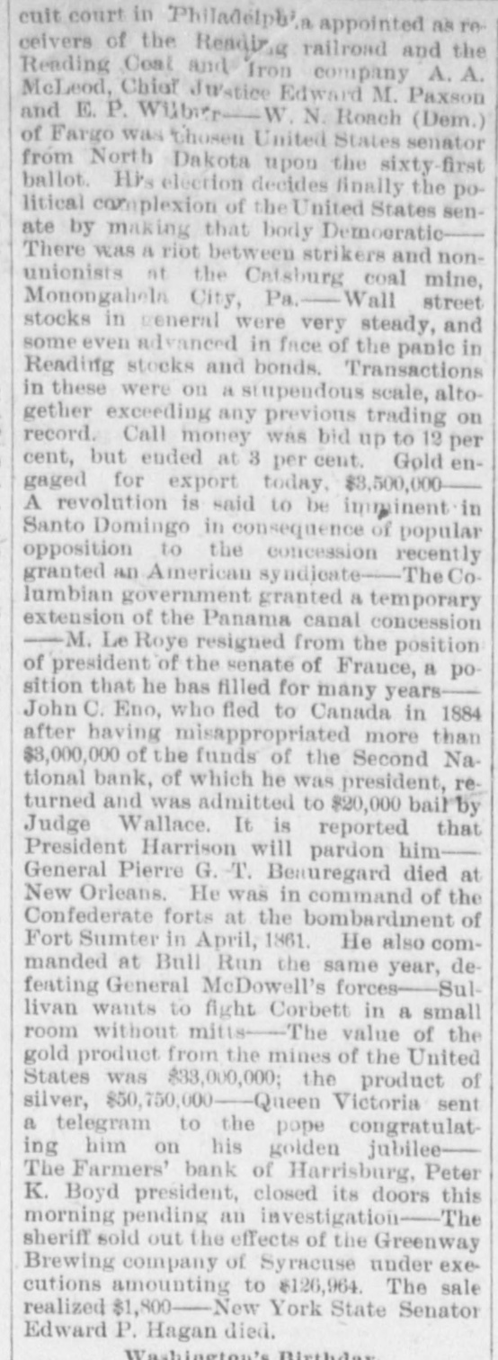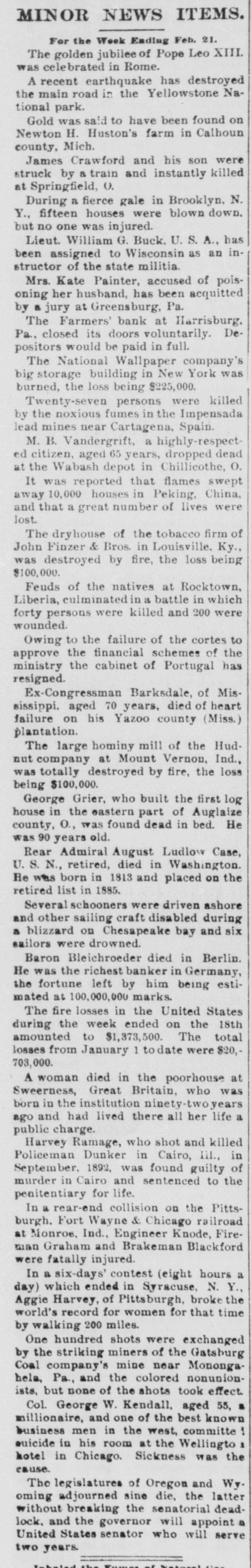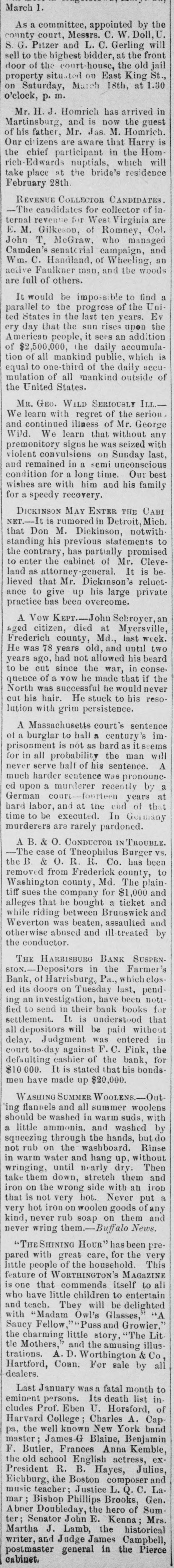 county court, Messrs. S. G. Pitzer and L. C. Gerling will sell to the highest bidder, at the front door of the court-house, the old jail property situated on East King St. on Saturday, March 18th, at 1.30 o'clock, p. m. Mr. H. J. Homrich has arrived in Martinsburg, and is now the guest of his father, Mr. Jas. M. Homrich. Our citizens are aware that Harry is the chief participant in the Homrich-Edwards nuptials, which will take place at the bride's residence February 28th. REVENUE COLLECTOR CANDIDATES. The candidates for collector of ternal revenue for West Virginia are E. M. Gilkeson, of Romney, Col. John T. McGraw. who managed Camden's senatoria campaign, and Wm. C. Handland, of Wheeling, an active Faulkner man, and the woods are full of others. It would be impossible to find a parallel to the progress of the United States in the last ten years. Ev ery day that the sun rises upon the American people, it sees an addition of $2,500,000, the daily accumulation of all mankind public, which is equal to one-third of the daily accumulation of all mankind outside of the United States. MR. GEO. WILD SERIOUSLY ILL.We learn with regret of the seriou. and continued illness of Mr. George Wild. We learn that without any premonitory signs he was seized with violent convulsions on Sunday last, and remained in a semi unconscious condition for a long time. Our best wishes are with him and his family for a speedy recovery. DICKINSON MAY ENTER THE CABI is rumored in that Don M. NET.-It Dickinson, Detroit, notwith Mich. standing his previous statements to the contrary, has partially promised to enter the cabinet of Mr. Cleveland as attorney-general. It is believed that Mr. Dickinson's reluctance to give up his large private practice has been overcome. A Vow KEPT. John Sebroyer, aged citizen, died at Myersville, Frederich county, Md., last week. He was 78 years old, and until two years ago, had not allowed his beard to be cut since the war, in consequence of a VOW he made that if the North was successful he would never cut his hair. He stuck to his resolution with grim persistence. A Massachusetts court's sentence of a burglar to half a century's imprisonment is not as hard as it seems will all probability the man serve half of his never for in sentence. A much harder sentence was pronounc. ed a murderer recently by a court-fourteen years labor, and at the end German hard upon In Germany of that at time to be executed. murderers are rarely pardoned. A B. & O. CONDUCTOR IN TROUBLE. The case of Theophilus Burger vs the B. & O. R. R. Co. has been removed from Frederick county, to Washington county, Md. The plaintiff sues the company for $1,000 and alleges that he bought a ticket and and while riding between Brunswick Weverton was beaten, assaulted and otherwise abused and ill-treated by the conductor. THE HARRISBURG BANK SUSPENDepositors in the Farmer's of Harrisburg, Pa., on Tuesday ed Bank, its doors last. which clos been pend- notian investigation, have for fied ing to send in their bank books settlement. It is understood that all depositors will be paid without in Judgment was entered the delay. court to day against F. C. Fink, for defaulting cashier of the bank, bonds $10000. It is stated that his men have made up $20,000. WASHING SUMMER WOOLENS.-Out- woolens flannels and all summer with `ing should be washed in warm suds, by little ammonia. and washed a squeezing through the hands, but Rinse do rub on the washboard. without not warm water and hang up, Then in wringing, until nearly dry. them and take them down, stretch iron iron on the wrong side with an a that is not very hot. Never of put hot iron on woolen goods any and very never rub soap on them News. kind, never wring them.- Buffalo "The SHINING HOUR" has been prewith great care, for the very This pared people of the household. little feature of WORTHINGTON'S MAGaZINE to all one that commends itself entertain have little children to delighted who teach. They will be "A and "Madam Owl's Glasses," with Fellow, Puss and Growier,' Lit. Saucy the charming little story, "The illusMothers," and the amusing Co. tle trations. A. D. Worthington all dealers. Hartford, Conn. For sale by Last January was a fatal month list in- to persons. Its death of eminent Prof. Eben U. Horsford, cludes Harvard College; Charles York A. band Capwell known New pa, the James G Blaine, Benjamin Kemble, master; Butler, Frances Anna exthe old F. school English actress, Julios, President R. B. Hayes, and Eichburg, the Boston composer teacher; Justice L. Q.C. Gen. Lamusic Bishop Phillips Brooks, Summar Doubleday, the hero of Mrs. Abner Senator John E. Kenna; historical ter; Martha J. Lamb, the Campbell, cabinet, postmaster writer, and Judge general James in the Pierce