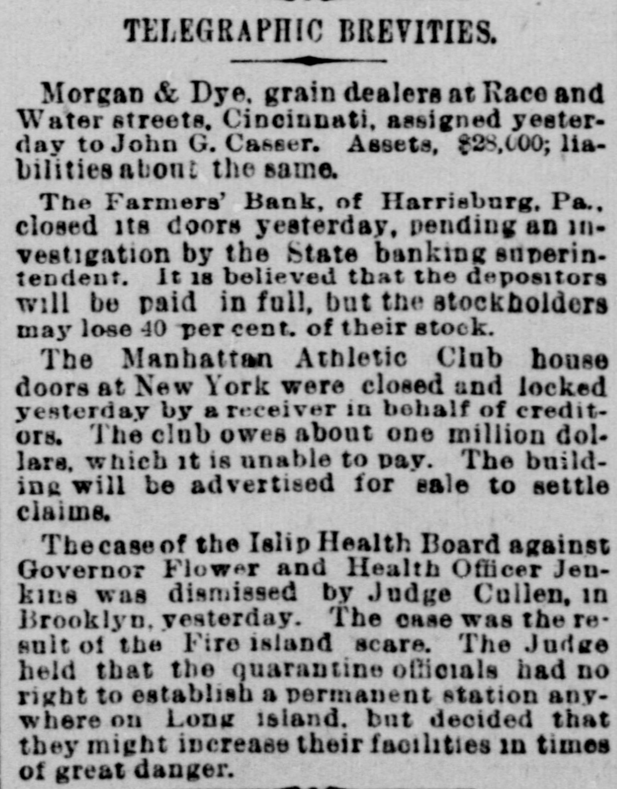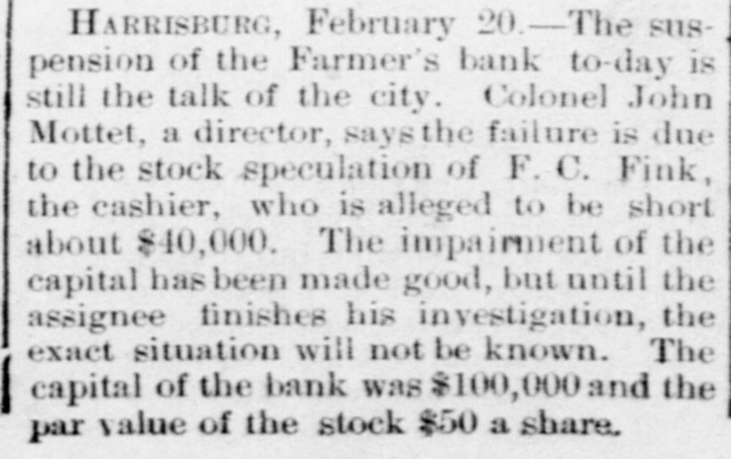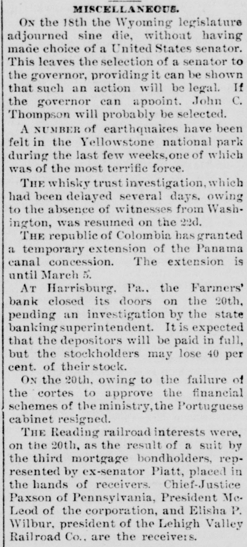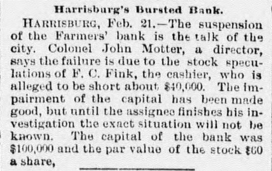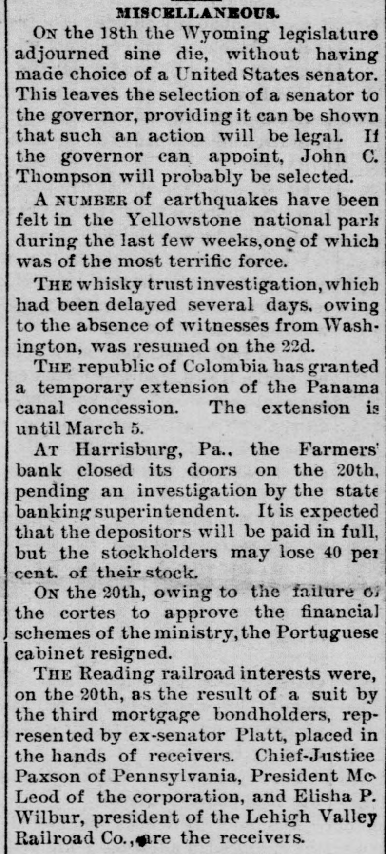 county court, Messrs. S. G. Pitzer and L. C. Gerling will sell to the highest bidder, at the front door of the court-house, the old jail property situated on East King St. on Saturday, March 18th, at 1.30 o'clock, p. m. Mr. H. J. Homrich has arrived in Martinsburg, and is now the guest of his father, Mr. Jas. M. Homrich. Our citizens are aware that Harry is the chief participant in the Homrich-Edwards nuptials, which will take place at the bride's residence February 28th. REVENUE COLLECTOR CANDIDATES. The candidates for collector of ternal revenue for West Virginia are E. M. Gilkeson, of Romney, Col. John T. McGraw. who managed Camden's senatoria campaign, and Wm. C. Handland, of Wheeling, an active Faulkner man, and the woods are full of others. It would be impossible to find a parallel to the progress of the United States in the last ten years. Ev ery day that the sun rises upon the American people, it sees an addition of $2,500,000, the daily accumulation of all mankind public, which is equal to one-third of the daily accumulation of all mankind outside of the United States. MR. GEO. WILD SERIOUSLY ILL.We learn with regret of the seriou. and continued illness of Mr. George Wild. We learn that without any premonitory signs he was seized with violent convulsions on Sunday last, and remained in a semi unconscious condition for a long time. Our best wishes are with him and his family for a speedy recovery. DICKINSON MAY ENTER THE CABI is rumored in that Don M. NET.-It Dickinson, Detroit, notwith Mich. standing his previous statements to the contrary, has partially promised to enter the cabinet of Mr. Cleveland as attorney-general. It is believed that Mr. Dickinson's reluctance to give up his large private practice has been overcome. A Vow KEPT. John Sebroyer, aged citizen, died at Myersville, Frederich county, Md., last week. He was 78 years old, and until two years ago, had not allowed his beard to be cut since the war, in consequence of a VOW he made that if the North was successful he would never cut his hair. He stuck to his resolution with grim persistence. A Massachusetts court's sentence of a burglar to half a century's imprisonment is not as hard as it seems will all probability the man serve half of his never for in sentence. A much harder sentence was pronounc. ed a murderer recently by a court-fourteen years labor, and at the end German hard upon In Germany of that at time to be executed. murderers are rarely pardoned. A B. & O. CONDUCTOR IN TROUBLE. The case of Theophilus Burger vs the B. & O. R. R. Co. has been removed from Frederick county, to Washington county, Md. The plaintiff sues the company for $1,000 and alleges that he bought a ticket and and while riding between Brunswick Weverton was beaten, assaulted and otherwise abused and ill-treated by the conductor. THE HARRISBURG BANK SUSPENDepositors in the Farmer's of Harrisburg, Pa., on Tuesday ed Bank, its doors last. which clos been pend- notian investigation, have for fied ing to send in their bank books settlement. It is understood that all depositors will be paid without in Judgment was entered the delay. court to day against F. C. Fink, for defaulting cashier of the bank, bonds $10000. It is stated that his men have made up $20,000. WASHING SUMMER WOOLENS.-Out- woolens flannels and all summer with `ing should be washed in warm suds, by little ammonia. and washed a squeezing through the hands, but Rinse do rub on the washboard. without not warm water and hang up, Then in wringing, until nearly dry. them and take them down, stretch iron iron on the wrong side with an a that is not very hot. Never of put hot iron on woolen goods any and very never rub soap on them News. kind, never wring them.- Buffalo "The SHINING HOUR" has been prewith great care, for the very This pared people of the household. little feature of WORTHINGTON'S MAGaZINE to all one that commends itself entertain have little children to delighted who teach. They will be "A and "Madam Owl's Glasses," with Fellow, Puss and Growier,' Lit. Saucy the charming little story, "The illusMothers," and the amusing Co. tle trations. A. D. Worthington all dealers. Hartford, Conn. For sale by Last January was a fatal month list in- to persons. Its death of eminent Prof. Eben U. Horsford, cludes Harvard College; Charles York A. band Capwell known New pa, the James G Blaine, Benjamin Kemble, master; Butler, Frances Anna exthe old F. school English actress, Julios, President R. B. Hayes, and Eichburg, the Boston composer teacher; Justice L. Q.C. Gen. Lamusic Bishop Phillips Brooks, Summar Doubleday, the hero of Mrs. Abner Senator John E. Kenna; historical ter; Martha J. Lamb, the Campbell, cabinet, postmaster writer, and Judge general James in the Pierce