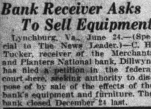 Dillwyn Sunday Schools Have Excellent Attendance.- Bank Receivers at Work DILLWYN, Va., Jan. 20.-Both the Baptist and Methodist Sunday schools here had a record attendance last Sunday. The schools are well organized and are doing work that would be creditable to much larger churches. J. B. Wall, of Farmville, was host at dinner Wednesday to the division superintendent and principals of the county high schools. It was regretted that Supt. James and Principal Robertson, of the Arvonia school. could not be present. Mrs. Eubelia Silvey of Richmond. and Mrs. W. R. Silvey of New York, were recent guests of relatives here. Marshall Claiborne, Jr., of the University of Virginia, spent the week end with his parents, Mr. and Mrs. M. P. Claiborne. Mr. and Mrs. Winker. of Charlottesville. visited Mr. and Mrs. Herman Price Sunday. Mrs. T. J. Davis, who has been ill. is improving C. M. Marks, of Richmond, was here last week. Mr. Tucker, of South Boston. recently appointed receiver of the Merchants and Planters National bank here. is adjusting the affairs of the institution efficiently. P. W Wilson visited friends here last Sunday. Mr. and Mrs. W. M. Nuckols spent Tuesday with their son Marshall. a member of the Farmville company. in Danville Mrs. C. Garnett visited Miss Liflian Gilliam recently, Dr. R. E. Hanmer spent the week end in Farmville. Tom Turner. of Diana Mills. visited friends here recently. Mr. and Mrs. W. L. Hayes are welcomed to the community. The former is manager of the White Front market here. Mrs. C. R. Wood and Mrs. A. L. Smith were in Farmville this week.