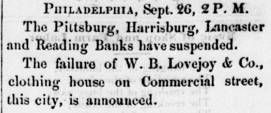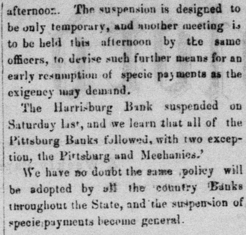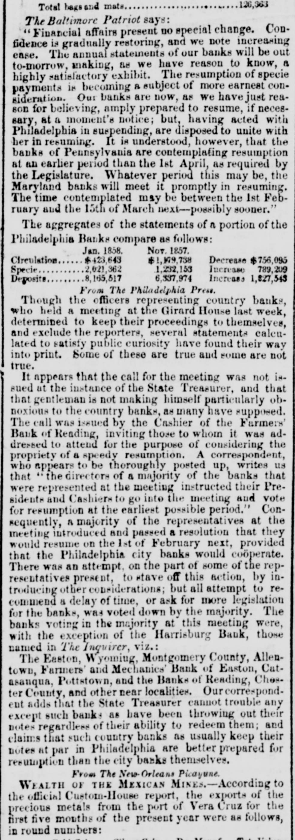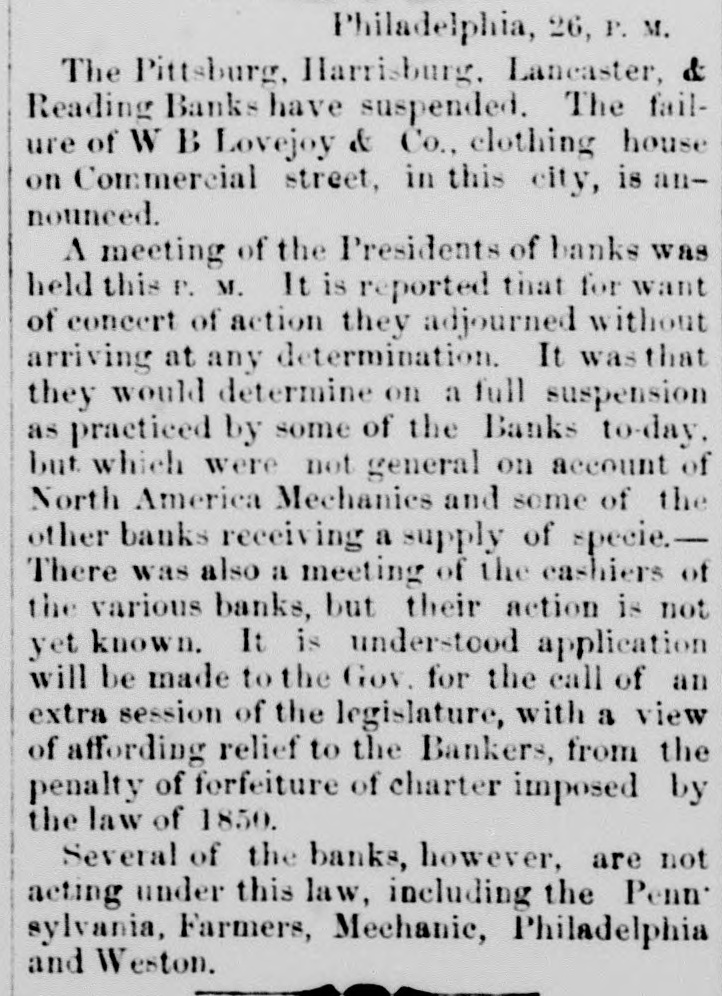 LATEST NEWS. THE RECEIVED BY MAGNETIC TELEGRAPH BANK DIFFICULTIES. THE BANKS OF PHILADELPHIA, PHILADELPHIA, Saturday, Sept. 26, 1857. Third and Chestnut streets are again the scene of excitement. Crowds surrounded the Savings Institutions before 9 o'clock 8. m. out two banks deposits, requiring weeks' They notice. decline The paying were besieged before 10 o'clock. The Pennsylvania Bank reopened, and is transacting business, but paying LO specie. The Mechanics' Bank is paying specie for tens. The Girard Bank has come to terms partially, re. deeming fives with specie, but refusing to honor the checks of depositors. Most of the other banks are marking checks good. There is no concert of action among the Banks each is apparently taking a different course. The Bank of North America is paying specie for tens, but issuing no notes on checks. The Bank of Commerce is refusing specie, but is paying out notes for checks. The following banks are paying specie for 5a: Commercial, Manufacturers and Mechanics', and PhiladelThe Farmers and pay The Northern Liberties pay specie phia. 10s. Mechanics' and Western specie for for bills in cases of necessity. The Bank of Penn Township, and the City Consolidation Bank pag nothing. All banks, however, except the Girard, certify checks. The Girard has entirely suspended business. Some of the banke will receive no deposits. 11:15--a. m. The Girard Bank is now paying specie for fives and certifying checks. The Tradesman's Bank pays everything, checks and all. The Bank of North America is paying all its notes. It received specie from New-York last night, and represents that it has more in its vaults than its amount of bills. It is certifying checks. The Board of Brokers passed a resolution this morning to the effect that all settlements in the purchase of stocks may be made by certified checks on any of the city banks current on the day of settlement. The Southwark Bank pays specie for all its bills. The Bank of Kensington pays for fives only. The Pittsburgh, Harrisburg, Lancaster and Reading banks have suspended. 7 p. m. A meeting of the presidents of the banks was hold this afternoon, and it is reported that a for want of concert of action they adjourned without arriving at any determination. It was thought they would determine on a full suspension, as practiced by some of the banks to-day, but which was not general on account of the North America, Mechanics', and some of the other banks receiving a supply of specie. There was also a meeting of the cashiers of the vs. rious banks, but their action is not yet known. 19 p. m. The bank presidents met to-night. They had & conference with the Governor, and asked him to call a special session of the Legislature for October 6, withthe view of affording relief to the banks from the penalty of forfeiture of charter imposed by the law of 1850. Several of the banks, however, as not acting under this law, including the Pennsylvania, Farmers' and Mechanics', Philadelphia and Western. The Governor expresses a desire to consult Attorney-General Franklin, who is not in town. No doubt the proclamation calling an extra session will be issued on Monday morning. PHILADELPHIA, Sept.27,1857. It is understood that the Governor has determined upon calling a special session of the legislature, to as semble on the first Tuesday in October. The prociamation will be issued to-morrow.