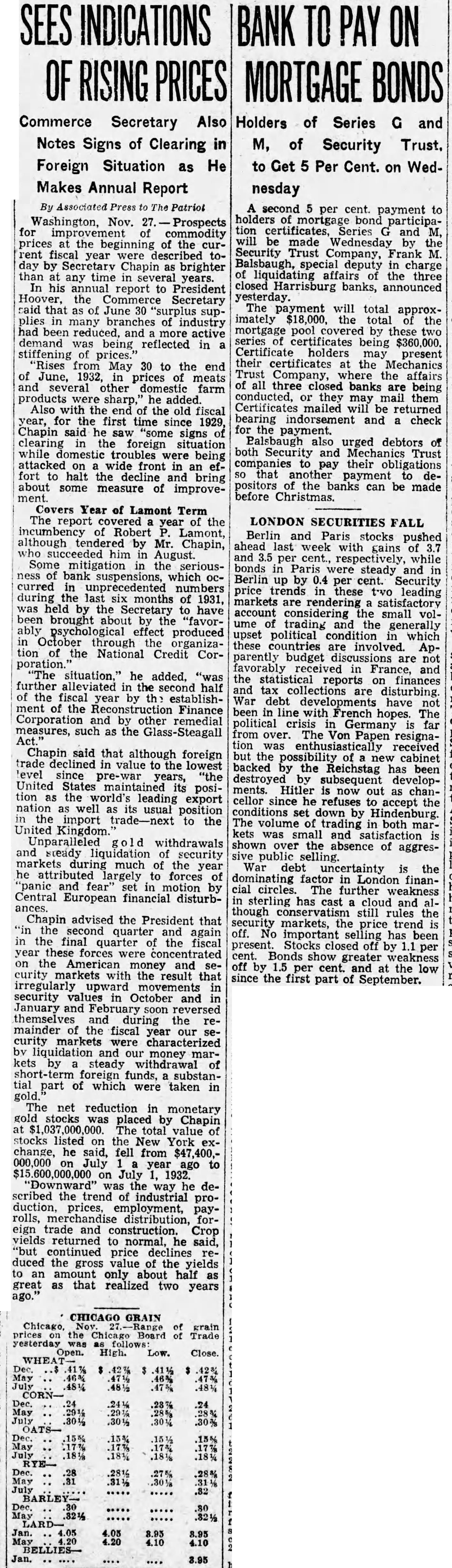 SEES INDICATIONS BANK PAY ON OF RISING PRICES MORTGAGE BONDS Commerce Secretary Also Notes Signs of Clearing in Foreign Situation as He Makes Annual Report By Associated Press The Patriot Washington, Nov. Prospects for of commodity prices at the beginning of the current fiscal year escribed today by Secretary Chapin as brighter than at any time years. In his annual report to President Hoover, the Commerce Secretary caid that as of June 30 "surplus supplies in many of industry had been reduced, and more active demand being reflected in stiffening of prices.' Rises from May 30 to the end of June, 1932, in prices of meats and other domestic farm he added. Also the the old fiscal year, for the first time since 1929, Chapin said he "some signs of clearing the foreign situation while domestic troubles were being attacked on wide front in an fort to halt the decline and bring about some measure of improvement. Year of Lamont Term The report covered year of the Robert Lamont, although tendered by Mr. Chapin, licceeded in August. Some mitigation in seriousness of bank suspensions, which OCcurred in unprecedented numbers during the last six months of 1931, was held by the Secretary to have been brought about by the 'favorably psychological effect produced in October through organiza tion of the National Credit Corporation. "The situation," he added. "was further alleviated in the second half of the fiscal year by th establishment of the Finance Corporation and by other remedial measures, such as the Glass Steagall Chapin said that although foreign trade declined in value to the lowest since pre-war years, "the United States maintained its position as the world's leading export nation as well as its usual position in the import trade-next to the United Kingdom Unparalleled d withdrawals and steady of security during much of the year he attributed largely to forces of "panic fear' in motion by Central European financial disturbChapin advised the President that "in the second quarter and again in the final quarter of the fiscal year these forces concentrated on American money and security the result that movements security values in October and January and themselv and the remainder of the fiscal year markets characterized by liquidation and our money markets by steady withdrawal of short-term foreign funds, substantial part of which were taken in The net reduction in monetary stocks placed by Chapin at value of stocks listed on the exchange, he said, fell from 400,000,000 July ago to 5.600,000,000 on July 1932. "Downward" he described the trend of industrial production, prices, employment, payrolls, distribution, foreign trade construction. Crop vields returned to normal, he said, "but continued price declines reduced the gross value of the yields to amount only about half as great as that realized two years ago. Holders of Series G and M, of Security Trust, to Get 5 Per Cent. on Wednesday A second 5 per cent. payment to holders bond participacertificates, Series and M, be made Wednesday by the Security Trust Company, Frank M. Balsbaugh, special deputy in charge of liquidating affairs of the three closed Harrisburg banks, announced yesterday. The payment will total approximately $18,000, total of the mortgage pool covered by these two series of certificates being $360,000. Certificate holders may present their certificates at the Mechanics Trust Company, the affairs of all three closed banks are being conducted, they mail them Certificates mailed be returned bearing indorsement and a check for the payment. Palsbaugh also urged debtors of both Security and Mechanics Trust companies pay their obligations so that another payment to depositors the banks can be made before Christmas. LONDON SECURITIES FALL Berlin and Paris stocks pushed ahead last week with gains of 3.7 and 3.5 cent., respectively, while bonds in were steady and Berlin up by 0.4 per Security price trends in these two leading markets are satisfactory account considering the small volume of trading generally upset political condition in which these countries are involved. Apparently budget are not favorably received in France, and the statistical reports on finances and tax collections disturbing. War debt developments have been line French hopes. The political crisis in Germany from over. The Von Papen resignation enthusiastic received but the possibility of cabinet backed by the Reichstag has been destroyed subsequent ments. Hitler is now out as chancellor since he refuses to accept the conditions set down by Hindenburg. The volume of trading in both markets was small and satisfaction is shown over the absence of aggressive public selling. uncertainty is the dominating in financial circles. The further weakness in sterling has cast and though conservatism rules the security markets, the price off. No important has been present. Stocks closed by per cent. Bonds greater weakness off by 1.5 per cent. and at the low since the first part of September. CHICAGO GRAIN Chicago grain the Board of Trade yesterday High. Low. WHEA May CORN15% May .82 BARLEY 3.95