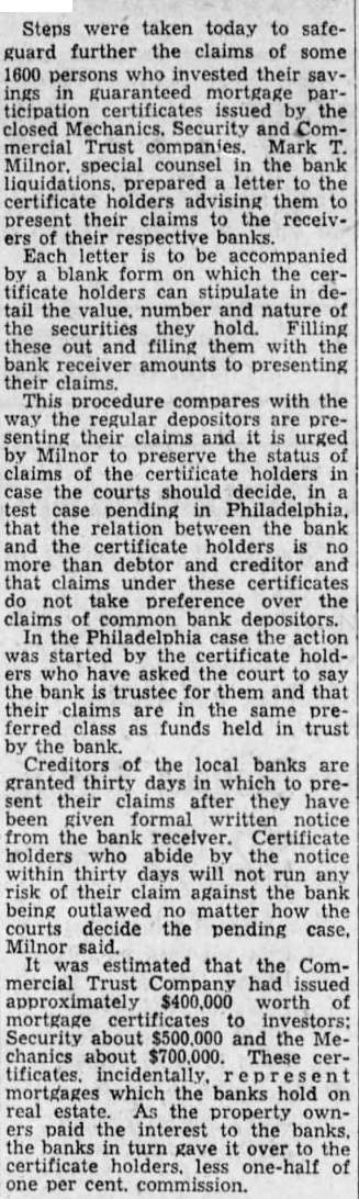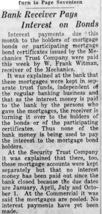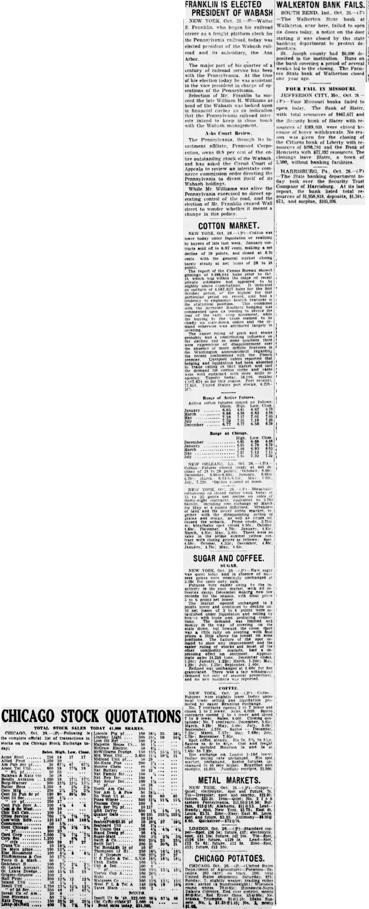 FRANKLIN IS ELECTED PRESIDENT OF WABASH NEW YORK Oct. S. his railroad career as platform for of the and its The major part of railroad service been the vania. time his election the vice of of ceed H. as the upon in Ivania intend close with Review Court 48.8 of the and has asked the Circuit Court als review interstate com order directing While was the Ivania of of Mr. caused Wall wonder = a street to change COTTON MARKET. was today under realizing buyers of late last January contracts to with general closing hedging and stocks Futures. cotton futures January December Range at SUGAR AND COFFEE. NEW YORK and METAL MARKETS. CHICAGO POTATOES. United WALKERTON BANK FAILS. BEND. Ind Oct Walkerten to open notice was closed by the state department protect Joseph county the Runs on period of several led to the closing The bank of Walkerton closed FOUR FAIL IN MISSOURI. Oct. open The Bank with total $467,677 and reclosed heavy withdra son closing bank of Liberty with sources of and the Bank with $77 192 The closings leave of without banking Pa., Oct 26 banking department totook over Security Trust Company of Harrisburg At its the bank listed total sources of deposits, 673, surplus, YORK